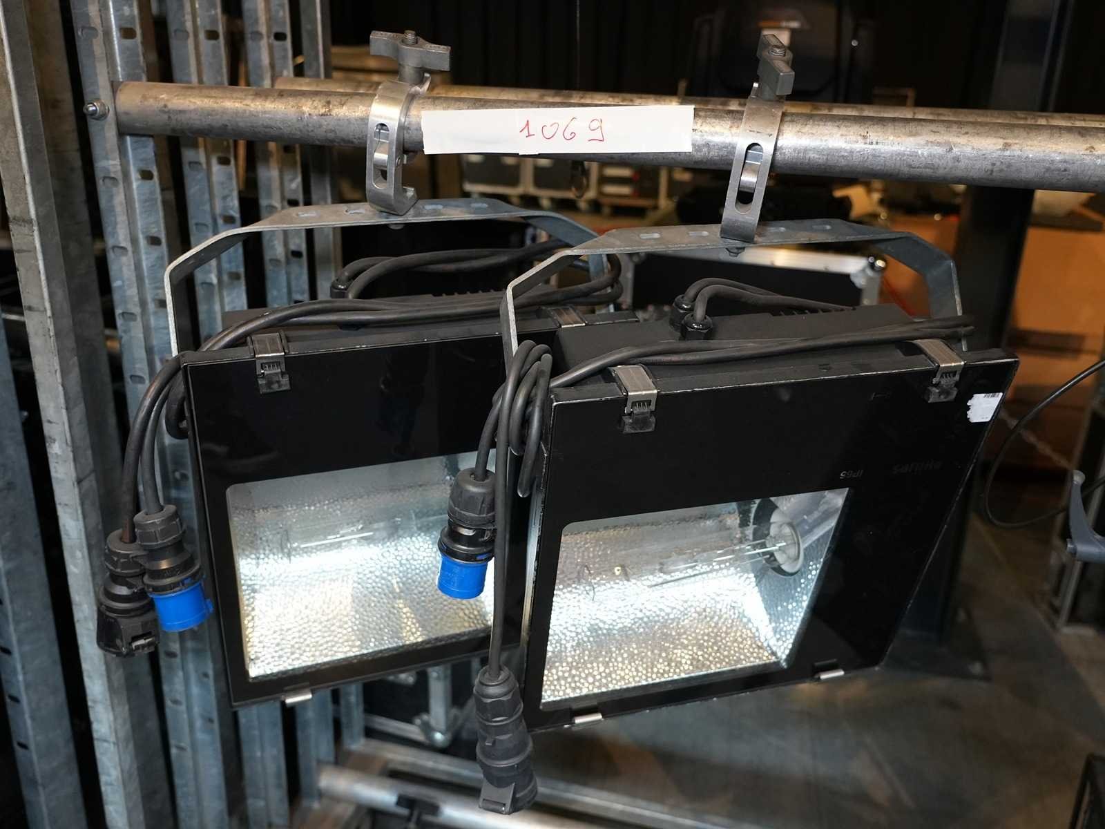 FLOODLIGHT – ASYMMETRIC HQI 400 TS (PHILIPS) – SET OF 2 PCS • Type: asymmetric floodlight • Quantity: set of 2 pcs (2 × HQI units) • Light source: HQI 400 W (single-ended) • Colour temperature: 4000 K • Power supply: 230 V AC – 50 Hz • Power consumption: 400 W • Starting current: 3.1 A max • Warm-up time: ~5 min • Hot restart time: ~10 min • Socket: E40 • Housing: die-cast aluminium, black finish • IP rating: IP65 (outdoor rated) • Dimensions: 450 × 465 × 170 mm • Included: set of 2 units No Merk: PHILIPS Eigen gewicht: 6.5kg
