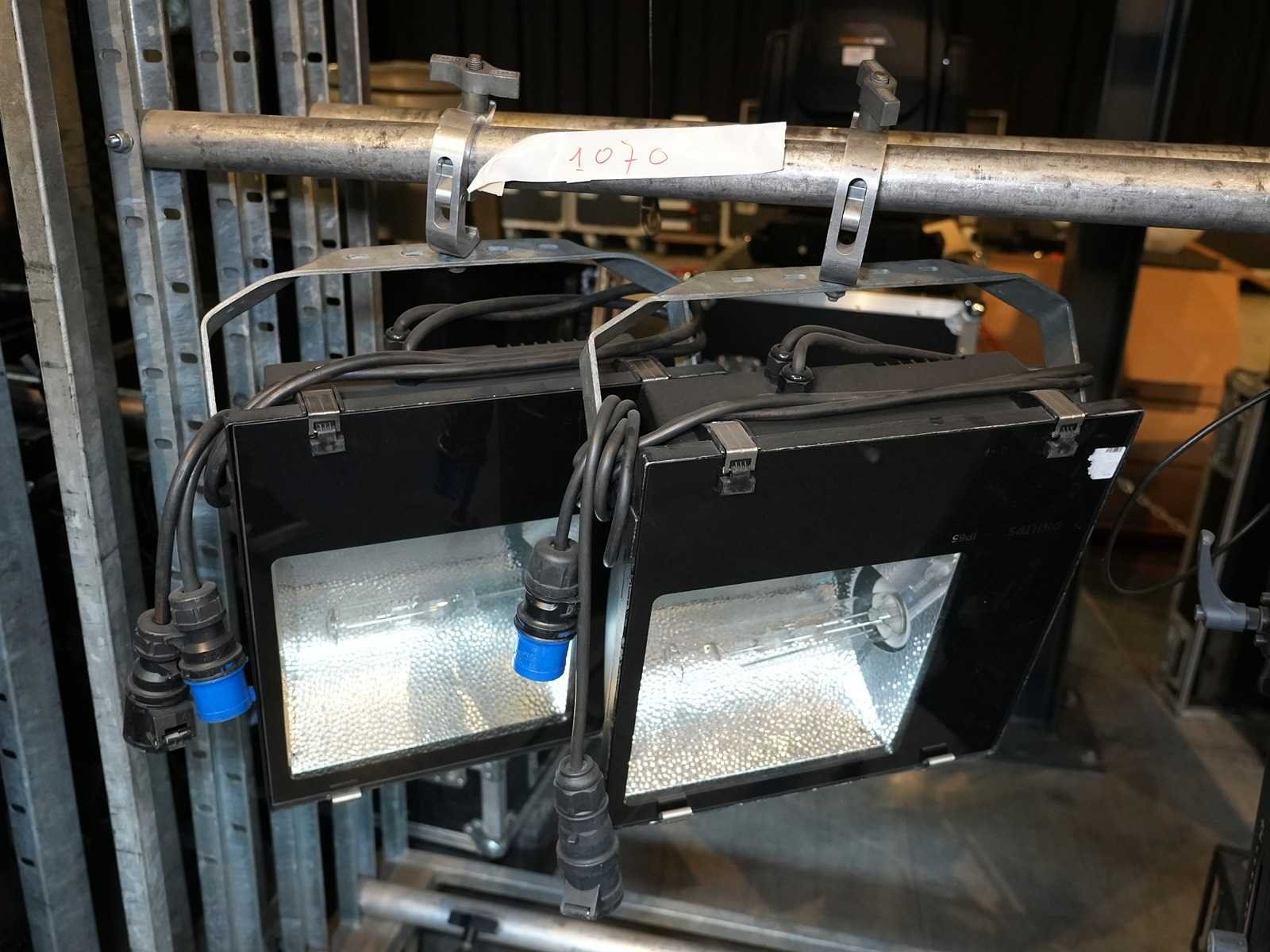 FLOODLIGHT – ASYMMETRIC HQI 400 TS (PHILIPS) – SET OF 2 PCS • Type: asymmetric floodlight • Quantity: set of 2 pcs (2 × HQI units) • Light source: HQI 400 W (single-ended) • Colour temperature: 4000 K • Power supply: 230 V AC – 50 Hz • Power consumption: 400 W • Starting current: 3.1 A max • Warm-up time: ~5 min • Hot restart time: ~10 min • Socket: E40 • Housing: die-cast aluminium, black finish • IP rating: IP65 (outdoor rated) • Dimensions: 450 × 465 × 170 mm • Included: set of 2 units No Merk: PHILIPS Eigen gewicht: 6.5kg