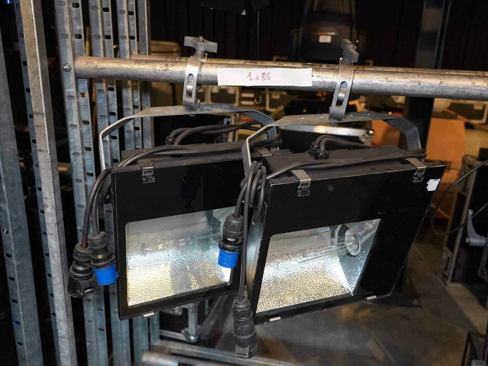 FLOODLIGHT – ASYMMETRIC HQI 400 TS (PHILIPS) – SET OF 2 PCS • Type: asymmetric floodlight • Quantity: set of 2 pcs (2 × HQI units) • Light source: HQI 400 W (single-ended) • Colour temperature: 4000 K • Power supply: 230 V AC – 50 Hz • Power consumption: 400 W • Starting current: 3.1 A max • Warm-up time: ~5 min • Hot restart time: ~10 min • Socket: E40 • Housing: die-cast aluminium, black finish • IP rating: IP65 (outdoor rated) • Dimensions: 450 × 465 × 170 mm • Included: set of 2 units No Merk: PHILIPS Eigen gewicht: 6.5kg