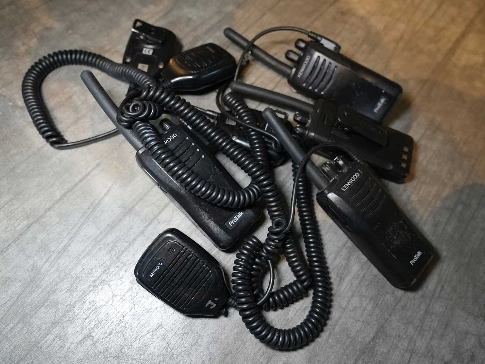 Kenwood set: 4× Kenwood 3501E 4× Kenwood KMC-450 microfoons 4× Opladers 1× Flightcase No Merk: KENWOOD