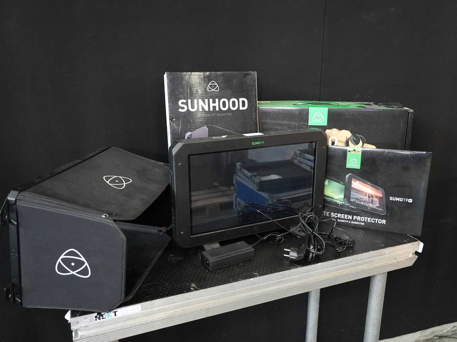 SUMO SET: 1X SUMO - 19 INCH PRODUCTION MONITOR/RECORDER - ATOMSUMO19 1X SUN HOOD - SCREEN TRAVEL COVER WITH MOUNT SCREWS-ATOM19SUN1 1X SCREEN PROTECTOR SUMO - SUMO SCREEN PROTECTOR - ATOMLCDP02 No Merk: ATOMOS Type: SUMO + HOOD + PROTECTOR