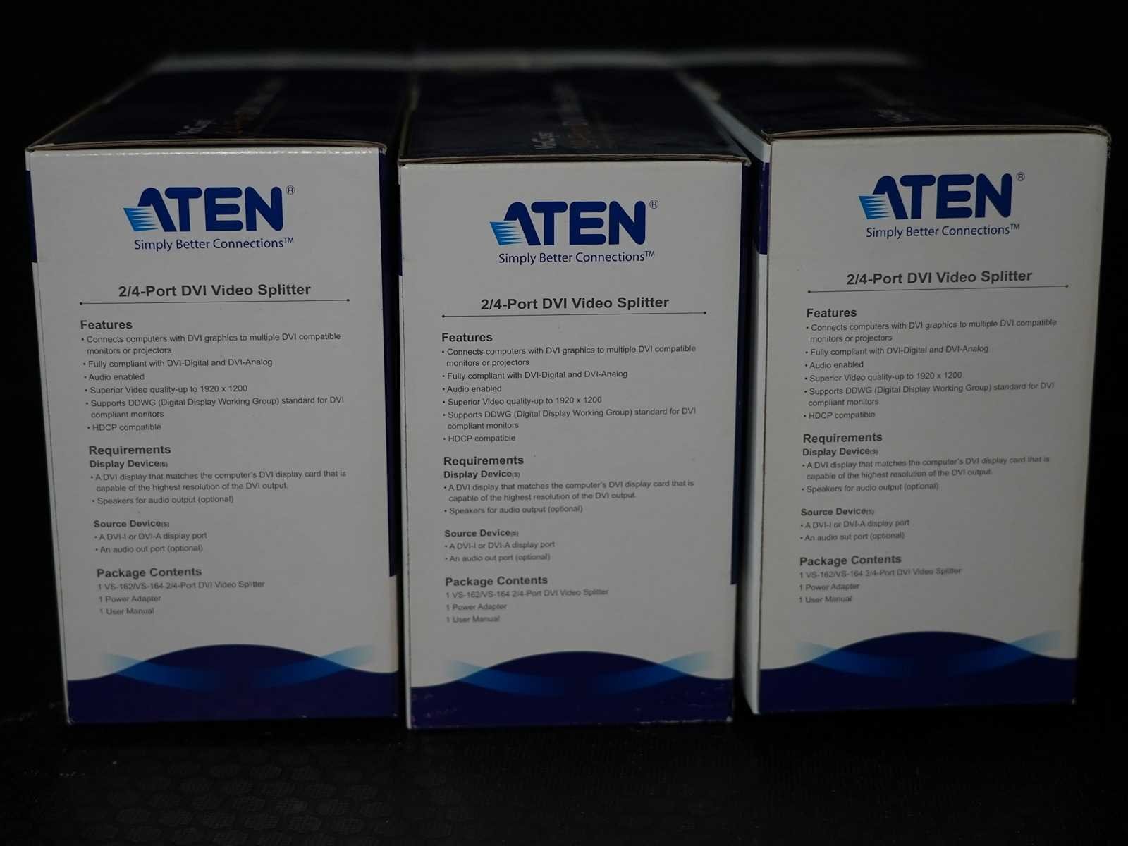 The ATEN VS162 is a 1-to-2 DVI/audio splitter, duplicating one DVI‑I signal to two outputs and supporting video up to 1920 × 1200 with mirrored stereo audio. No Merk: ATEN Type: DVI SPLITTER 1-2