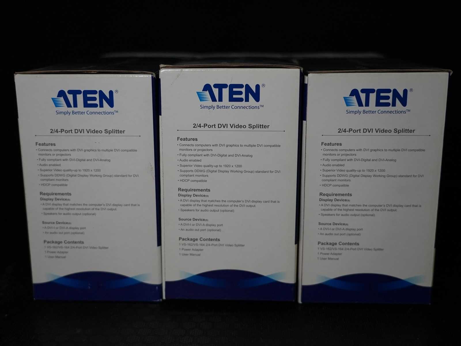The ATEN VS162 is a 1-to-2 DVI/audio splitter, duplicating one DVI‑I signal to two outputs and supporting video up to 1920 × 1200 with mirrored stereo audio. No Merk: ATEN Type: DVI SPLITTER 1-2