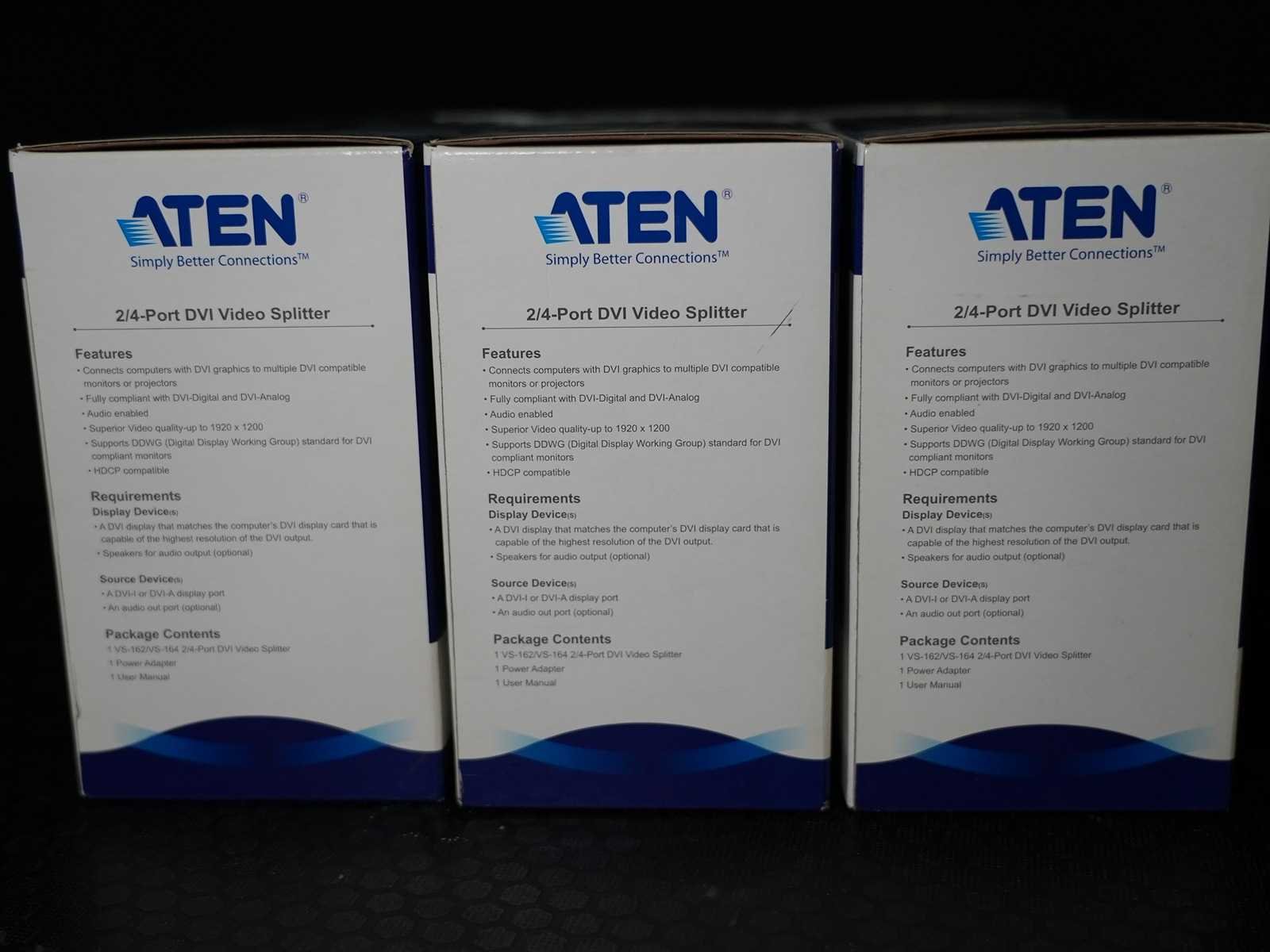 The ATEN VS162 is a 1-to-2 DVI/audio splitter, duplicating one DVI‑I signal to two outputs and supporting video up to 1920 × 1200 with mirrored stereo audio. No Merk: ATEN Type: DVI SPLITTER 1-2