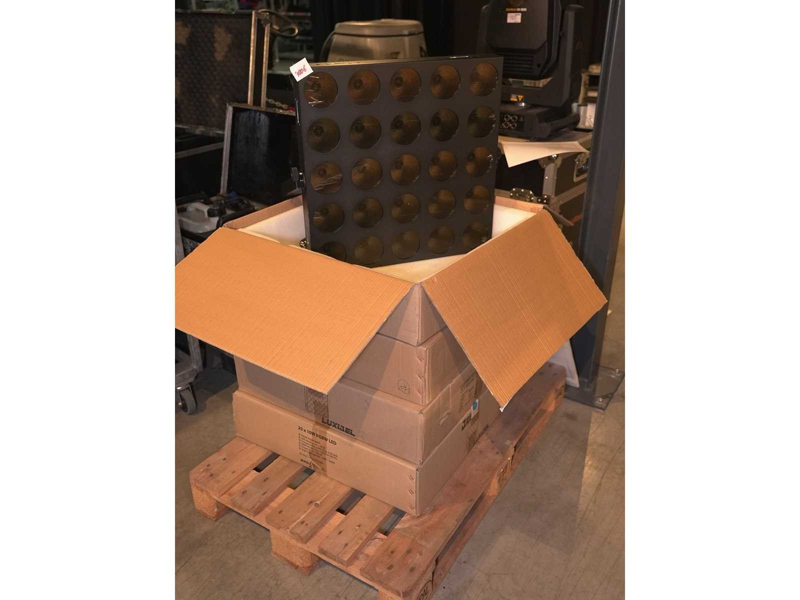 Luxibel - Set 4x Luxibel B25 a compact and highly adaptable matrix lighting unit engineered to create remarkable and unique visual experiences. This unit is equipped with 25x 10W RGB Amber Matrix LEDs, making it the first of its kind in the 5x5 matrix category to incorporate removable frost filters. The amber LED chips in the B 25 produce an exceptional glow, setting it apart from standard 'RGB only' units with its distinctive luminosity. The B 25 has been meticulously designed for maximum versatility. It can be flown, stacked, or positioned both horizontally and vertically, catering to a wide range of design needs. Its sleek profile renders it ideal for indoor settings, where its impactful lighting can truly shine. The B 25 is suitable for a diverse array of events and applications, and guaranteed to enhance the visual appeal of any space it illuminates. No Merk: Luxibel Type: 25 x 10W RGB Amber Matrix LED Bouwjaar: 2017 LED: true Totale afmeting L: 126mm Totale afmeting Breedte: 580mm Totale afmeting Hoogte: 580mm Eigen gewicht: 14.5kg GS Code: 9405494000