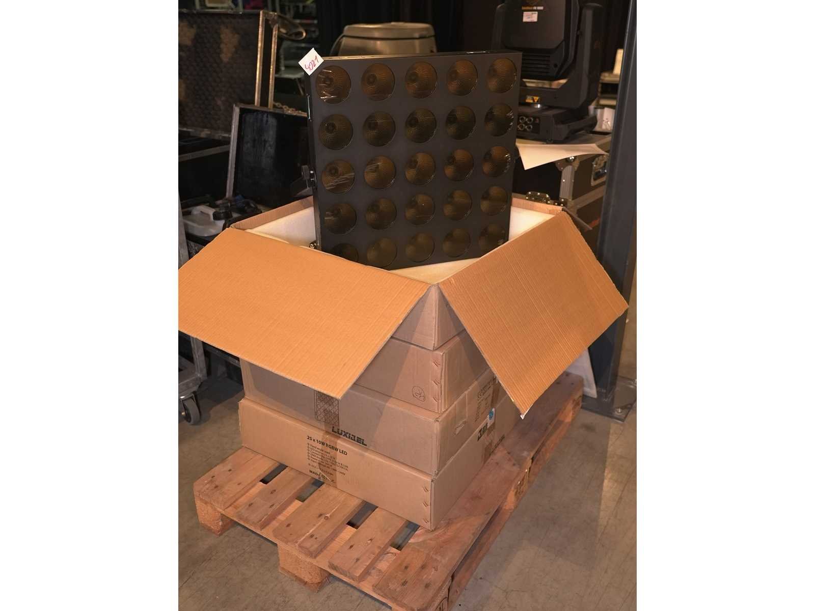 Luxibel - Set 4x Luxibel B25 a compact and highly adaptable matrix lighting unit engineered to create remarkable and unique visual experiences. This unit is equipped with 25x 10W RGB Amber Matrix LEDs, making it the first of its kind in the 5x5 matrix category to incorporate removable frost filters. The amber LED chips in the B 25 produce an exceptional glow, setting it apart from standard 'RGB only' units with its distinctive luminosity. The B 25 has been meticulously designed for maximum versatility. It can be flown, stacked, or positioned both horizontally and vertically, catering to a wide range of design needs. Its sleek profile renders it ideal for indoor settings, where its impactful lighting can truly shine. The B 25 is suitable for a diverse array of events and applications, and guaranteed to enhance the visual appeal of any space it illuminates. No Merk: Luxibel Type: 25 x 10W RGB Amber Matrix LED Bouwjaar: 2017 LED: true Totale afmeting L: 126mm Totale afmeting Breedte: 580mm Totale afmeting Hoogte: 580mm Eigen gewicht: 14.5kg GS Code: 9405494000