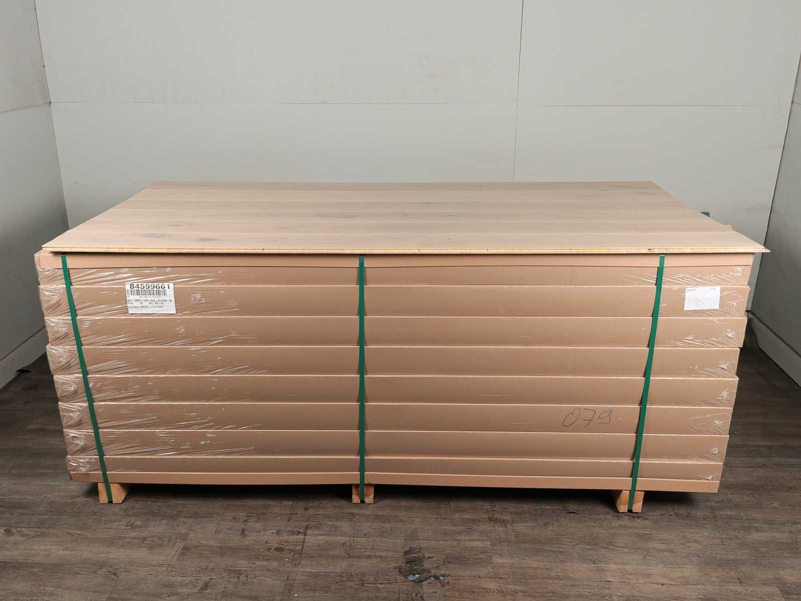 Gemakkelijk te leggen wegens 5G clicksysteem, geschikt voor alle soorten vloer en koelverwarmingen, kwaliteits parketvloer, vloer is van hoogwaardig Europees eiken hout, kant en klaar behandeld, dikte 14 mm, toplaag 3 mm, 40 pakken a 2,77 m2 No Merk: Ambiance Product type: Parket Oppervlakte: 110m² Geschikt voor vloerverwarming: Ja V-groef: Ja Afwerking: Mat gelakt, geborsteld, met v-groef Aantal m² per verpakking: 2.77m² Kleur: Cream oak 079 Gewicht: 925kg Lengte: 2200mm Breedte: 180mm Materiaal: Eiken multiplank