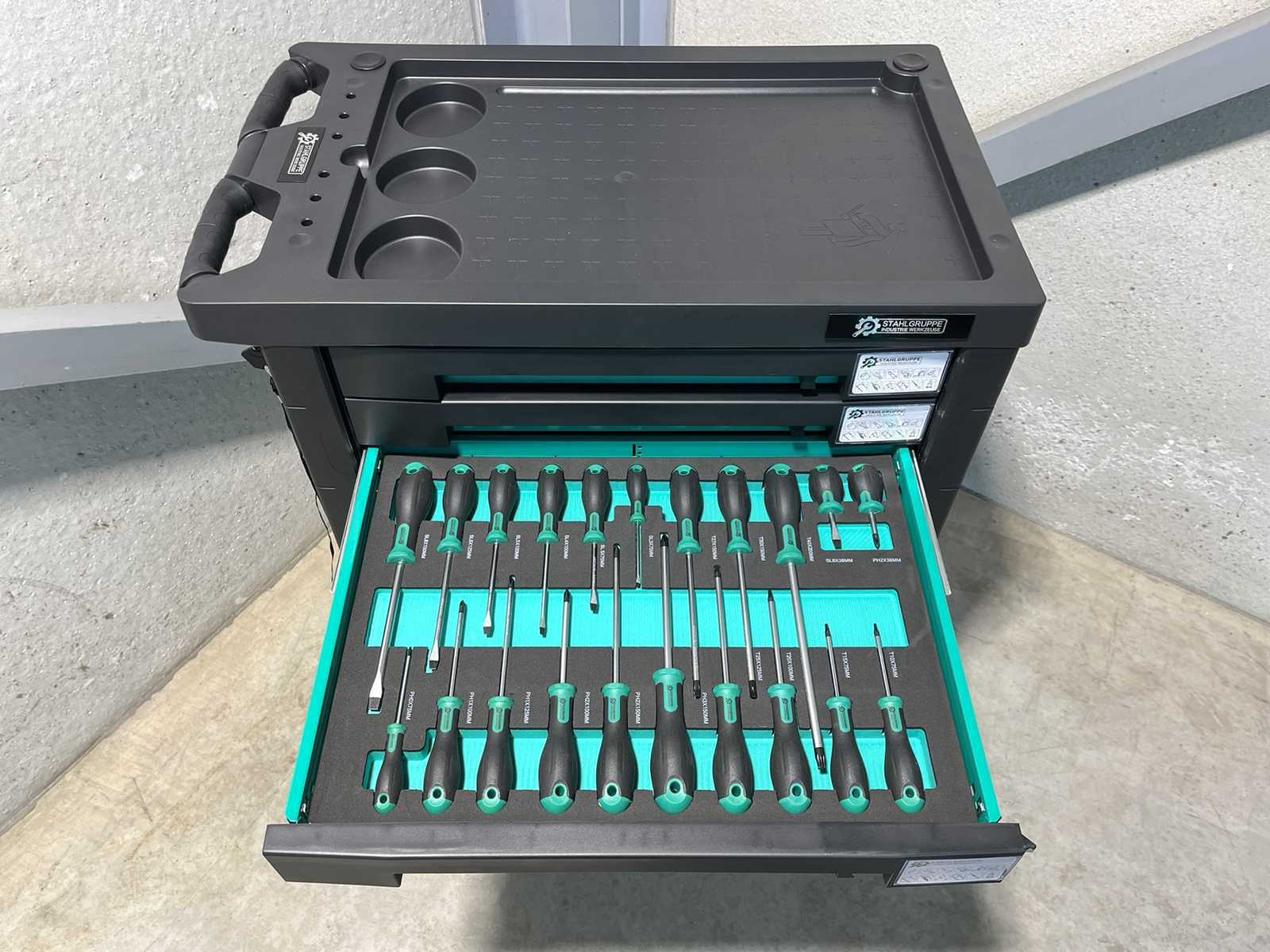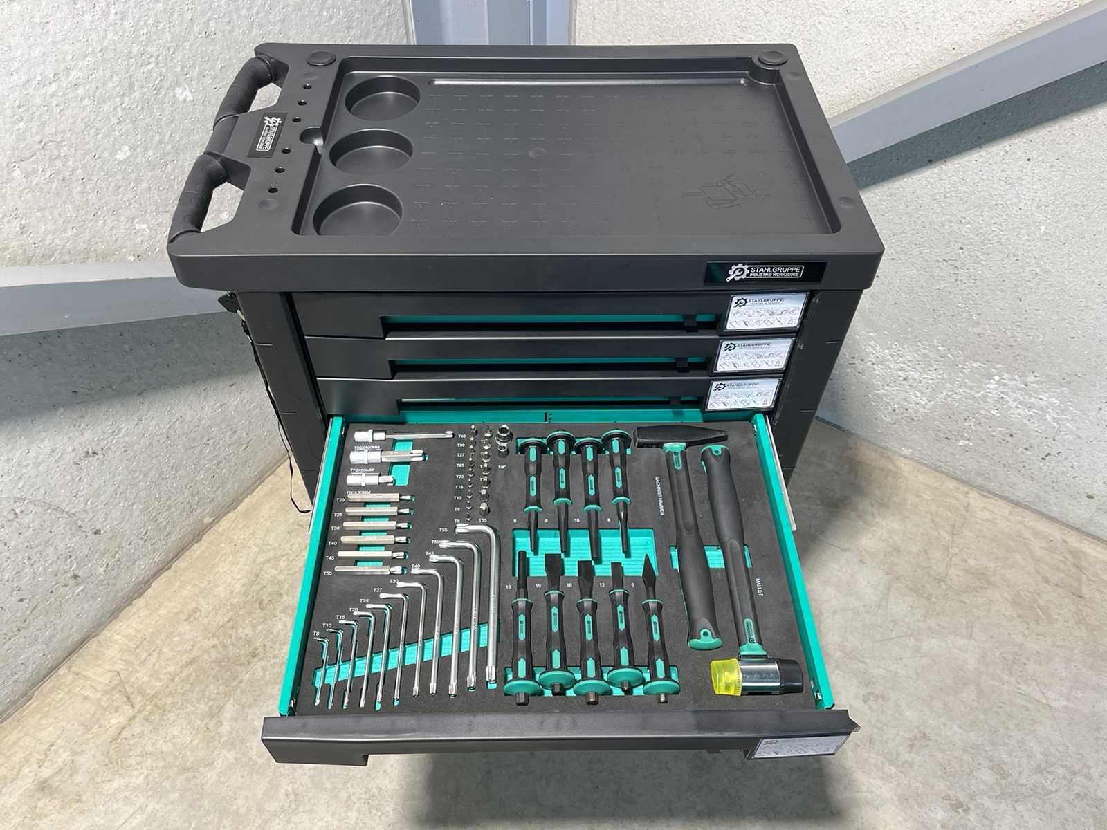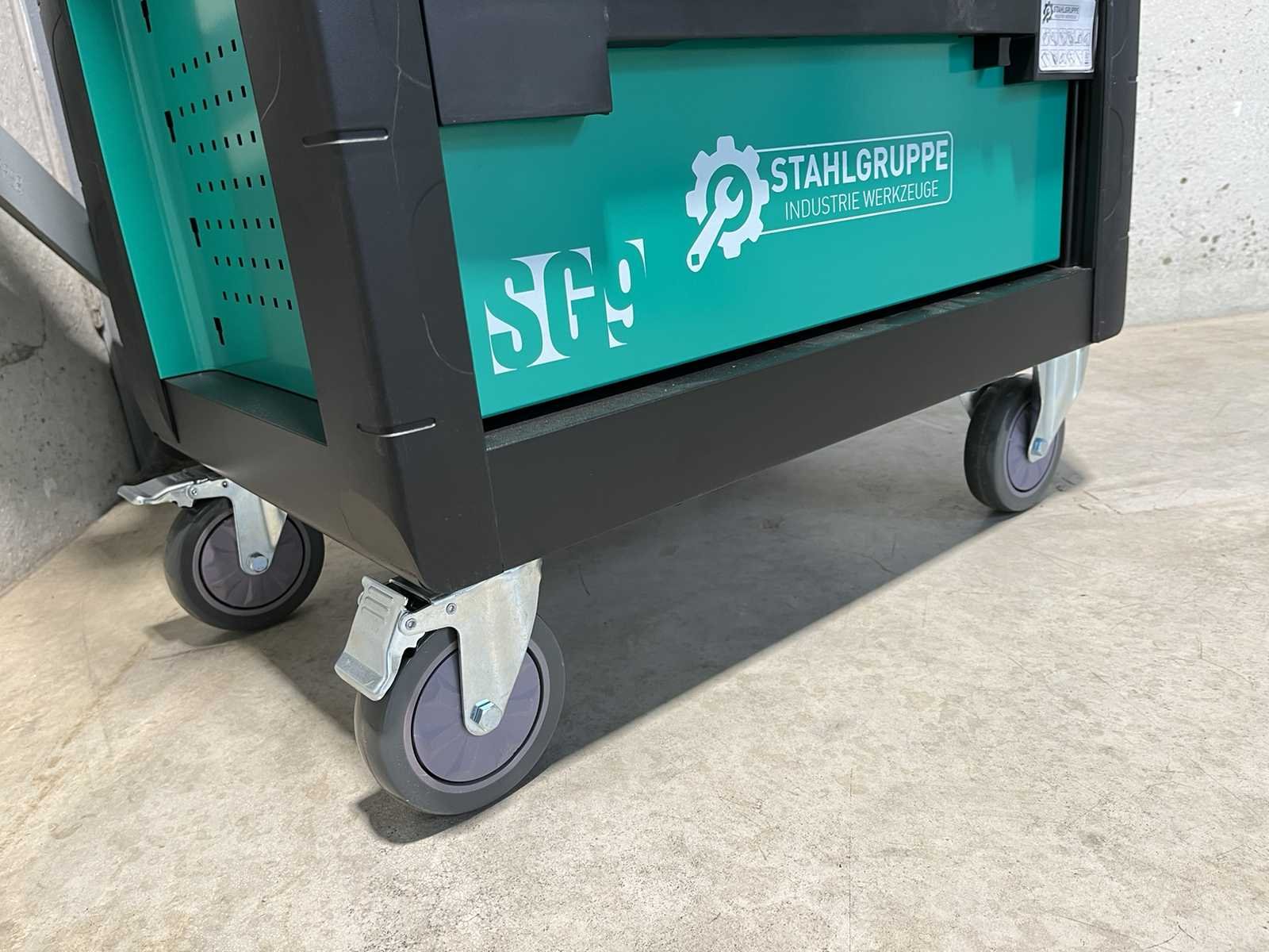 <li><strong>Merk:</strong> Stahlgruppe</li> <li><strong>Type:</strong> SG9</li> <li><strong>Aantal laden:</strong> 7 laden</li> <li><strong>Aantal gevulde laden:</strong> 5 gevulde laden</li> <li><strong>Kast:</strong> dubbelwandige kast met automatisch vergrendelende laden</li> <li><strong>Gereedschap:</strong> Chrome Vanadium gereedschap</li> <li><strong>Inhoud:</strong> <ul> <li>2 dopsleutel sets (1/4” & 1/2”)</li> <li>ring- steeksleutelset (6-32 mm)</li> <li>ringratel-steeksleutelset (8-19 mm)</li> <li>Inbussleutels (1,5-10 mm)</li> <li>schroevendraaiers (21 stuks)</li> <li>Torxsleutels (T8-T70)</li> <li>beitels en pendrijvers (9 stuks)</li> <li>diverse hamers (2 stuks)</li> <li>diverse tangen (9 stuks)</li> <li>schuifmaat (0-150 mm * 0,05 mm)</li> <li>enzovoort…</li> </ul> </li> <li><strong>Staat:</strong> ongebruikt, in de originele verpakking</li> Nee Merk: Stahlgruppe Type: SG9