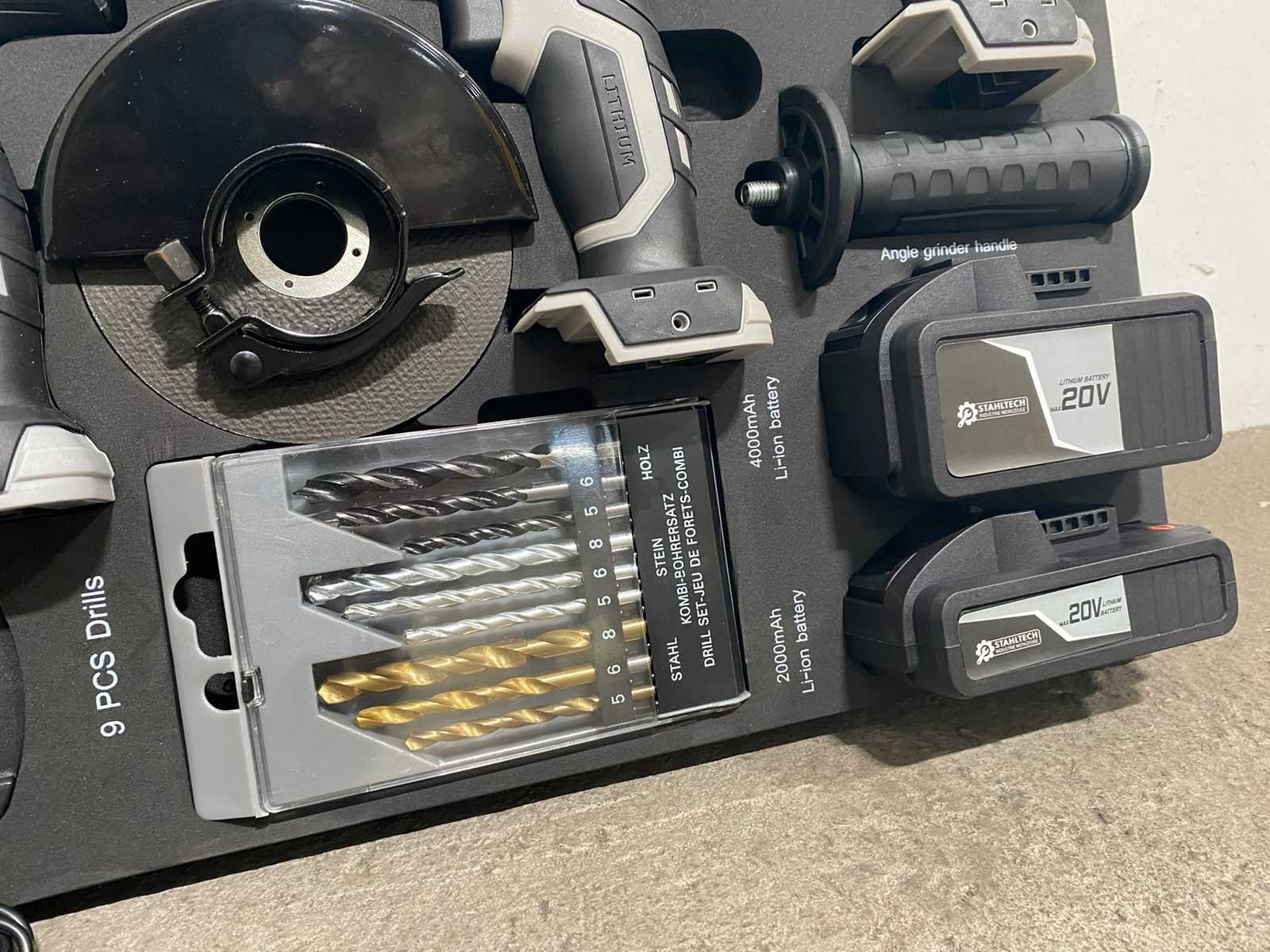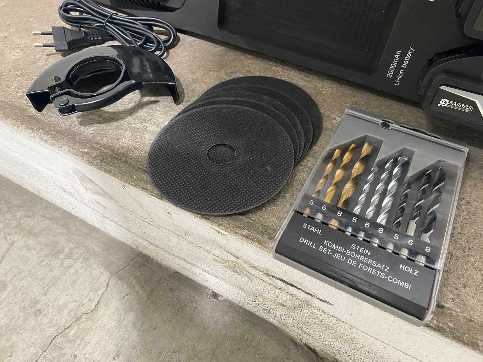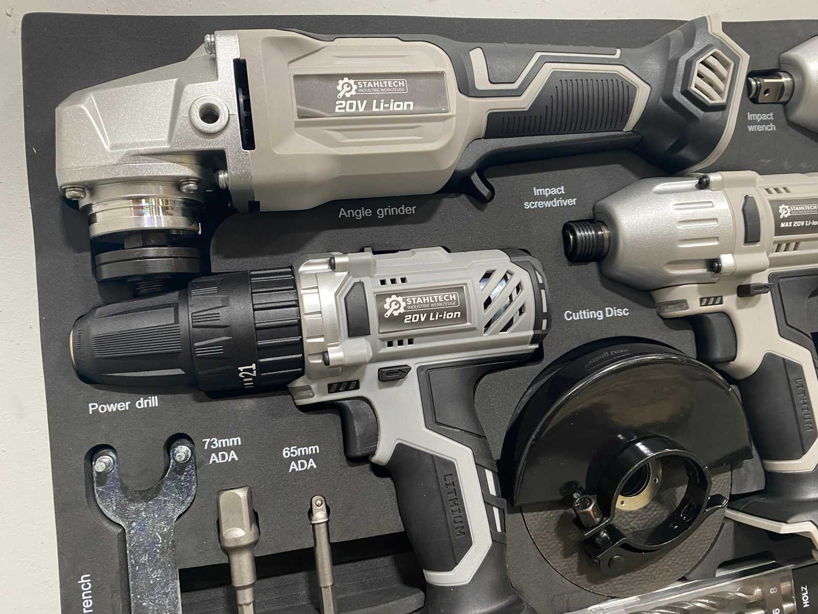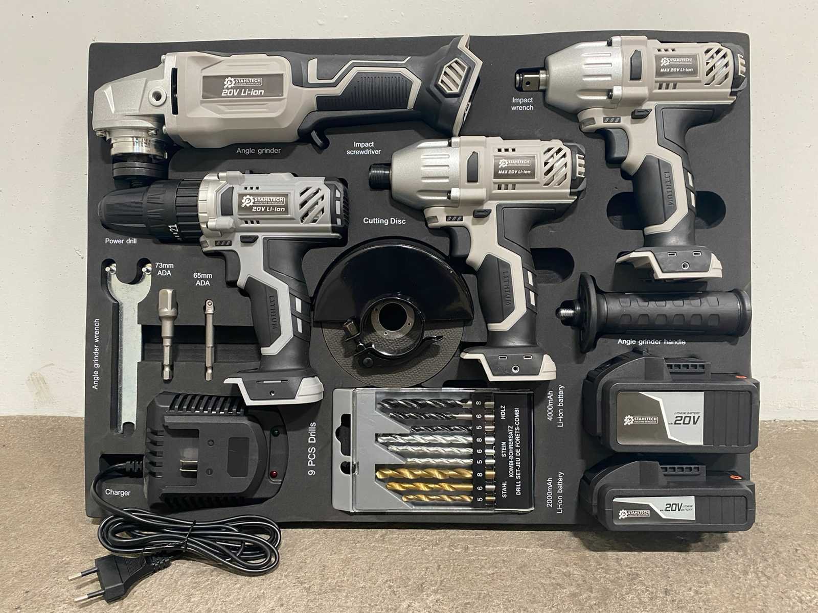 <li><b>4-delige set accu gereedschappen</b></li> <li><b>Bestaande uit:</b> <ul> <li>Accu boormachine</li> <li>Accu schroefmachine</li> <li>Accu slagmoersleutel</li> <li>Accu haakse slijper</li> </ul> </li> <li><b>Inclusief:</b> Accu’s: <ul> <li>1 x lithium-ion accu 20 volt, 2000 mAh</li> <li>1 x lithium-ion accu 20 volt, 4000 mAh</li> </ul> </li> <li><b>Inclusief:</b> acculader</li> <li><b>Inclusief:</b> 9-delige borenset</li> <li><b>Inclusief:</b> 5 slijpschijven</li> <li><b>Inclusief:</b> toebehoren</li> <li><b>Goed om te weten:</b> foam inlay voor de laden van een gereedschapswagen</li> <li><b>Afmeting:</b> 52,5 x 38,5 cm</li> <li><b>Staat:</b> Ongebruikt, in de originele verpakking</li> Nee Merk: Stahlgruppe
