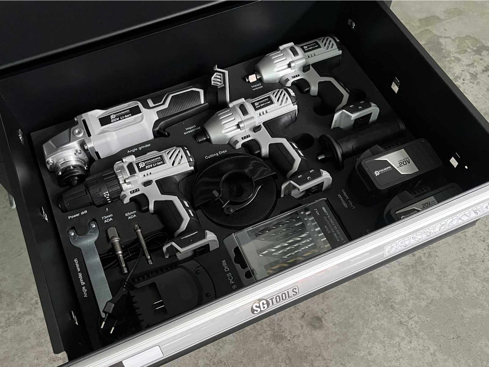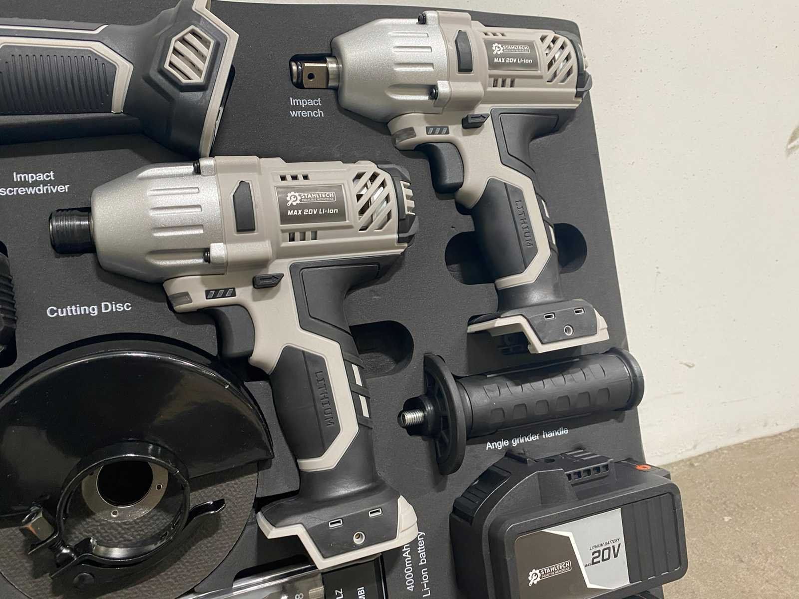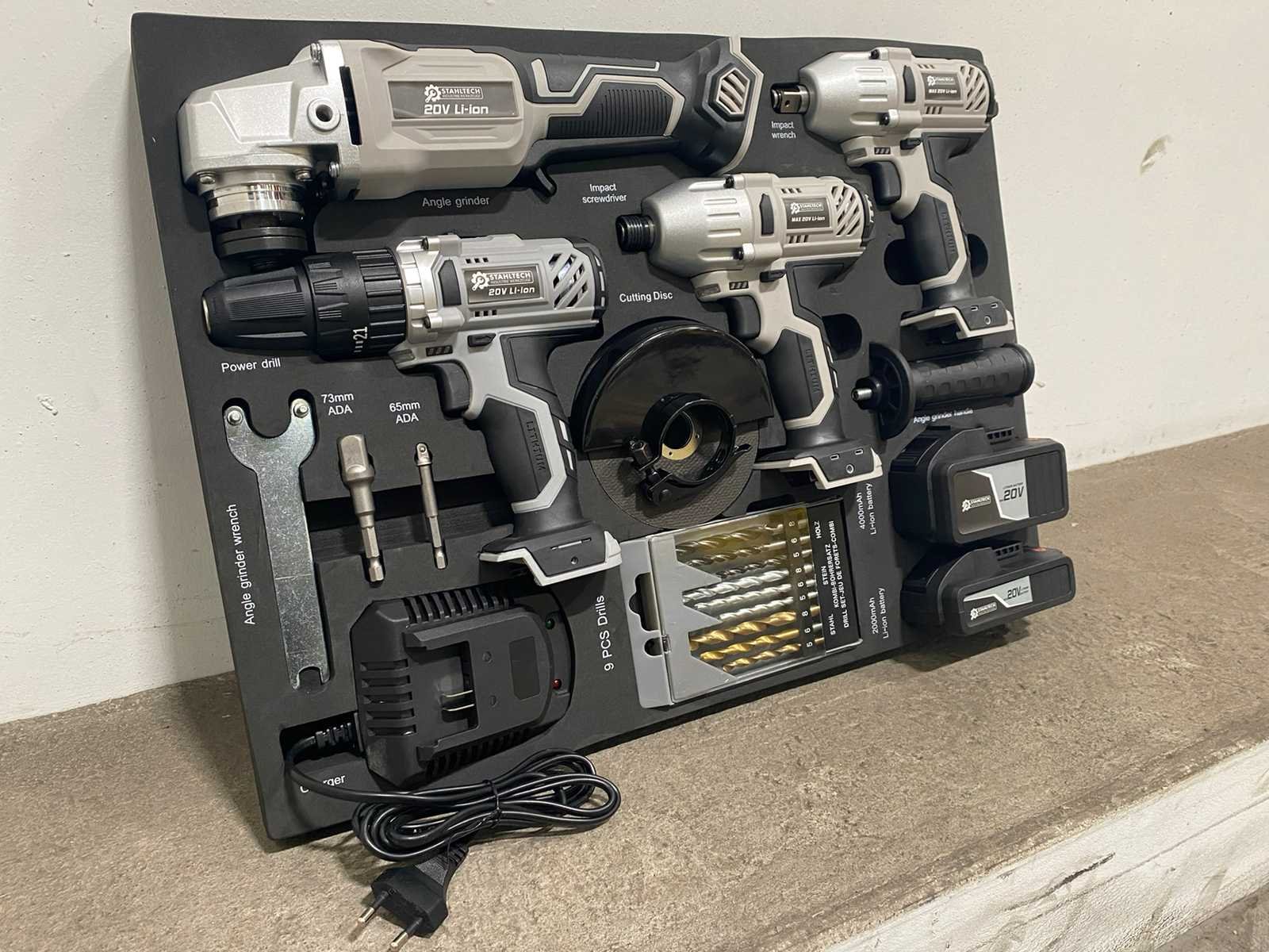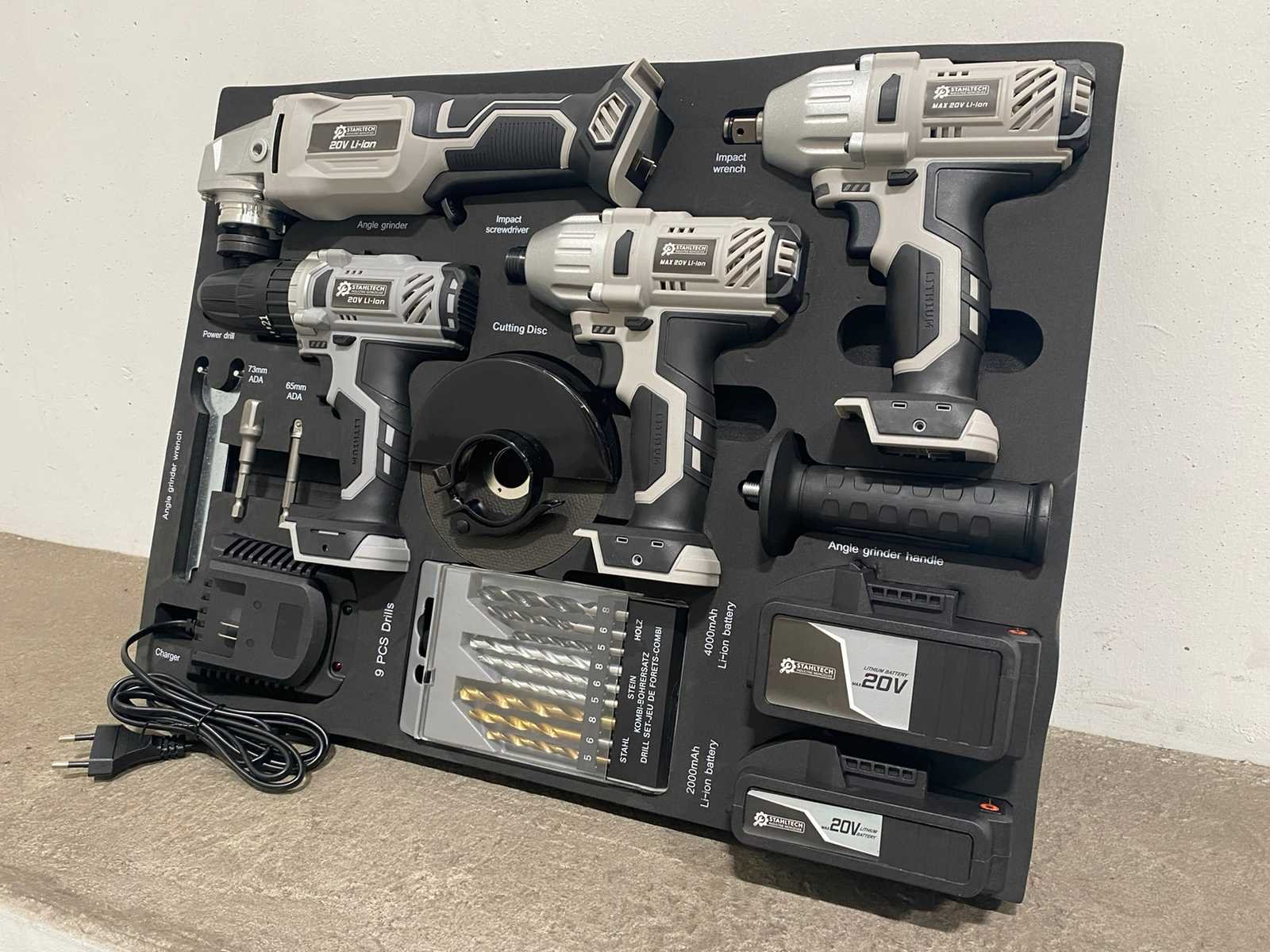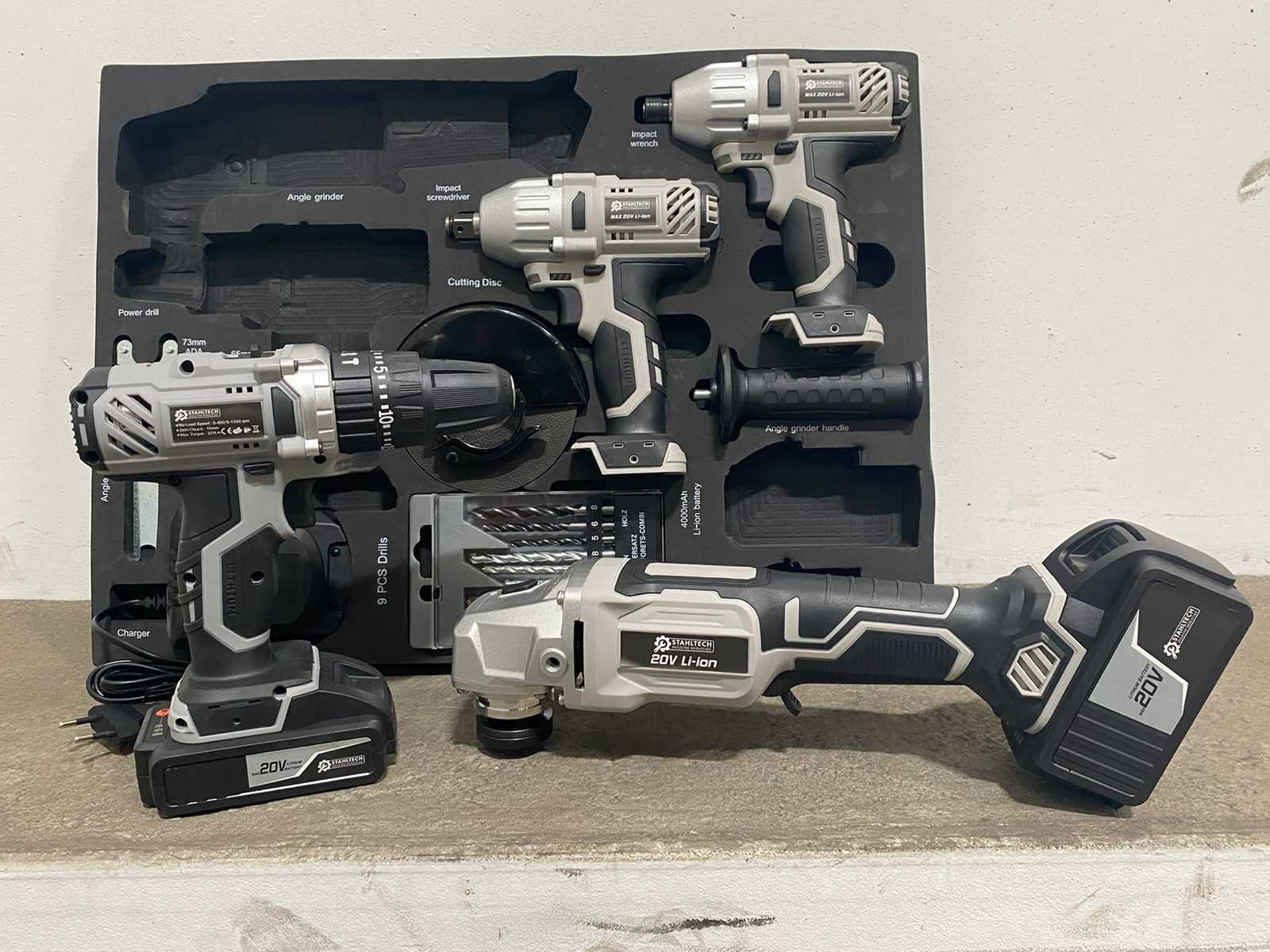 <li><b>4-delige set accu gereedschappen</b></li> <li><b>Bestaande uit:</b> <ul> <li>Accu boormachine</li> <li>Accu schroefmachine</li> <li>Accu slagmoersleutel</li> <li>Accu haakse slijper</li> </ul> </li> <li><b>Inclusief:</b> Accu’s: <ul> <li>1 x lithium-ion accu 20 volt, 2000 mAh</li> <li>1 x lithium-ion accu 20 volt, 4000 mAh</li> </ul> </li> <li><b>Inclusief:</b> acculader</li> <li><b>Inclusief:</b> 9-delige borenset</li> <li><b>Inclusief:</b> 5 slijpschijven</li> <li><b>Inclusief:</b> toebehoren</li> <li><b>Goed om te weten:</b> foam inlay voor de laden van een gereedschapswagen</li> <li><b>Afmeting:</b> 52,5 x 38,5 cm</li> <li><b>Staat:</b> Ongebruikt, in de originele verpakking</li> Nee Merk: Stahlgruppe