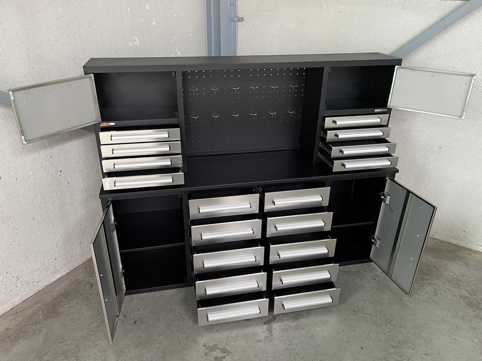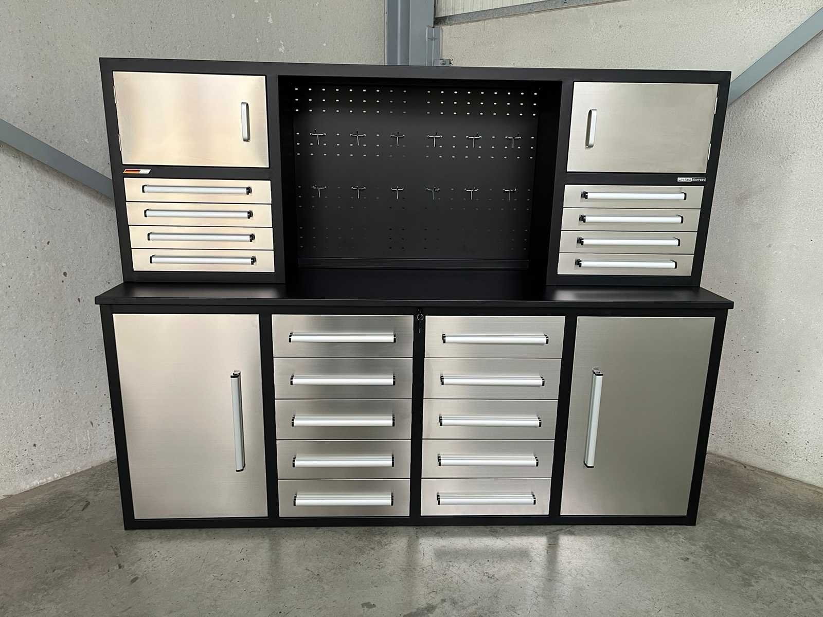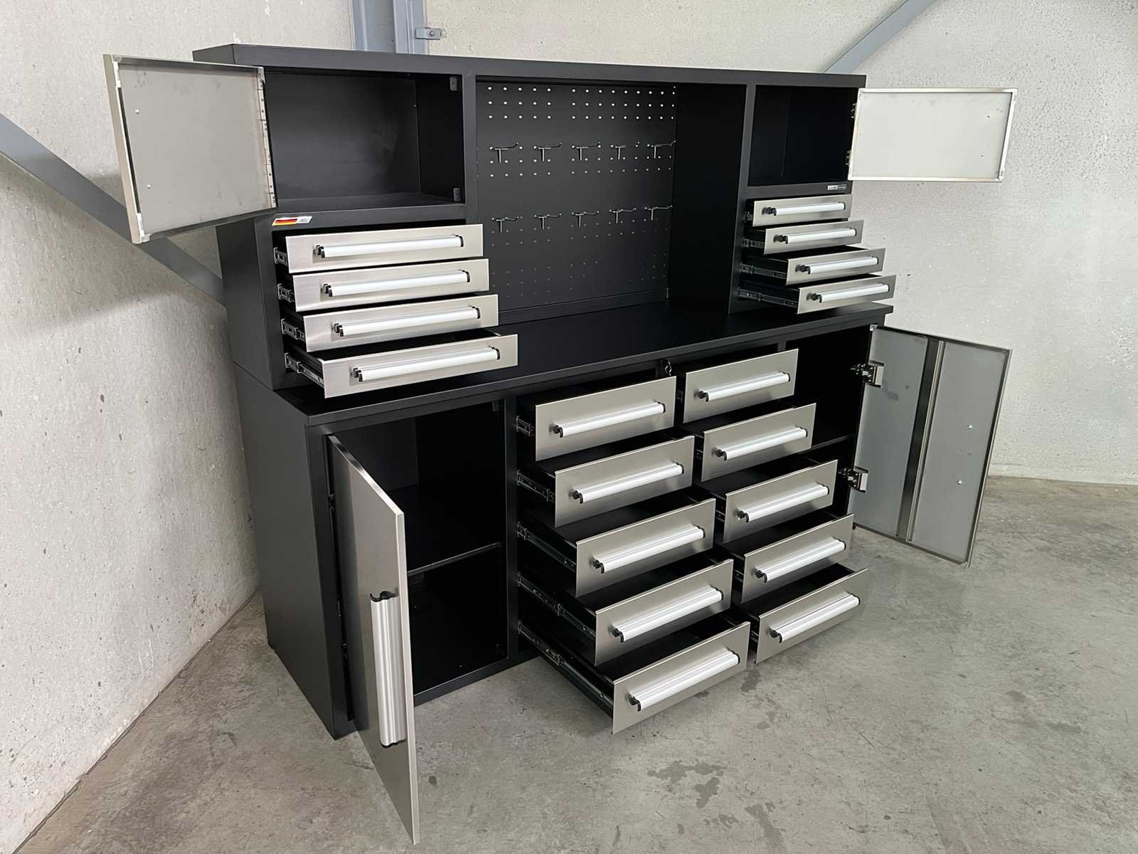 <ul> <li><strong>RVS werkbank</strong></li> <li><strong>afmetingen:</strong> 2210 x 580 x 1700 mm</li> <li><strong>laden:</strong> 18 laden</li> <li><strong>afmetingen laden onderaan:</strong> 450 x 480 x 120 mm</li> <li><strong>afmetingen laden bovenaan:</strong> 465 x 275 x 65 mm</li> <li><strong>capaciteit per lade:</strong> 40 kg</li> <li><strong>deuren:</strong> 4 deuren</li> <li><strong>afmetingen deuren onderaan:</strong> 500 x 800 mm</li> <li><strong>afmetingen deuren bovenaan:</strong> 520 x 310 mm</li> <li><strong>handgrepen:</strong> aluminium handgrepen</li> <li><strong>hoogte werkblad:</strong> 910 mm</li> <li><strong>werkblad:</strong> 30 mm dik werkblad</li> <li><strong>capaciteit werkblad:</strong> 750 kg</li> <li><strong>kleur:</strong> roestvrijstaal</li> <li><strong>frame:</strong> zwart gepoedercoat frame</li> <li><strong>fronten:</strong> roestvrijstalen fronten</li> <li><strong>gewicht:</strong> 300 kg</li> </ul> Nee