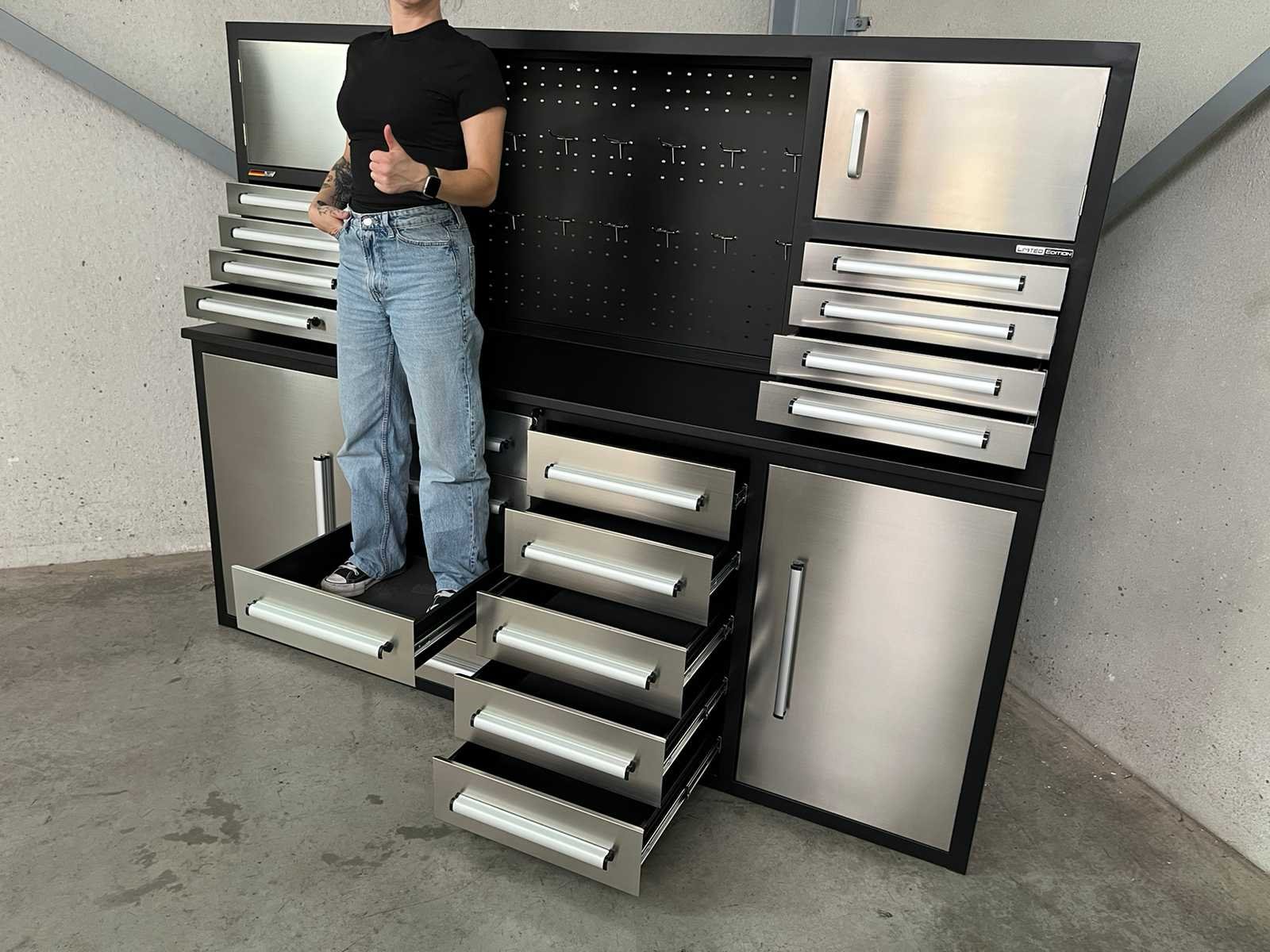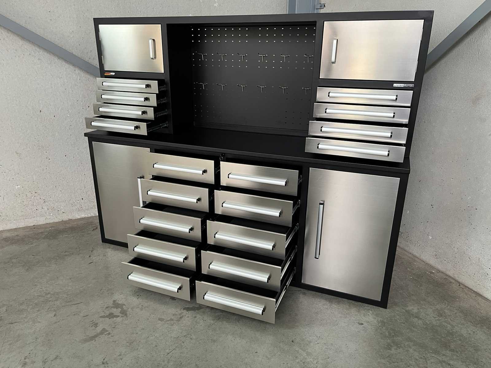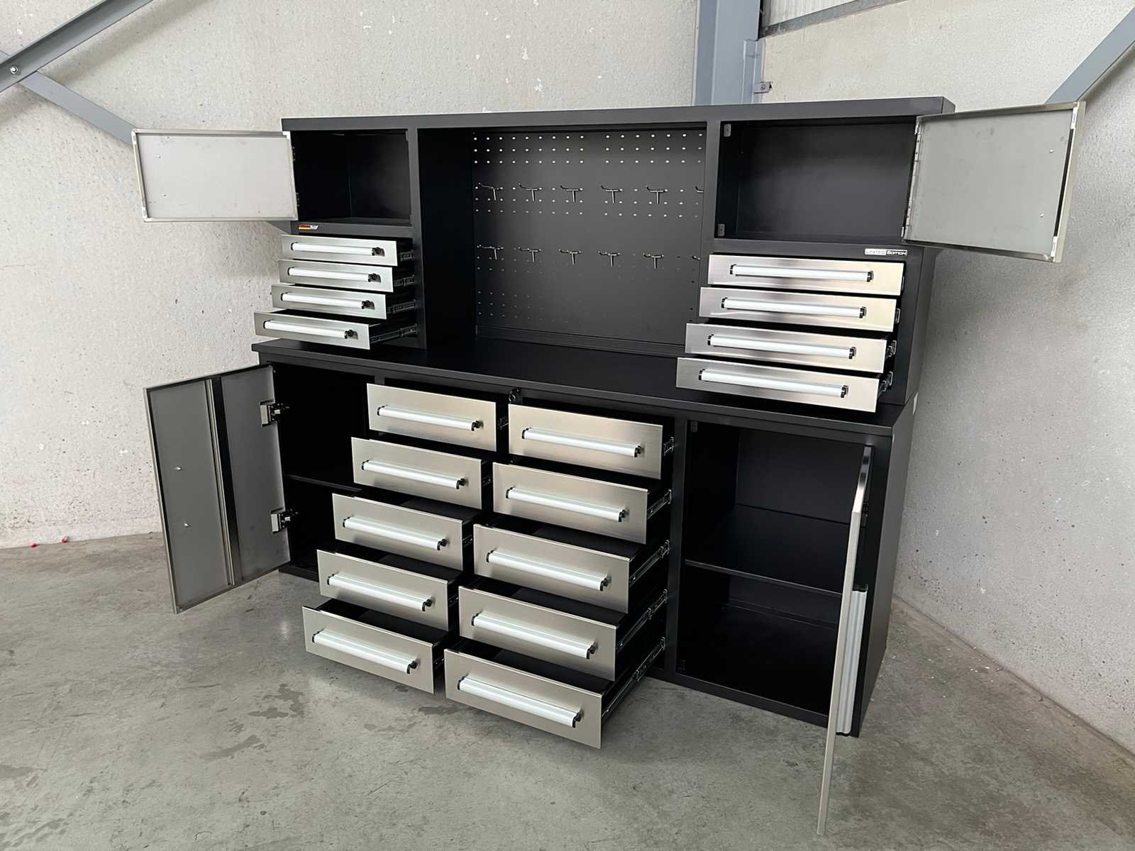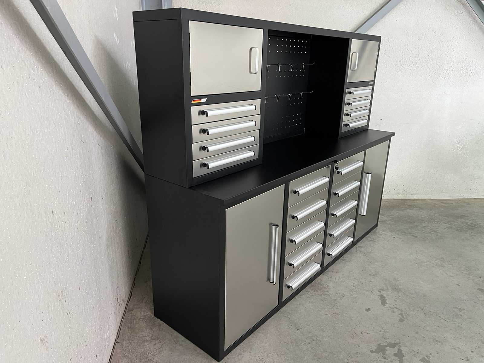 <ul> <li><strong>RVS werkbank</strong></li> <li><strong>afmetingen:</strong> 2210 x 580 x 1700 mm</li> <li><strong>laden:</strong> 18 laden</li> <li><strong>afmetingen laden onderaan:</strong> 450 x 480 x 120 mm</li> <li><strong>afmetingen laden bovenaan:</strong> 465 x 275 x 65 mm</li> <li><strong>capaciteit per lade:</strong> 40 kg</li> <li><strong>deuren:</strong> 4 deuren</li> <li><strong>afmetingen deuren onderaan:</strong> 500 x 800 mm</li> <li><strong>afmetingen deuren bovenaan:</strong> 520 x 310 mm</li> <li><strong>handgrepen:</strong> aluminium handgrepen</li> <li><strong>hoogte werkblad:</strong> 910 mm</li> <li><strong>werkblad:</strong> 30 mm dik werkblad</li> <li><strong>capaciteit werkblad:</strong> 750 kg</li> <li><strong>kleur:</strong> roestvrijstaal</li> <li><strong>frame:</strong> zwart gepoedercoat frame</li> <li><strong>fronten:</strong> roestvrijstalen fronten</li> <li><strong>gewicht:</strong> 300 kg</li> </ul> Nee