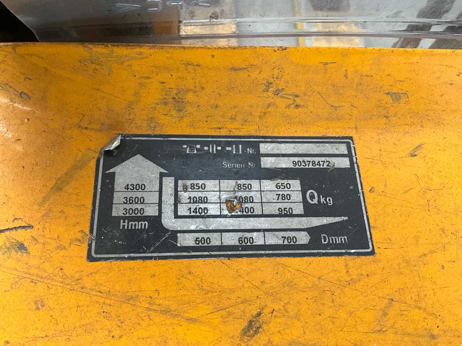 Nee Merk: Jungheinrich Type: EJC 214 115 430DZ Bouwjaar: 2010 Hefvermogen: 1400kg Lepellengte: 1150mm Minimale doorrijhoogte: 1900mm Accu lader: true
