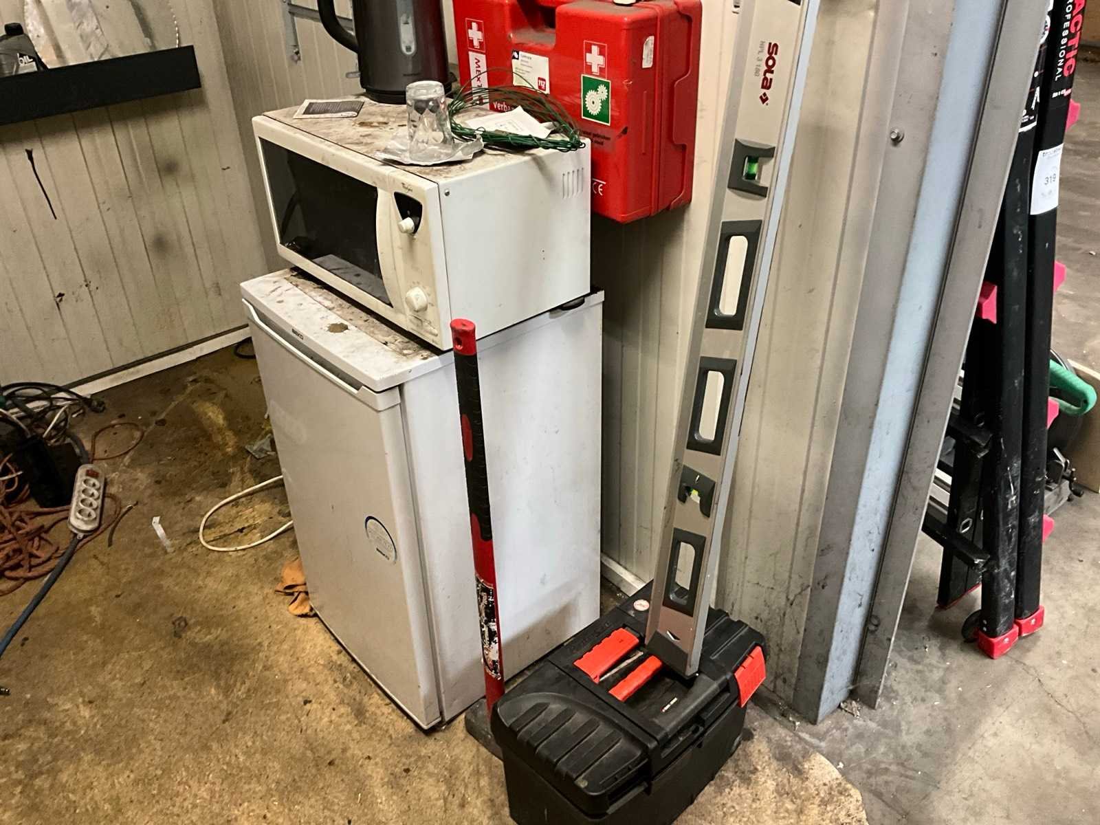 Bestaand uit lockerkast, bureel met stoel, koelkast en magnetron, waterpomp B&D, verlengkabels, waterkokers, startbooster Stanley, Passat en voorhamer, materiaalkoffer, EHBO materiaal enz… Nee