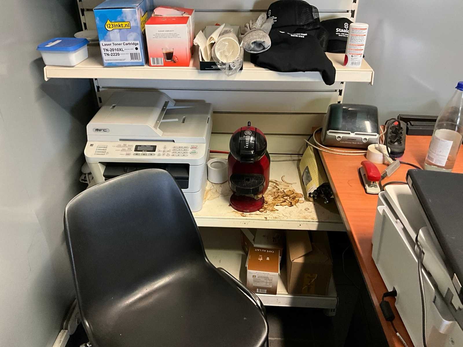 Bestaand uit tweedelig bureautafel 250x120 cm, 2x laptop Acer+ Compac, printer copieertoestel HP deskjet 4120e, printer kopieerapparaat Brother MFX, expressotoestel Nescafé Dolce Gusto, 2 x bureaustoel, 1x electrische heater, airco Delonghi, 3x plaatstalen dossierkast met inhoud, BOEKHOUDING BLIJFT TER PLAATSE!! Nee