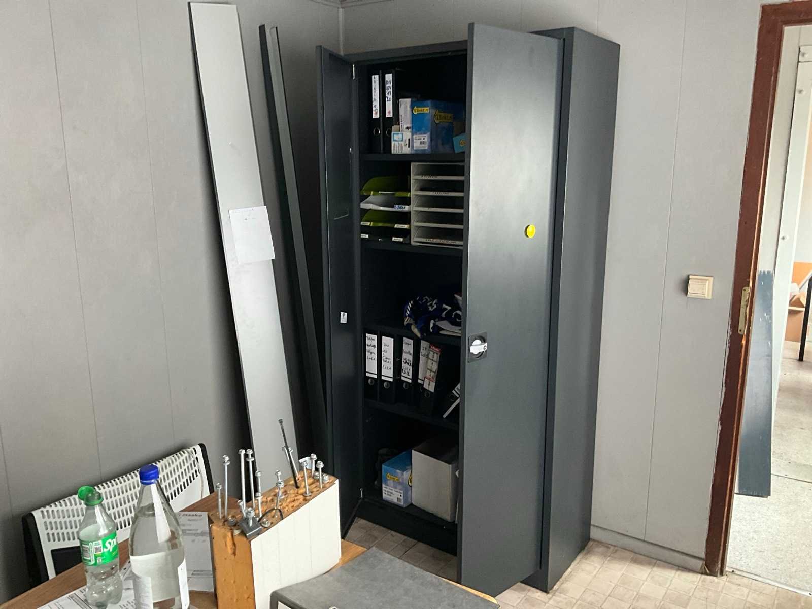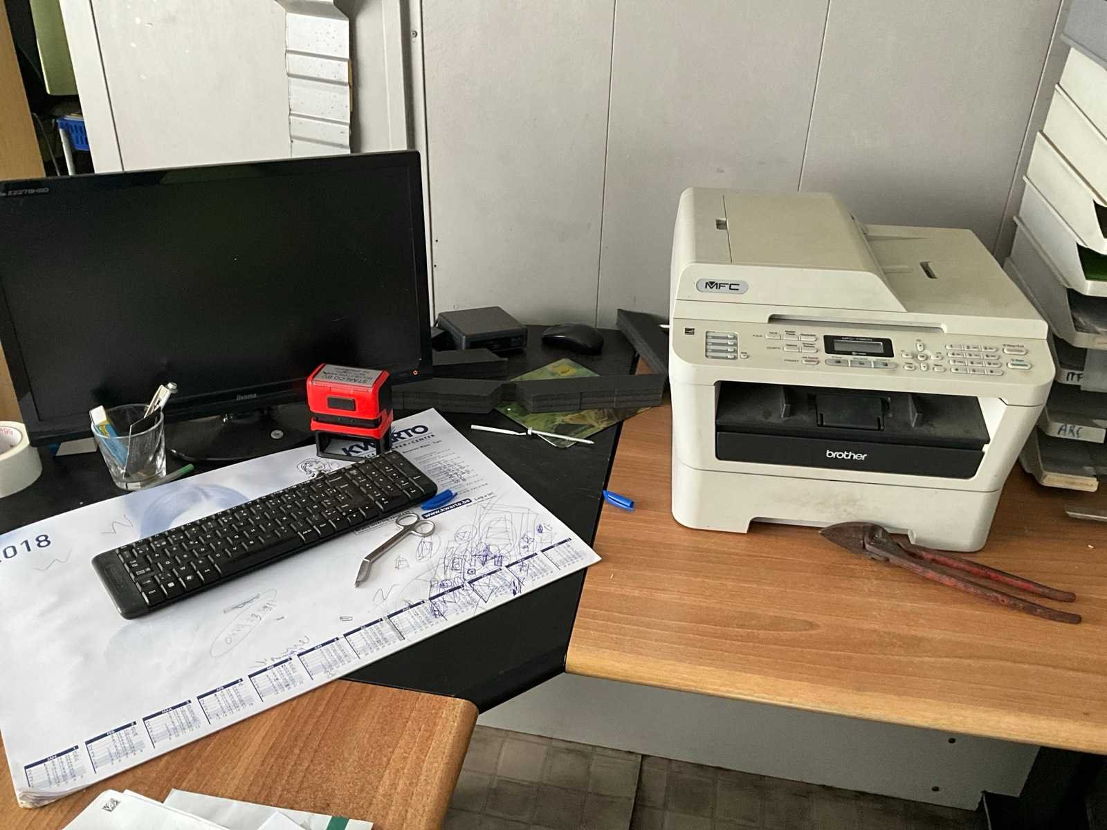 Bestaand uit tweedelig bureautafel 230x165 cm, pc scherm + klavier, printer kopieerapparaat Brother MFX, 1x bureaustoel, 1x electrische heater, 1x plaatstalen dossierkast met inhoud, BOEKHOUDING BLIJFT TER PLAATSE!! Nee
