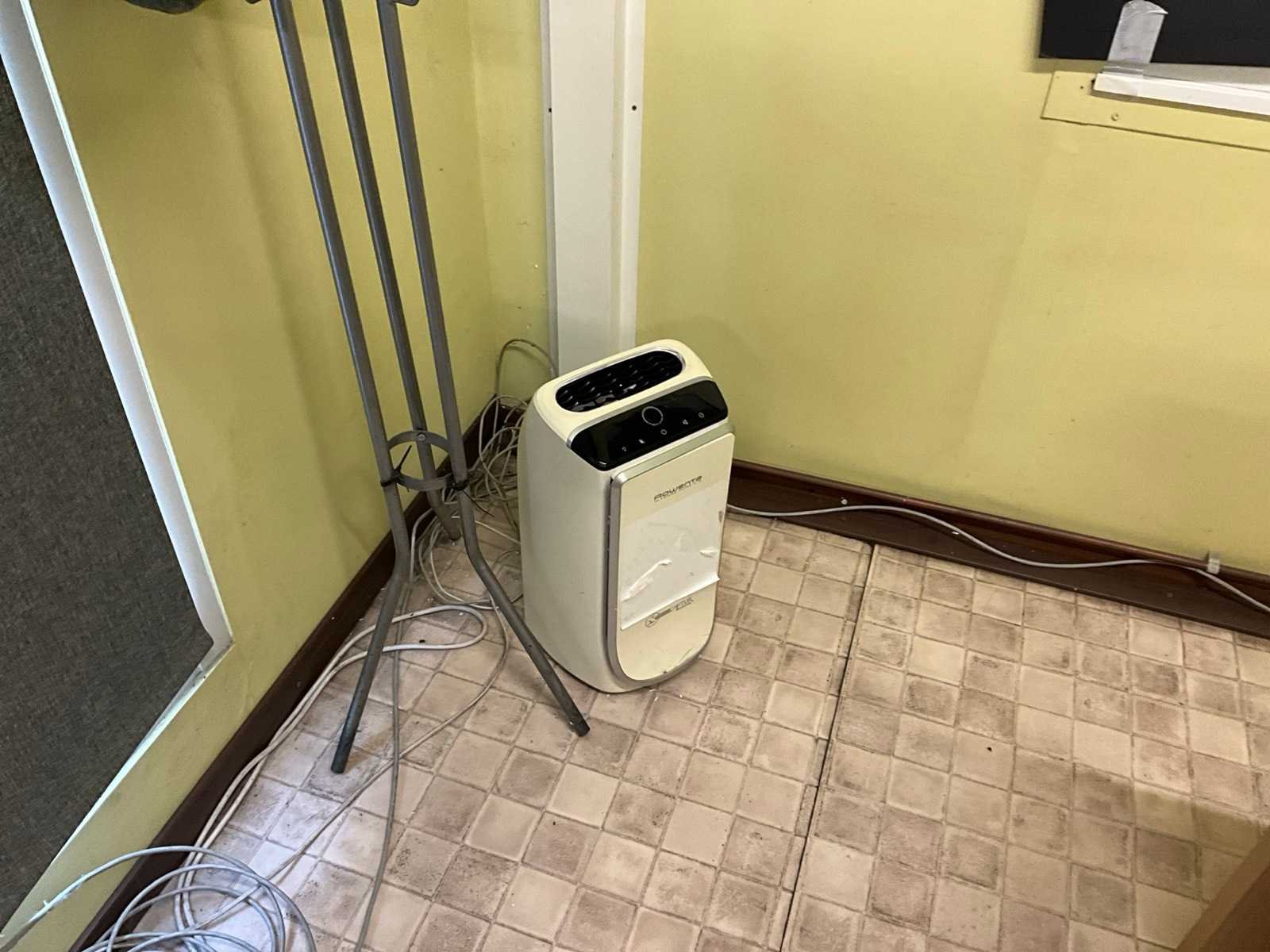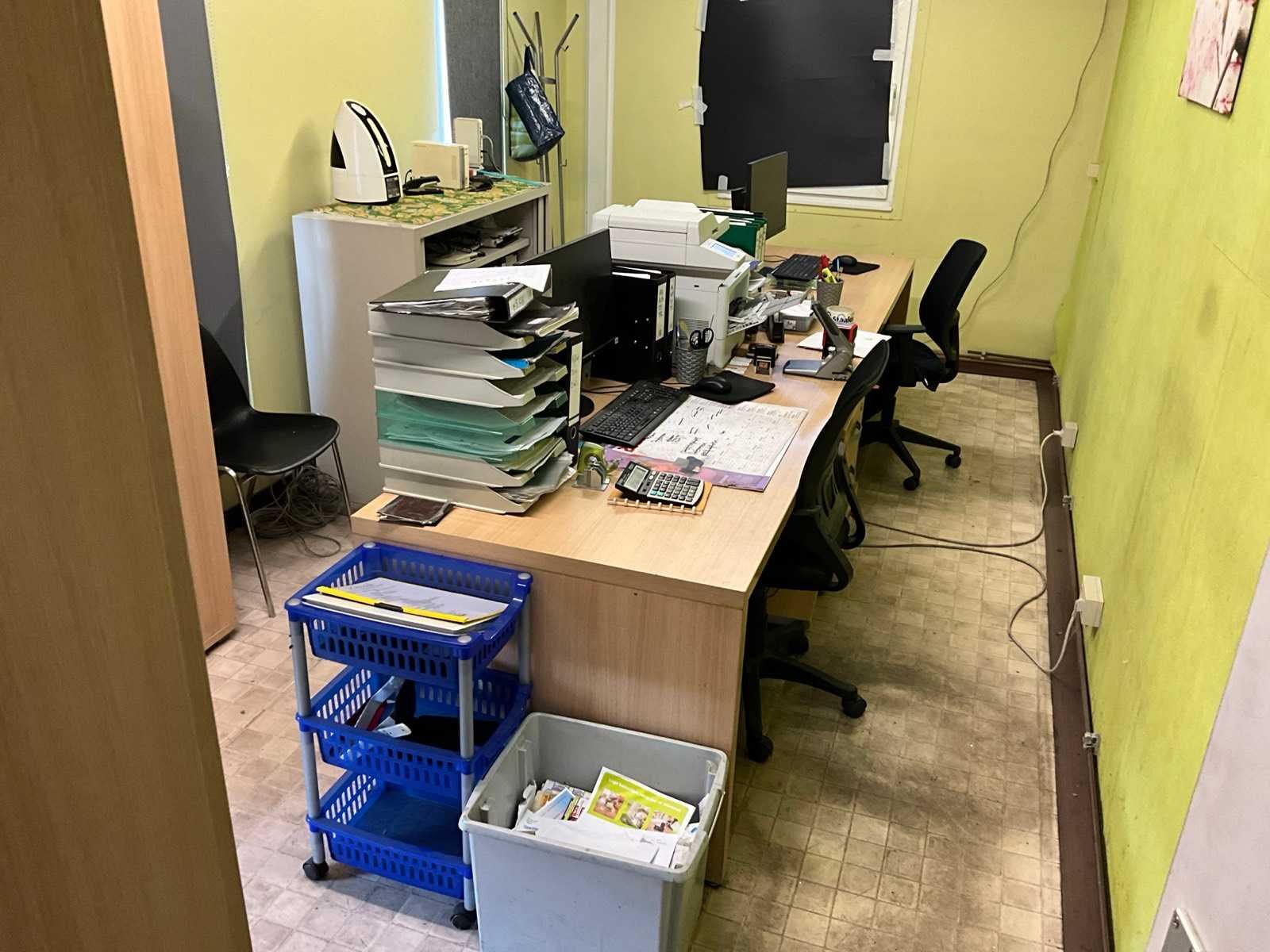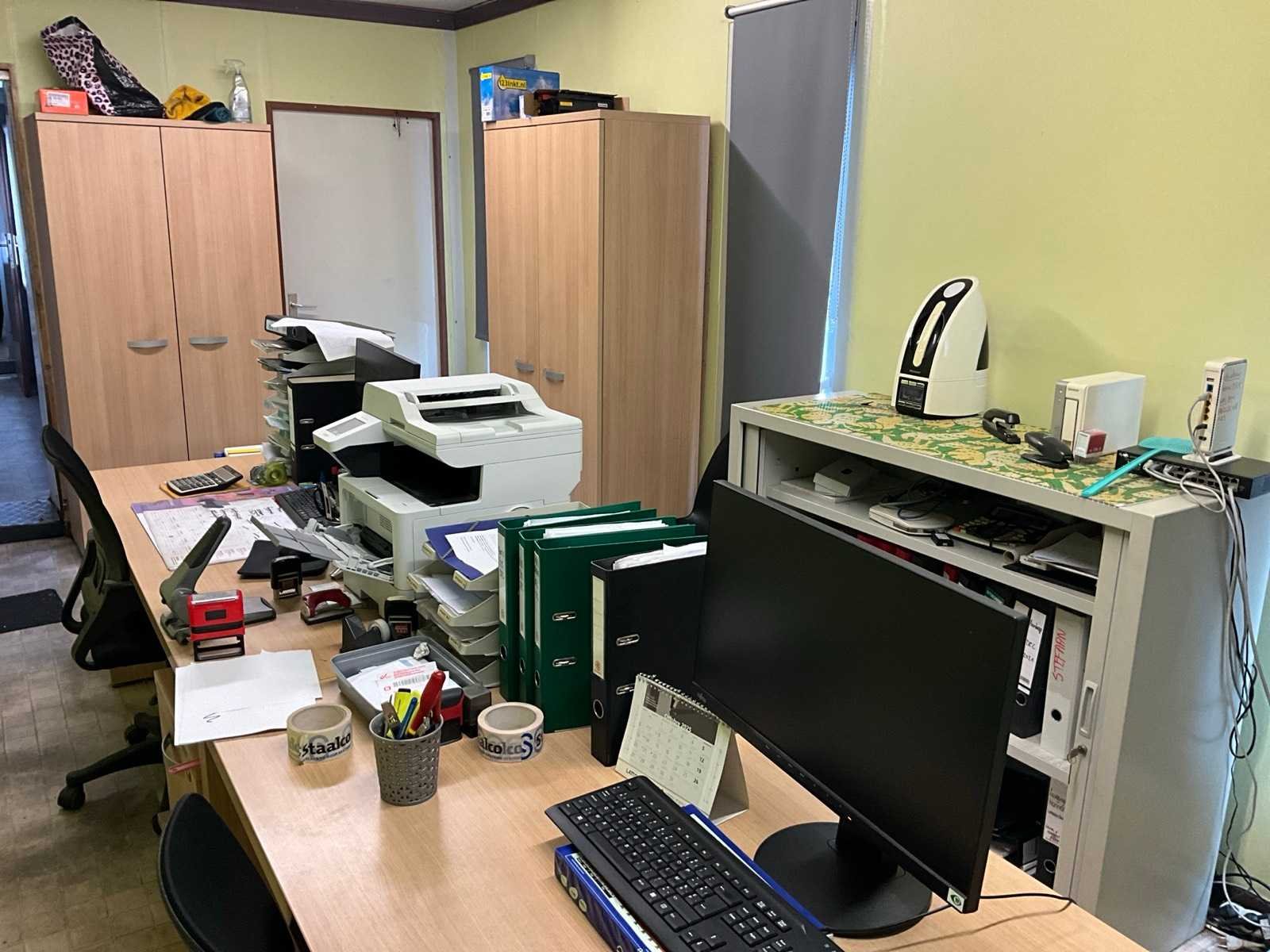 Bestaand uit 2x bureautafel 180x85 cm, 2x pc + 2x scherm + klavier, printer kopieerapparaat Brother DCP, 2x bureaustoel, 1x plaatstalen dossierkast met inhoud, +2x houten 2-deurs dossierkast met inhoud, mini airco Rowenta, ladekast, BOEKHOUDING BLIJFT TER PLAATSE!! Nee