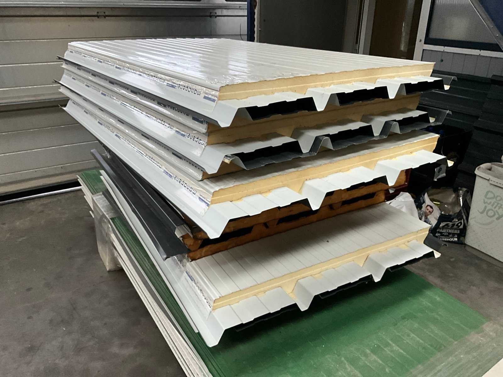 Bestaand uit 6x plaat met isolatie met afmeting 1150x120x3000 mm, +5 platen met afmeting 1050x100x3000 mm, +5 platen met afmeting 1050x60x3050 mm, + circa 15 geïsoleerde dakplaten, + hoekstukken Nee