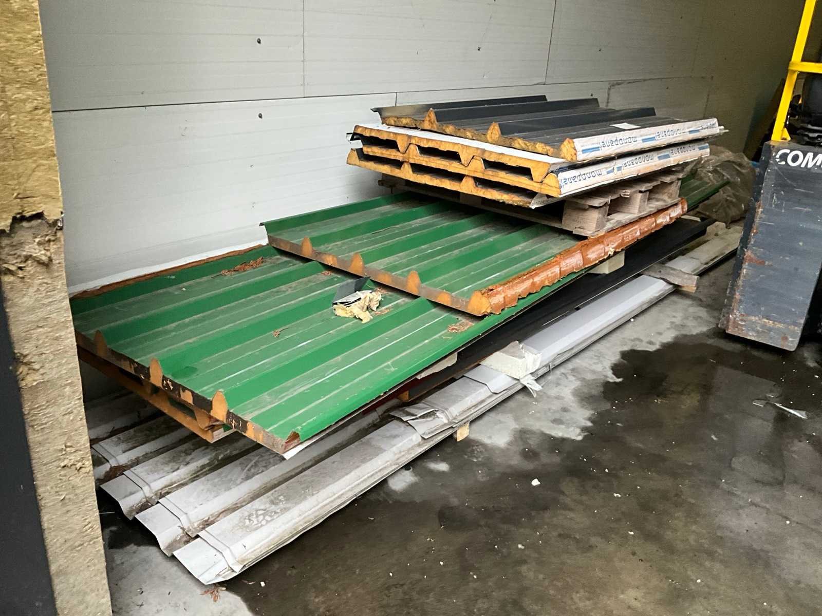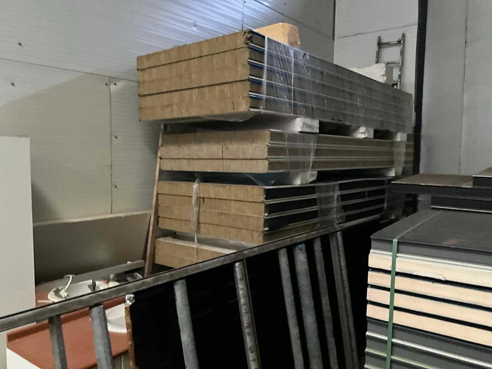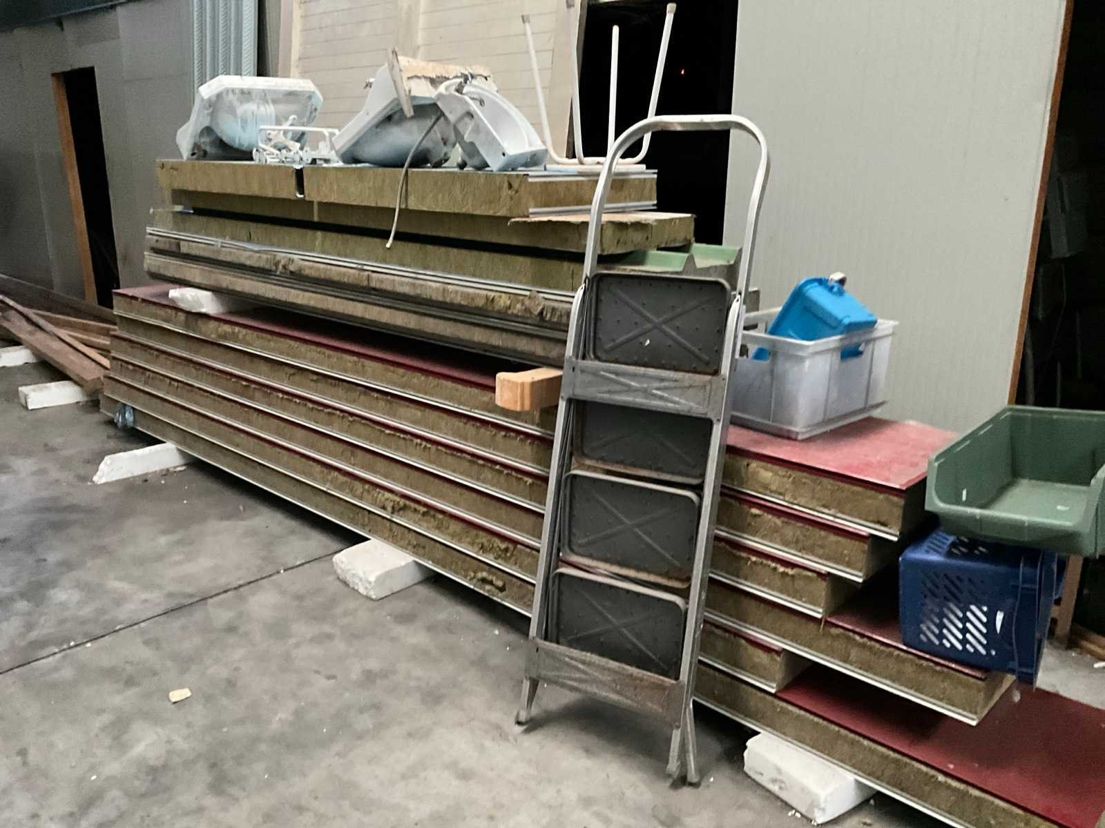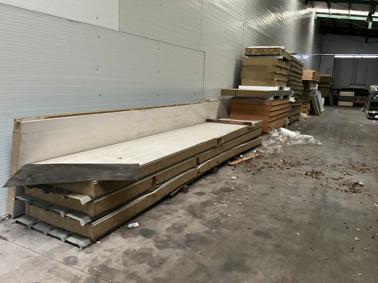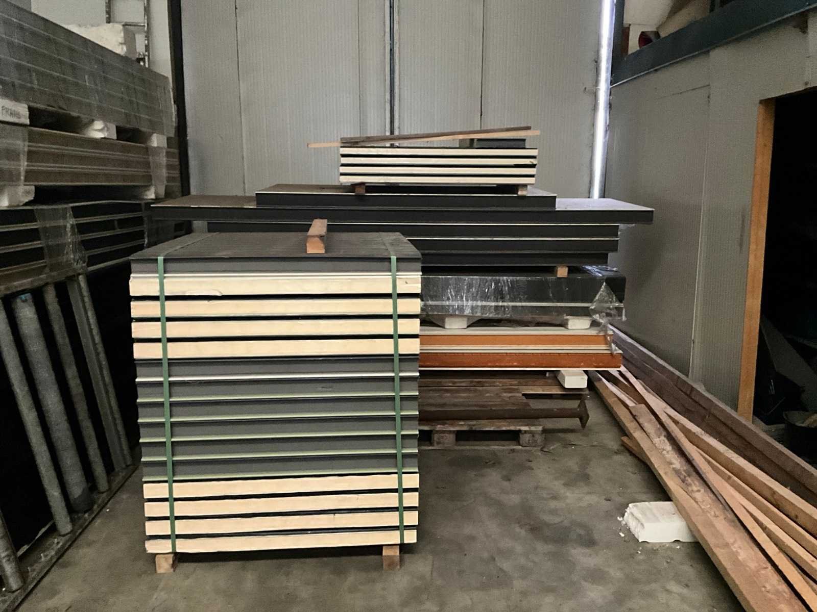 Bestaand uit grote partij diverse geïsoleerde en niet geïsoleerde dakpanelen, geïsoleerde wanden, materiaalwagen met inhoud, werkbank, banden op velg, gelakt plaatmateriaal enz…, alles gesitueerd in draagarmstelling (draagarmstelling niet inbegrepen!!) en op de grond, gesitueerd in gebouw achteraan rechts nr 3 Nee