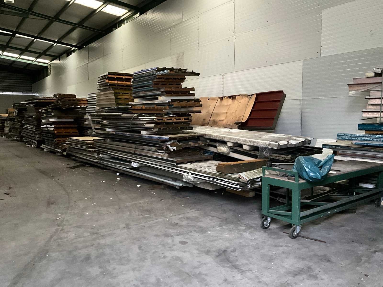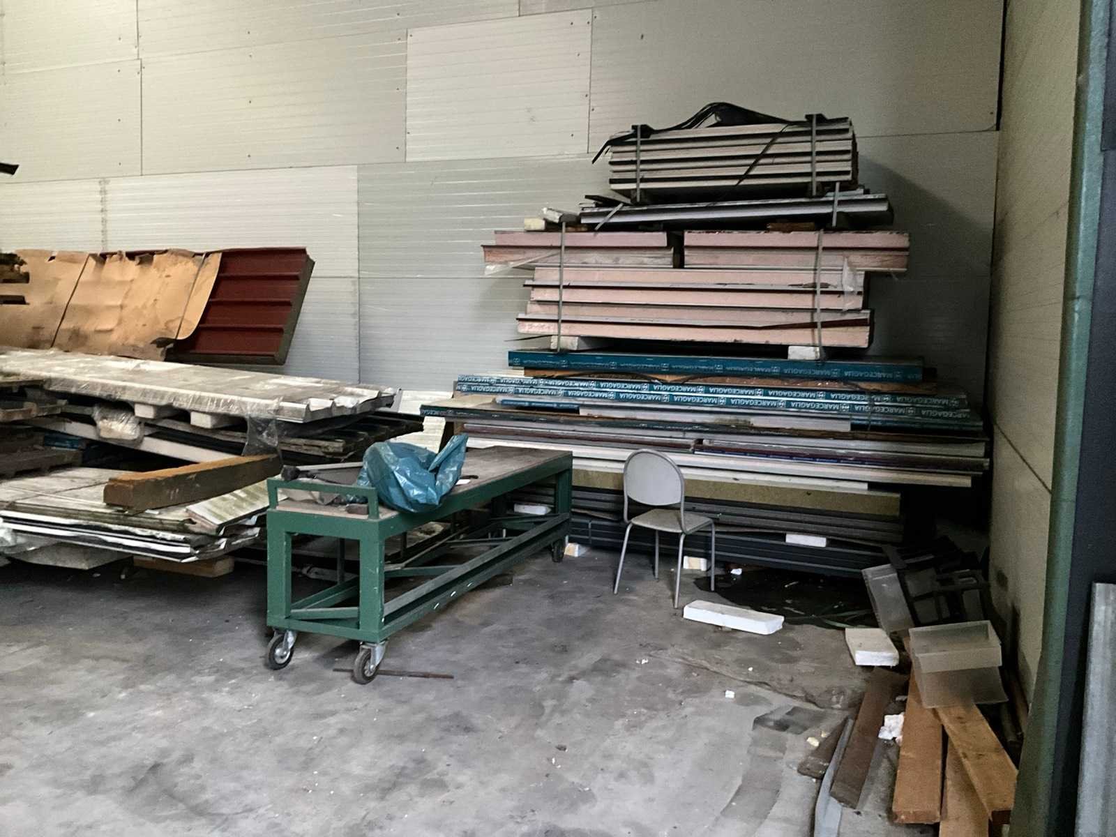 Bestaand uit grote partij diverse geïsoleerde en niet geïsoleerde dakpanelen, geïsoleerde wanden, mobiele werkbank, electrische platronde Prinzing Type RME527128, draagarmstelling met 2 staanders hoogte 3 meter en 6 liggers (demonteerbaar), 2x receptietafel enz…, alles gesitueerd op de grond, gesitueerd in gebouw achteraan nr 4 rechterkant Nee