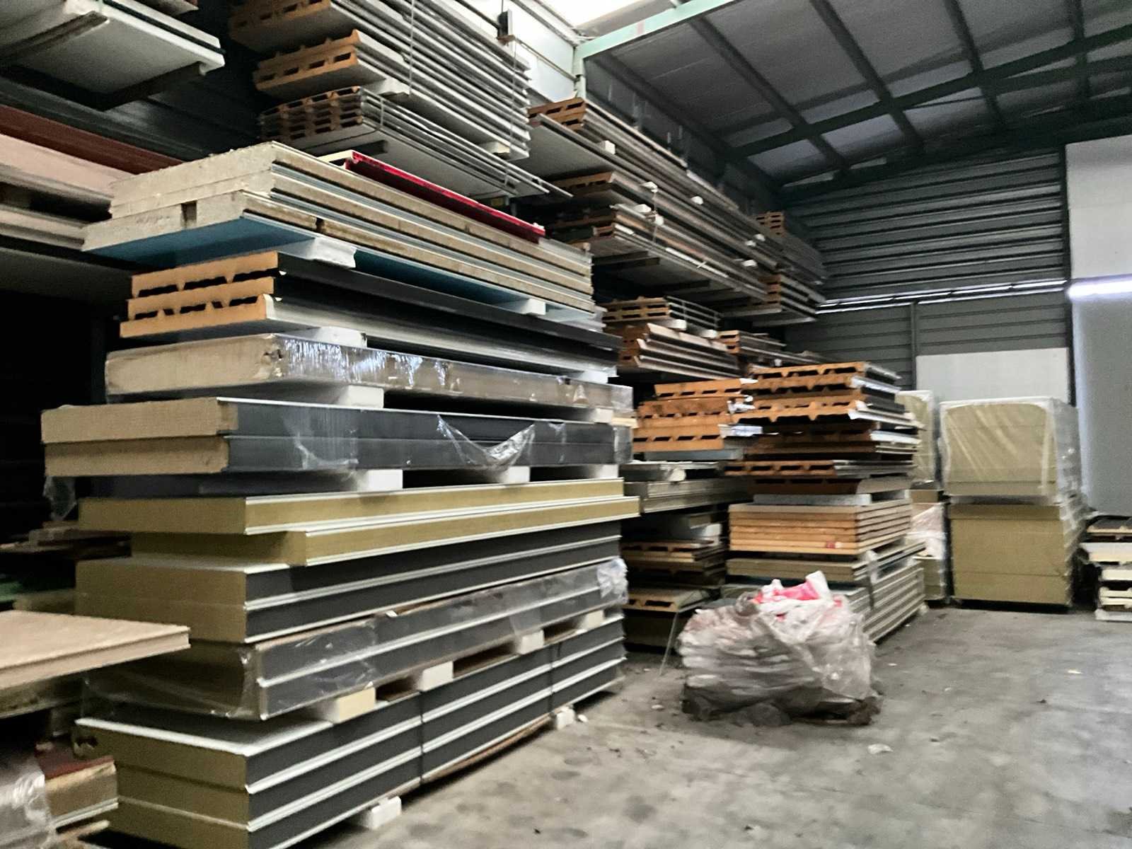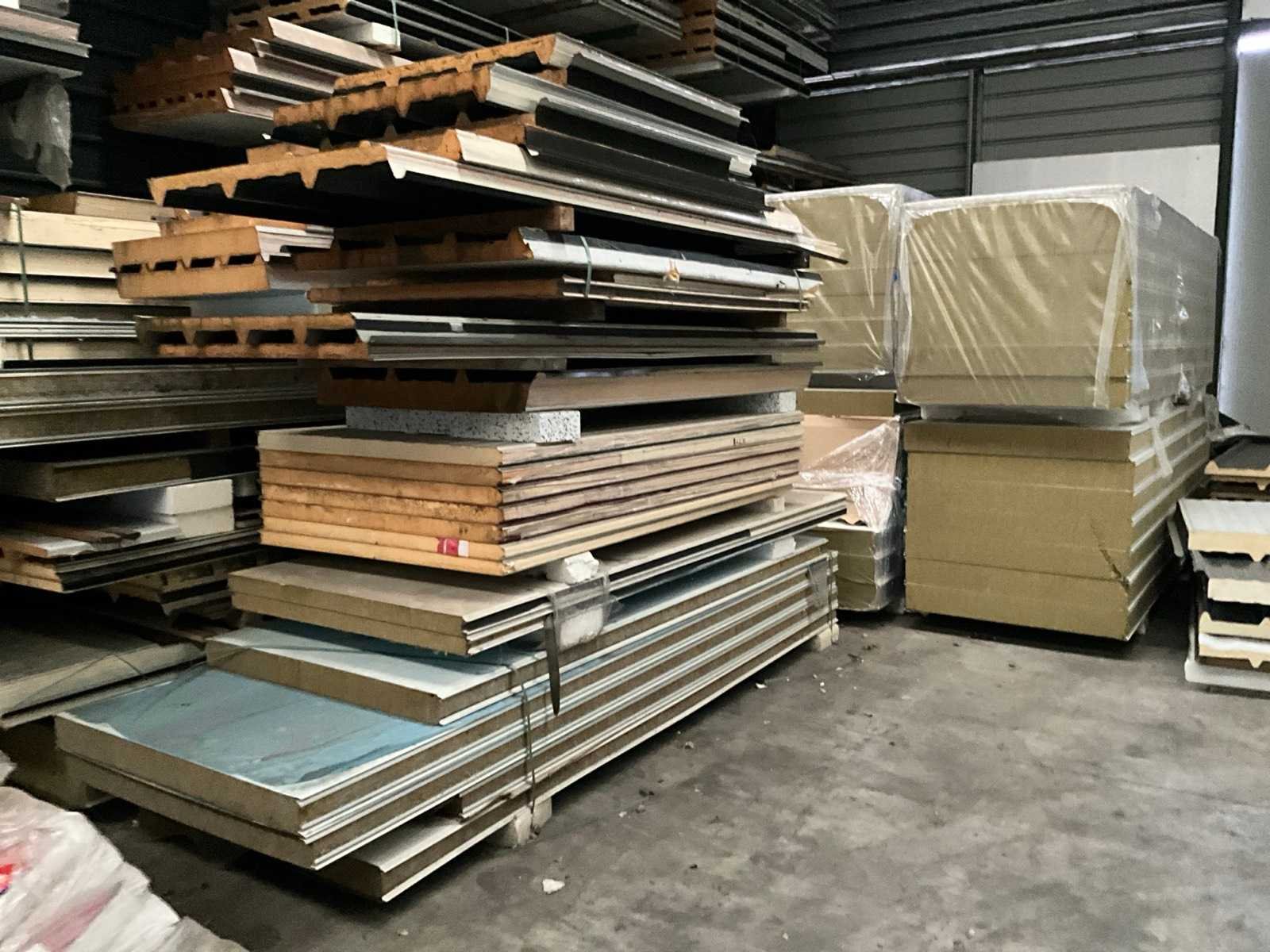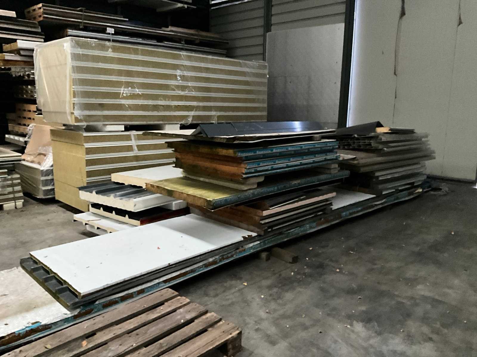 Bestaand uit grote partij diverse geïsoleerde en niet geïsoleerde dakpanelen, geïsoleerde wanden, strapbinder in lintzagen, banden, tuinstoelen enz…, alles ligt in vaste draagarmstelling en op de grond, (draagarmstelling NIET INBEGREPEN) gesitueerd in gebouw achteraan nr 4 linkerkant Nee