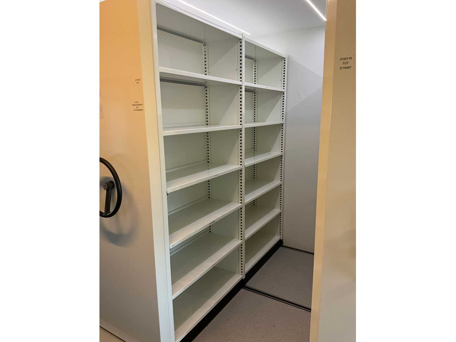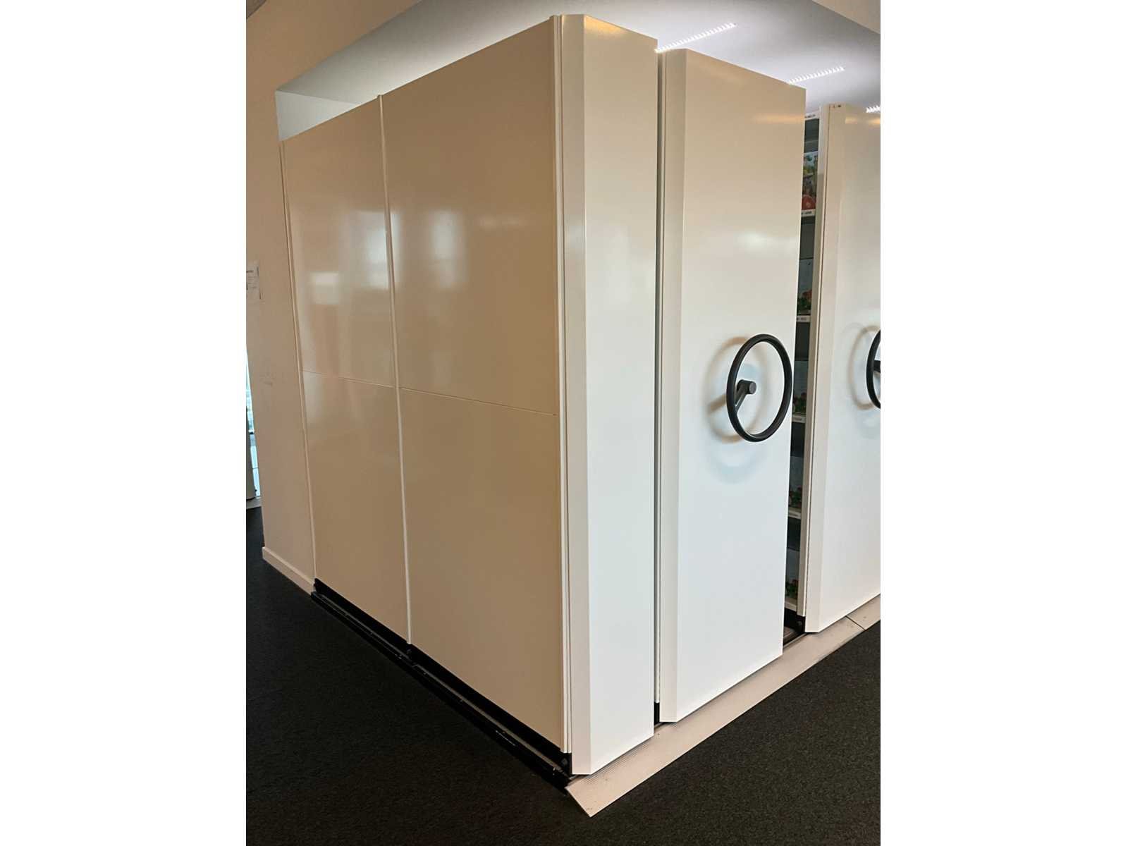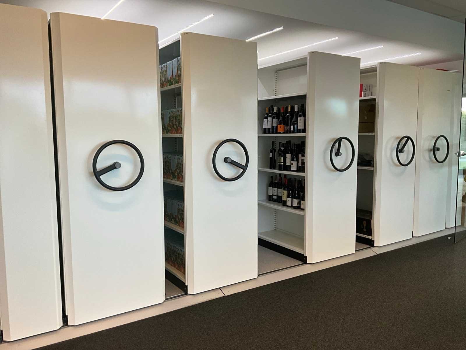 Totale afmetingen ca. 530x200x212cm. Voorzien van 5 dubbelzijdige rolkasten en 2 eindkasten. Nee