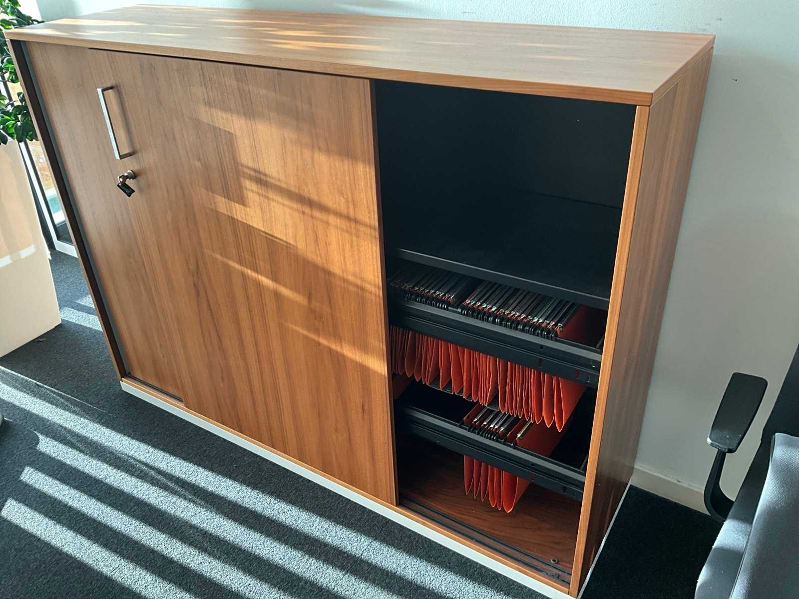 Inclusief 1x houten schuifdeurkast 160x43x117cm, met metalen leggers en dossierhouders. Nee Merk: Steelcase Lengte: 100cm Breedte: 200cm Hoogte: 72cm Materiaal: Hout, metaal