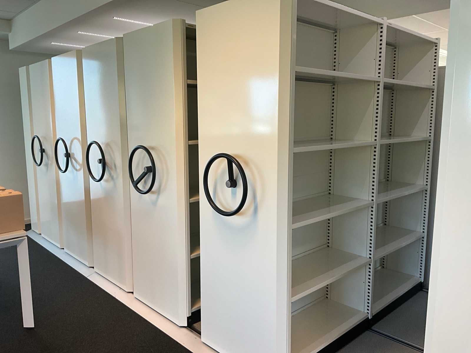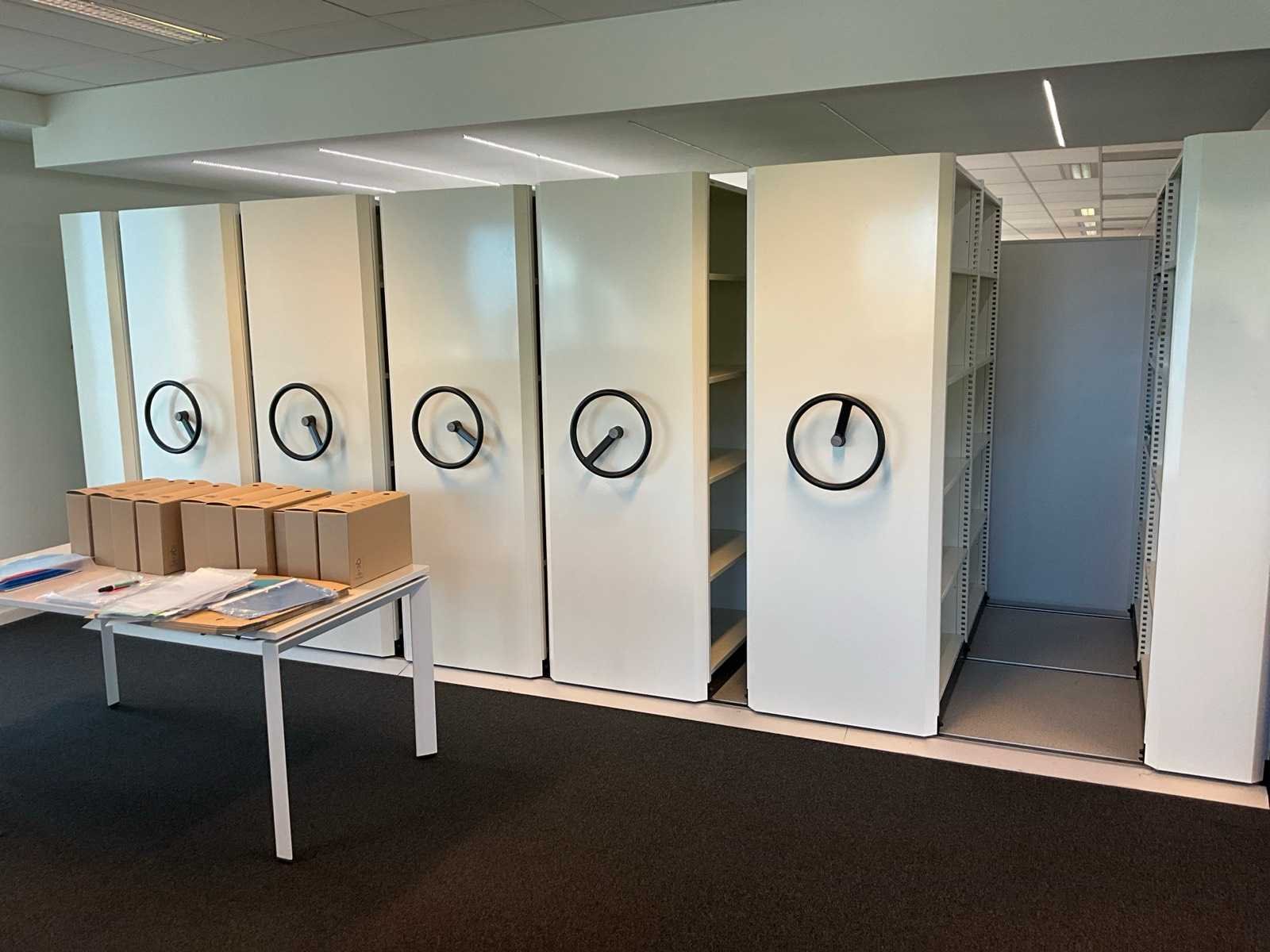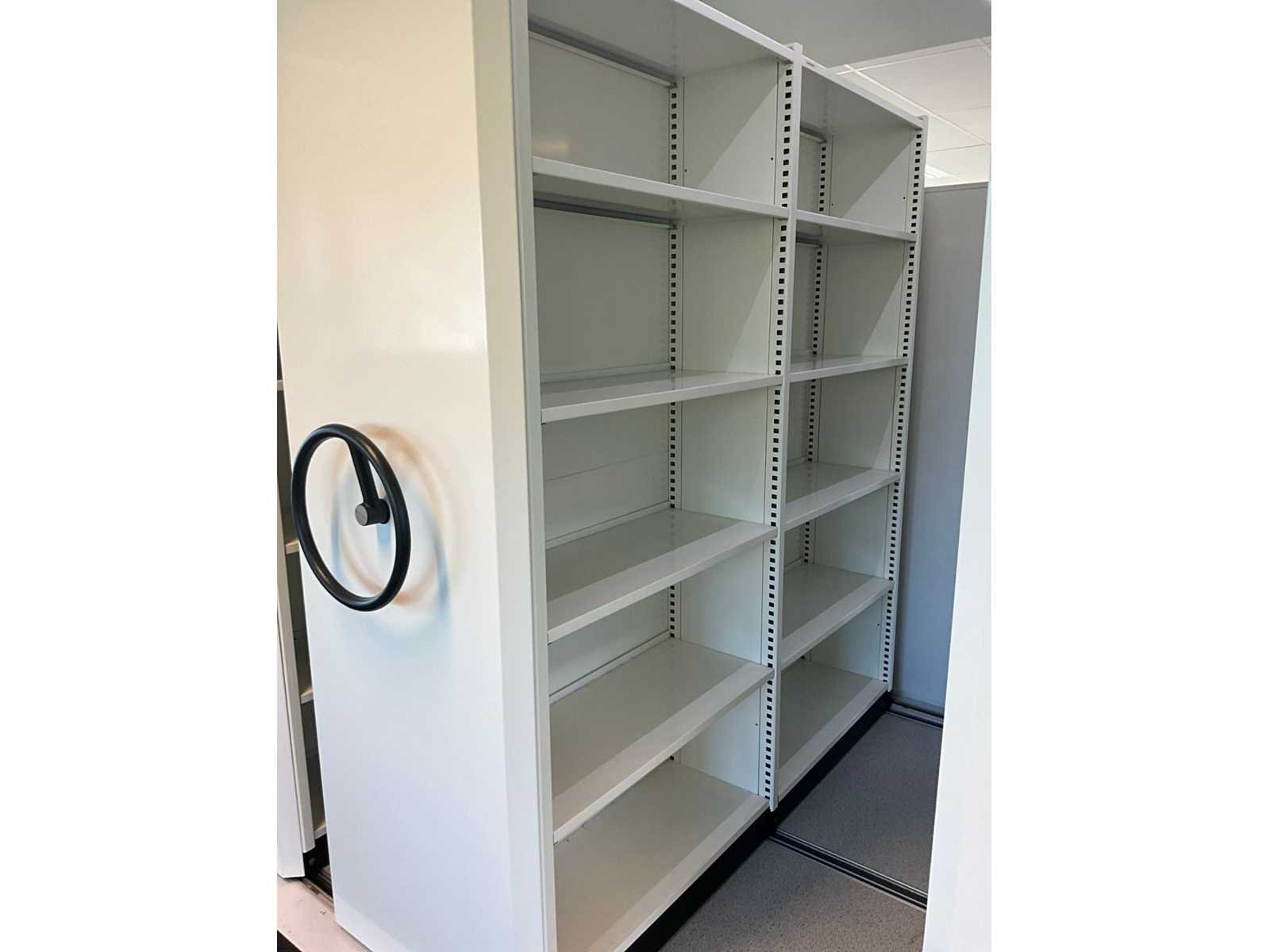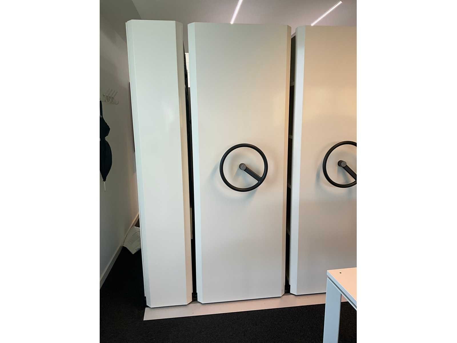 Totale afmetingen ca. 530x200x212cm. Voorzien van 5 dubbelzijdige rolkasten en 2 eindkasten. Nee