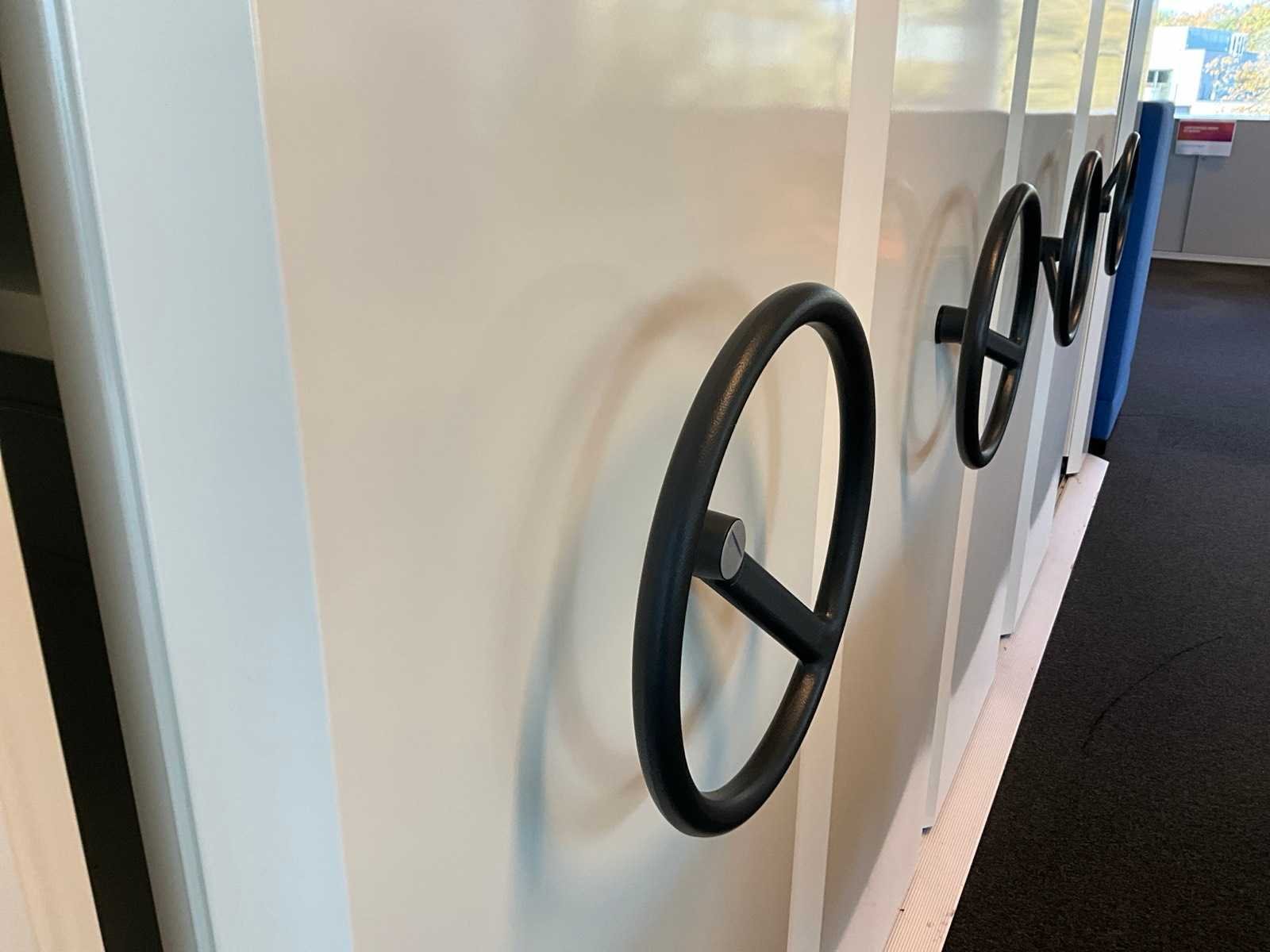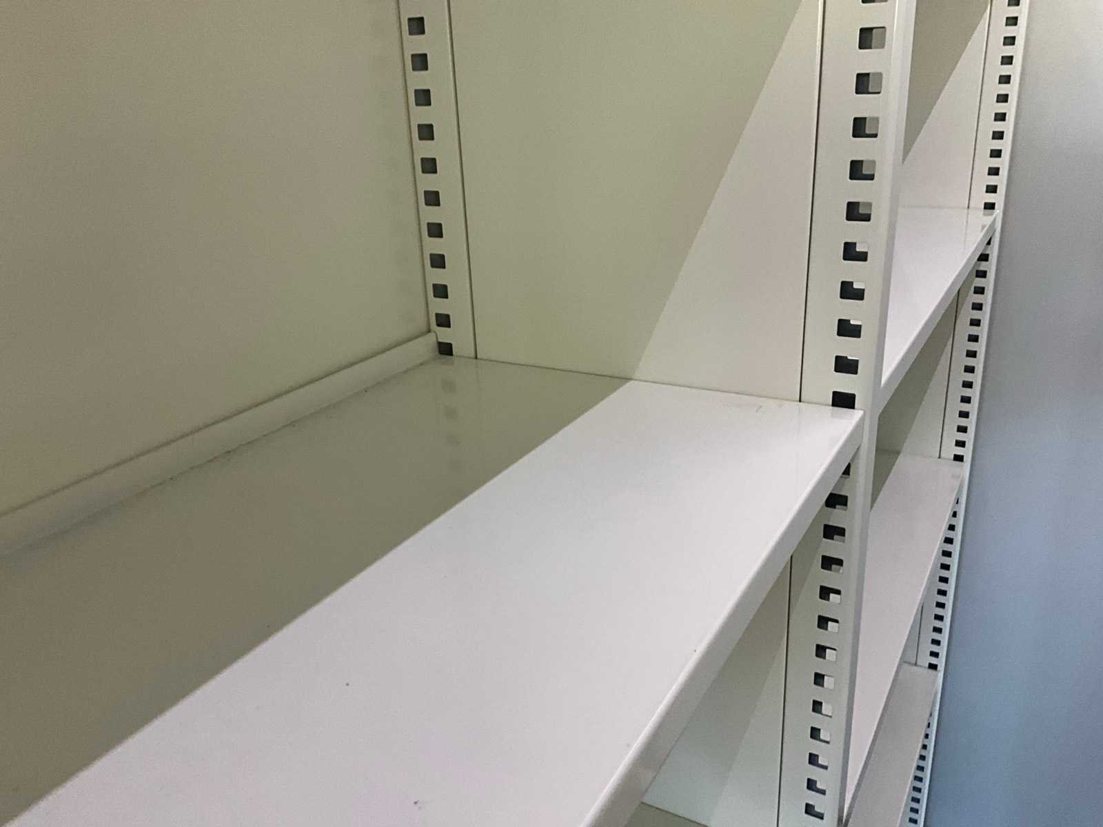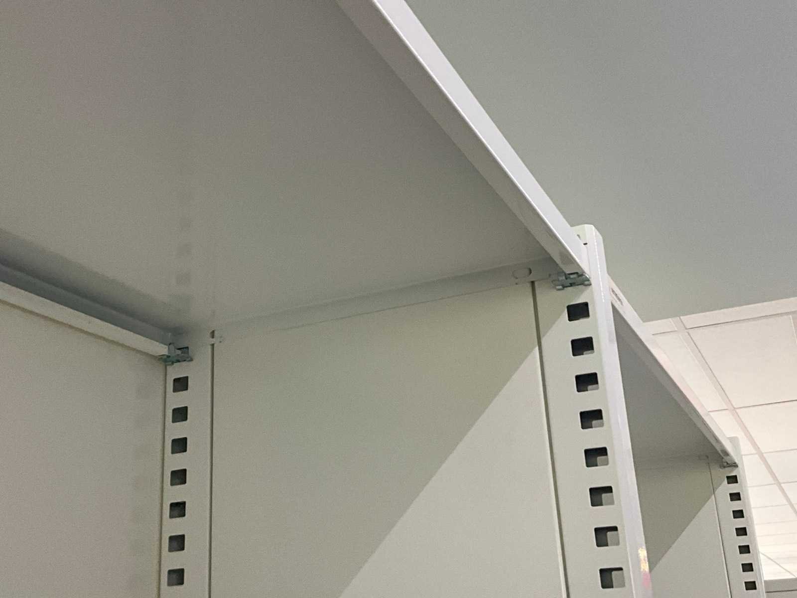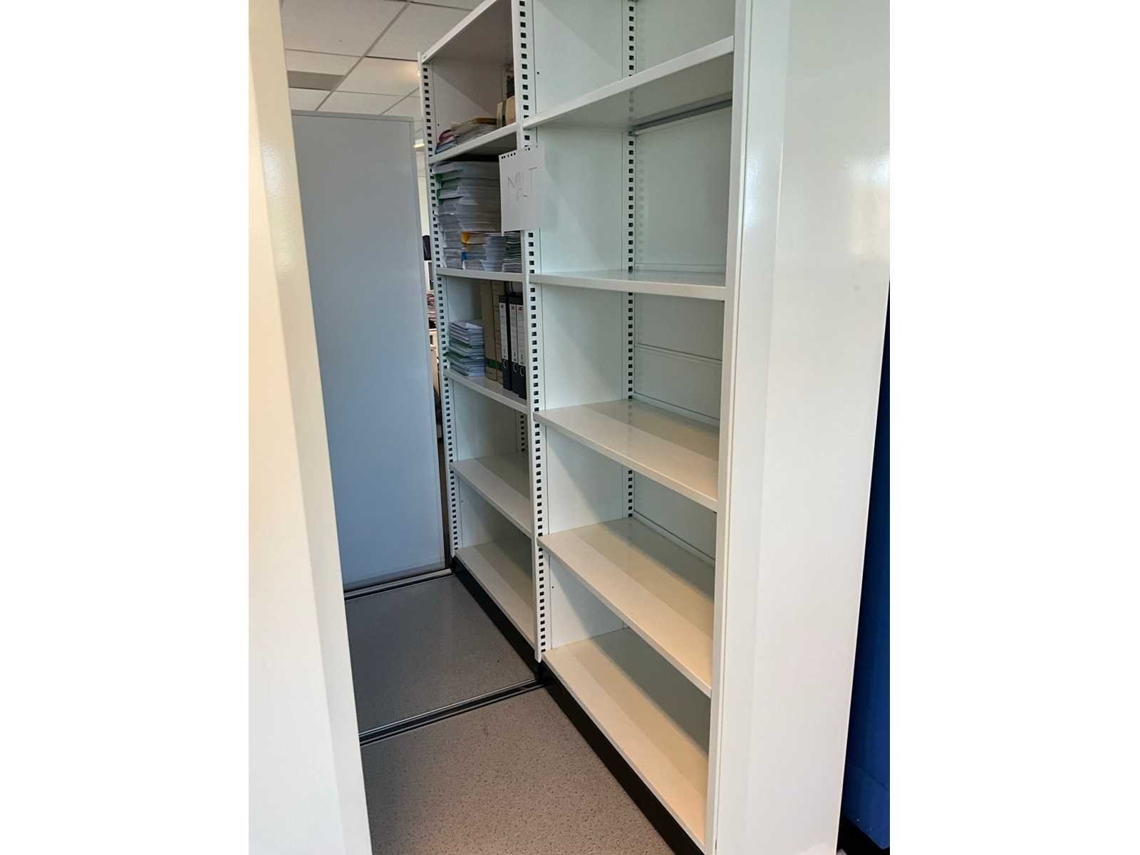 Totale afmetingen ca. 530x200x212cm. Voorzien van 5 dubbelzijdige rolkasten en 2 eindkasten. Nee