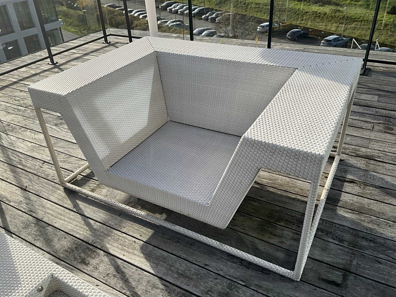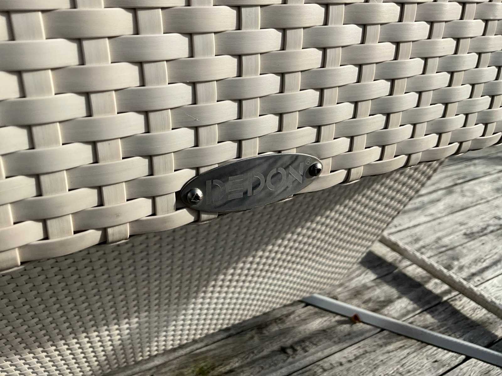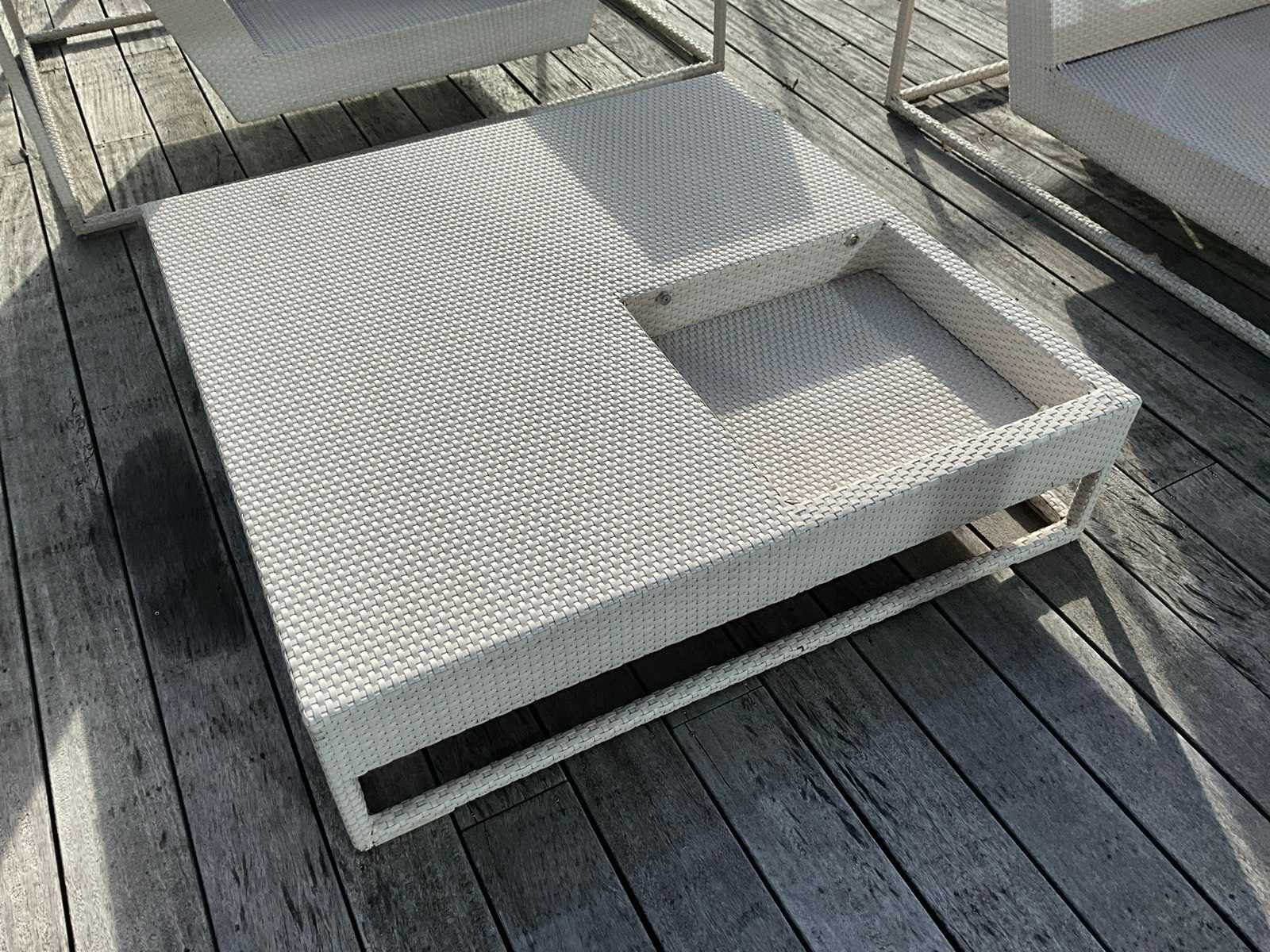 Bestaande uit 3 zetels en 1 tafel (glasplaatje ontbreekt). Zetels afmeting 158x113x72cm, tafel 112x112cm. Incl. 3 kussens Nee Merk: Dedon Materiaal: Kunststof