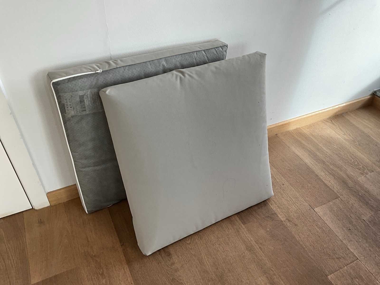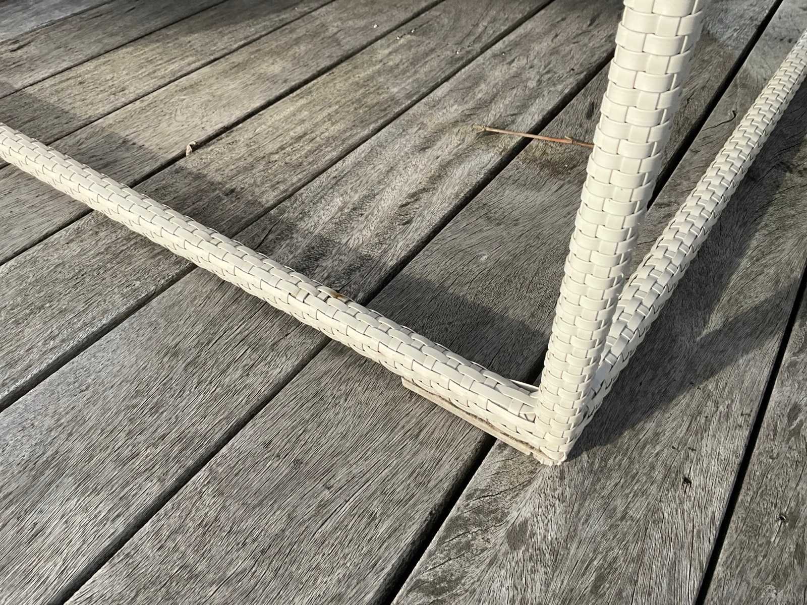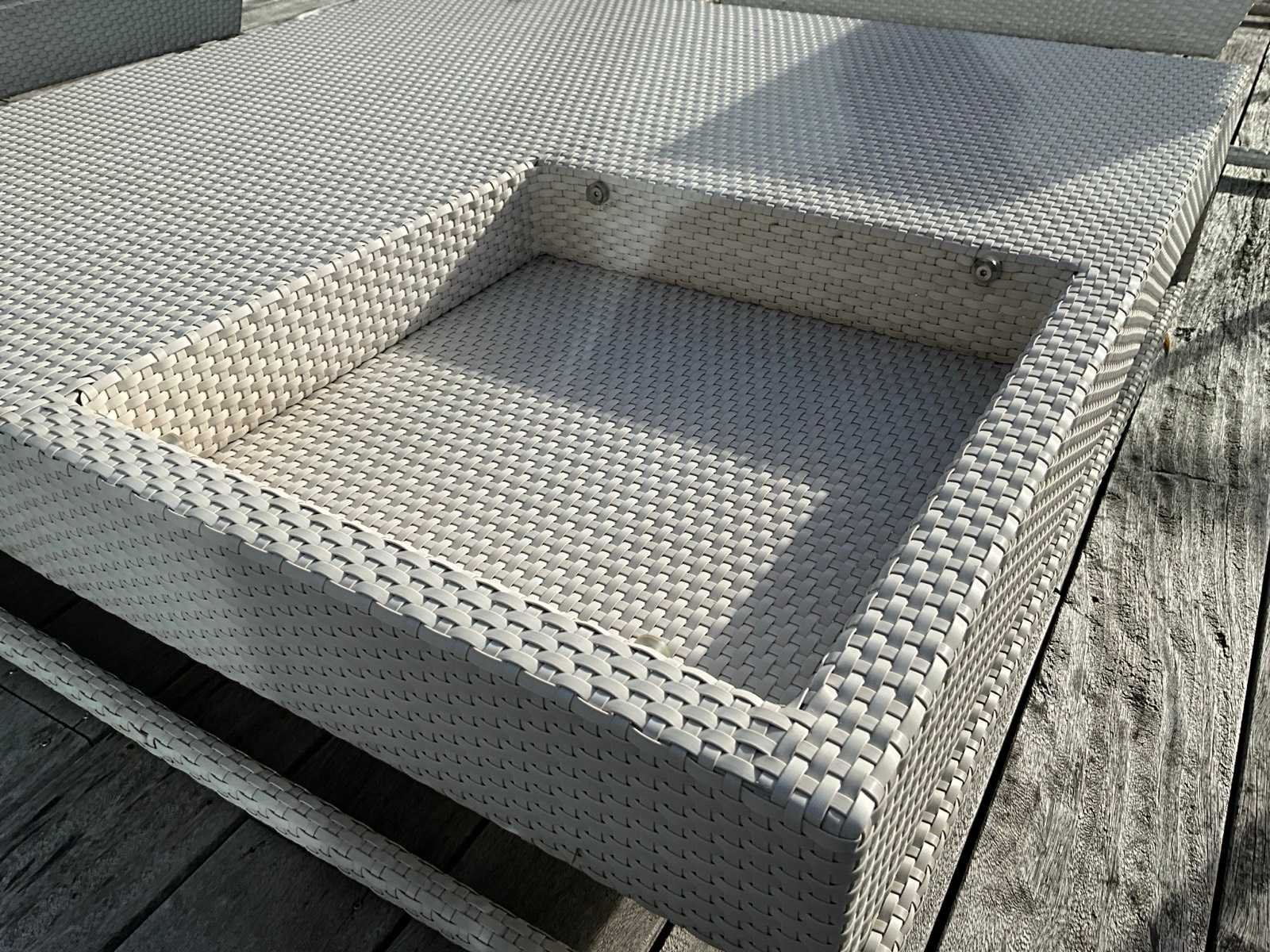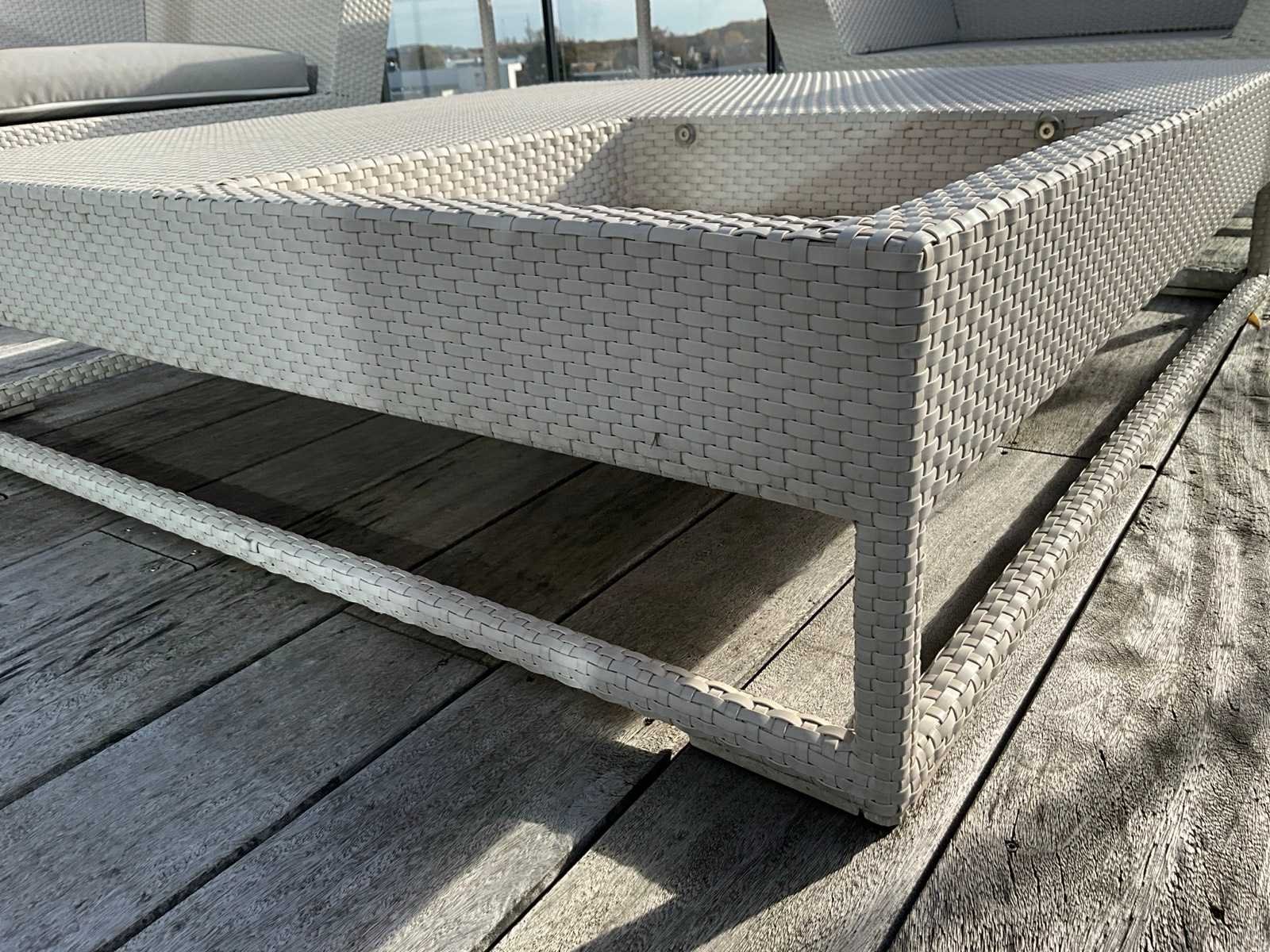 Bestaande uit 3 zetels en 1 tafel (glasplaatje ontbreekt). Zetels afmeting 158x113x72cm, tafel 112x112cm. Incl. 3 kussens Nee Merk: Dedon Materiaal: Kunststof