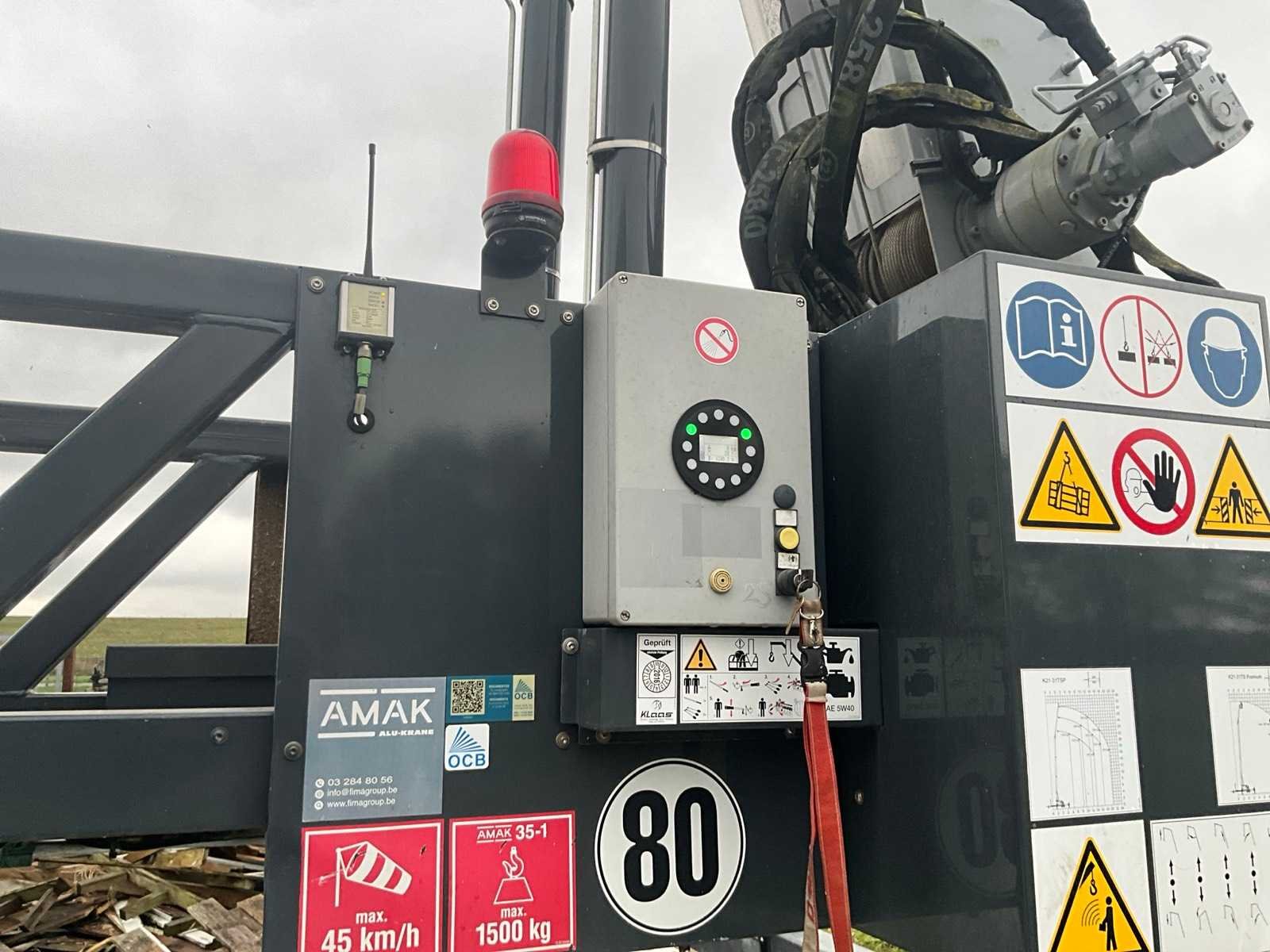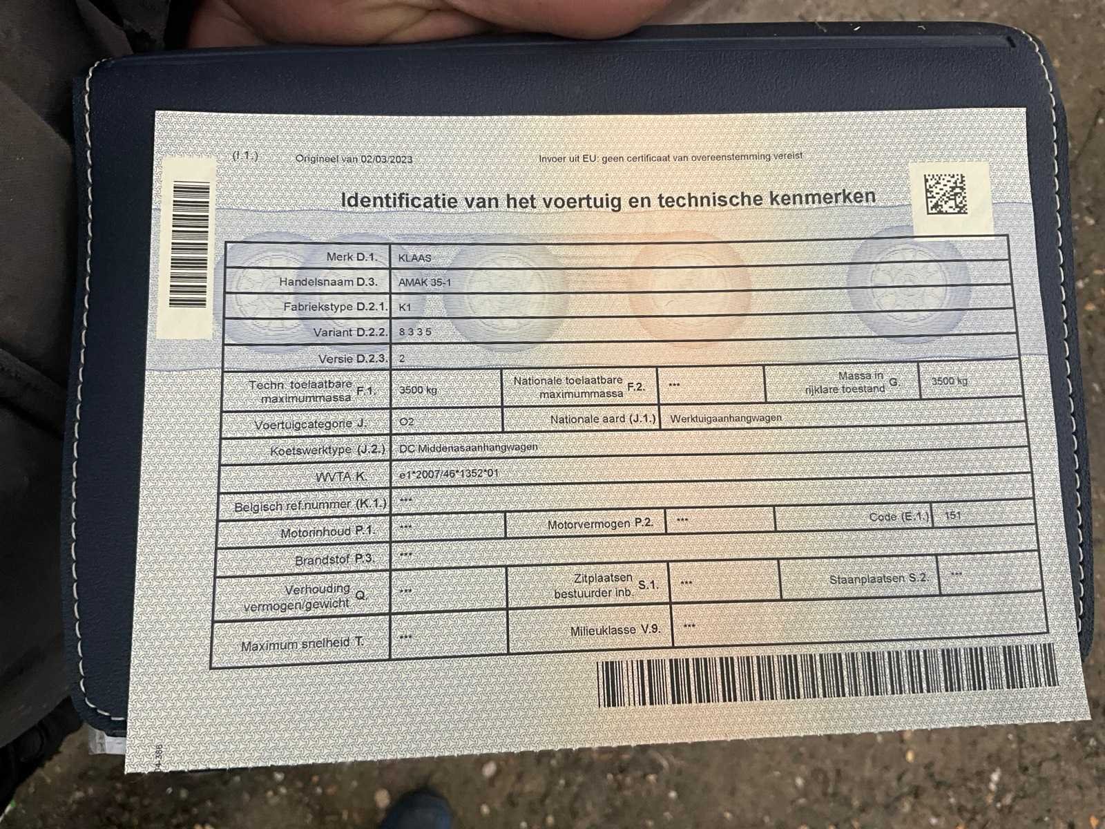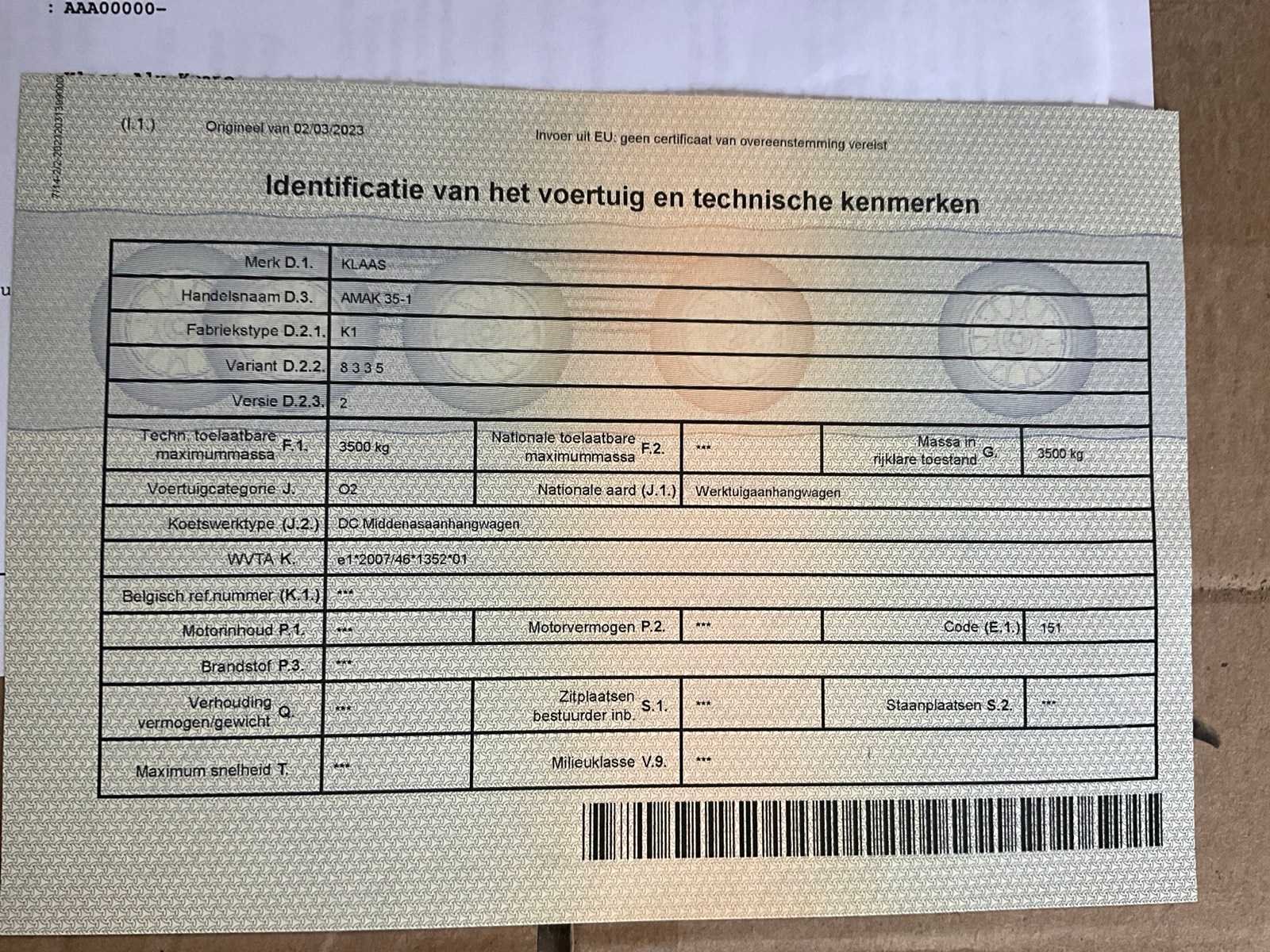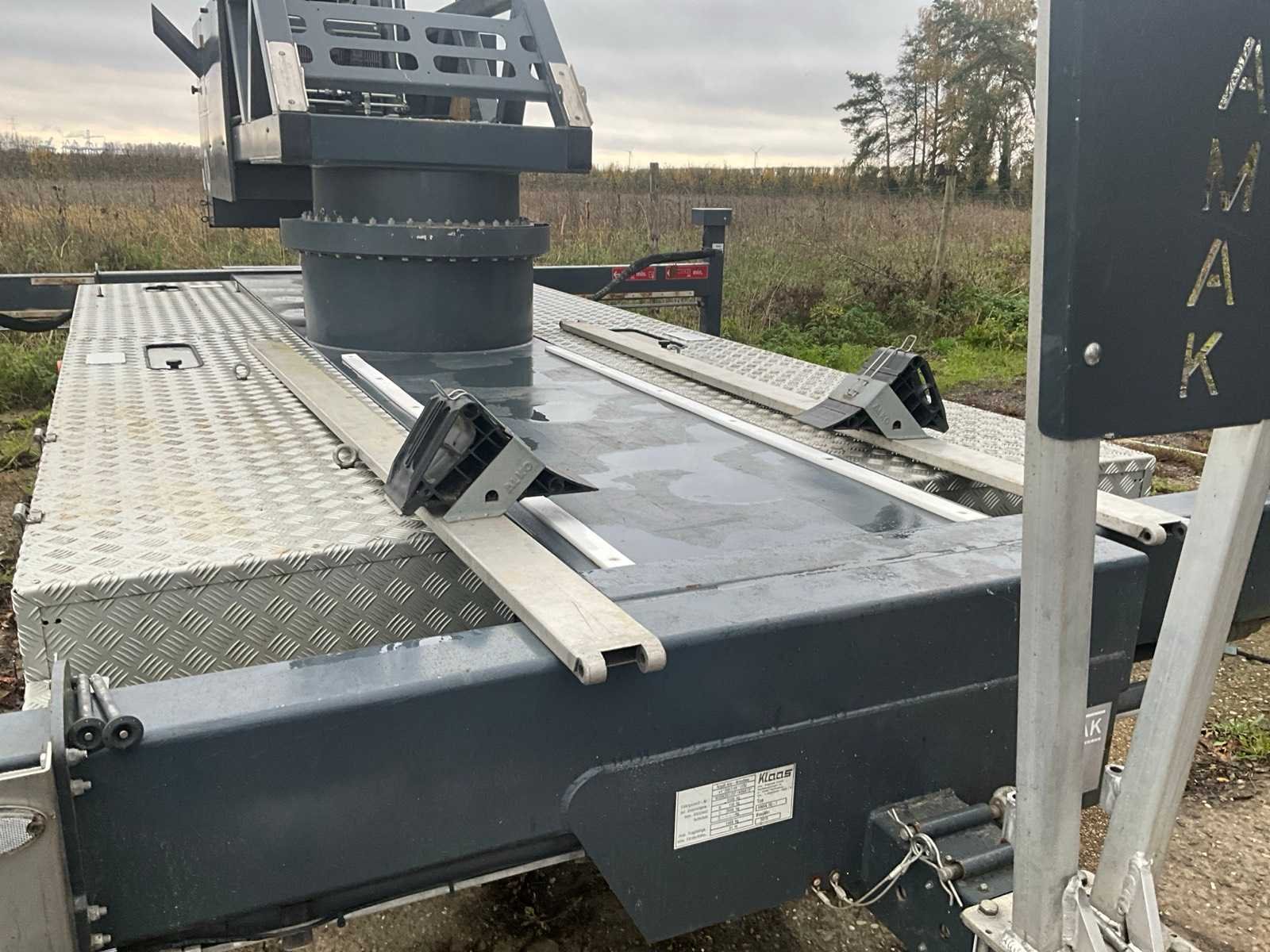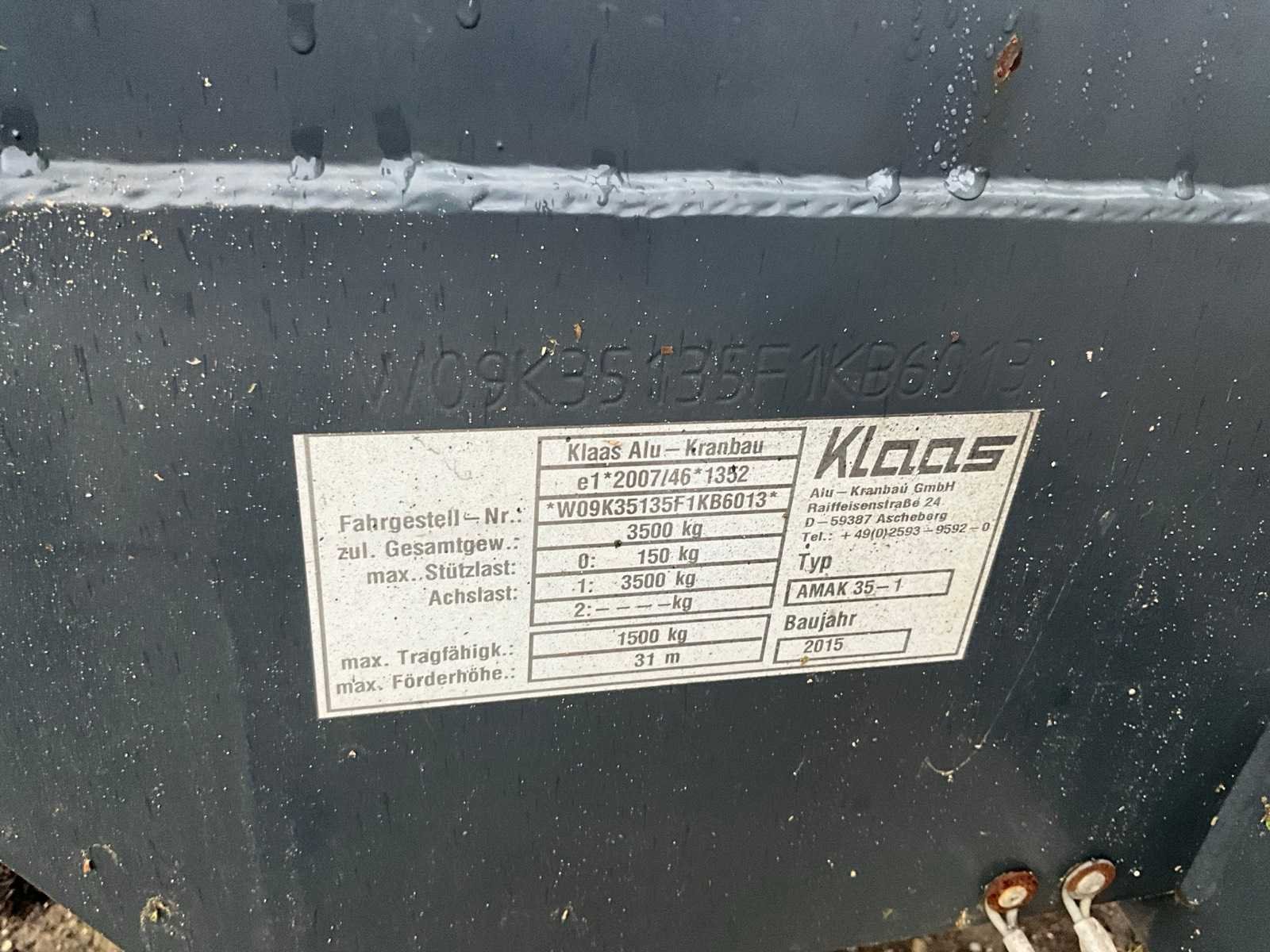 Compacte alu aanhangerkraan voorzien van volhydraulische knikarm en asc-besturing met afstandsbediening. Reikwijdte tot 20,5 m, met max. 250 kg. Kraan gemeten zonder dissel, voorzien van inschuifbare dissel AL-KO 2,8 VB/1 van totaal 4 lpm lengte, steunonderstel kraan voorzien van 4 hydraulische poten nog uitschuifbaar tot 150 cm langs beide zijden. Kentekenbewijs deel I en II aanwezig en gelijkvormigheidsattest. No Merk: Klaas Type: AMAK 35-1 Bouwjaar: 2015 Serienummer: W09K35135F1KB6013 chassis Kenteken: Q-AQJ-213 Aantal assen: 1 Max. hijshoogte: 31m Gieklengte: 20.5m Afgelezen urenstand: 1340hr Totale afmeting L: 5200mm Totale afmeting Breedte: 2200mm Max. hijscapaciteit: 1500kg