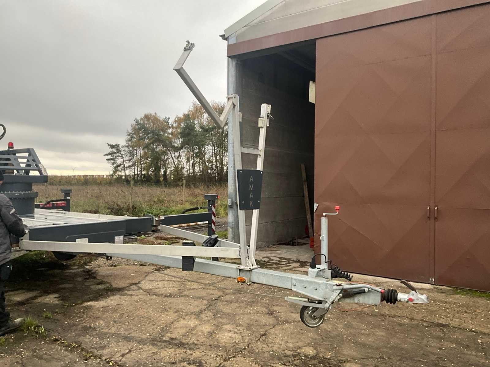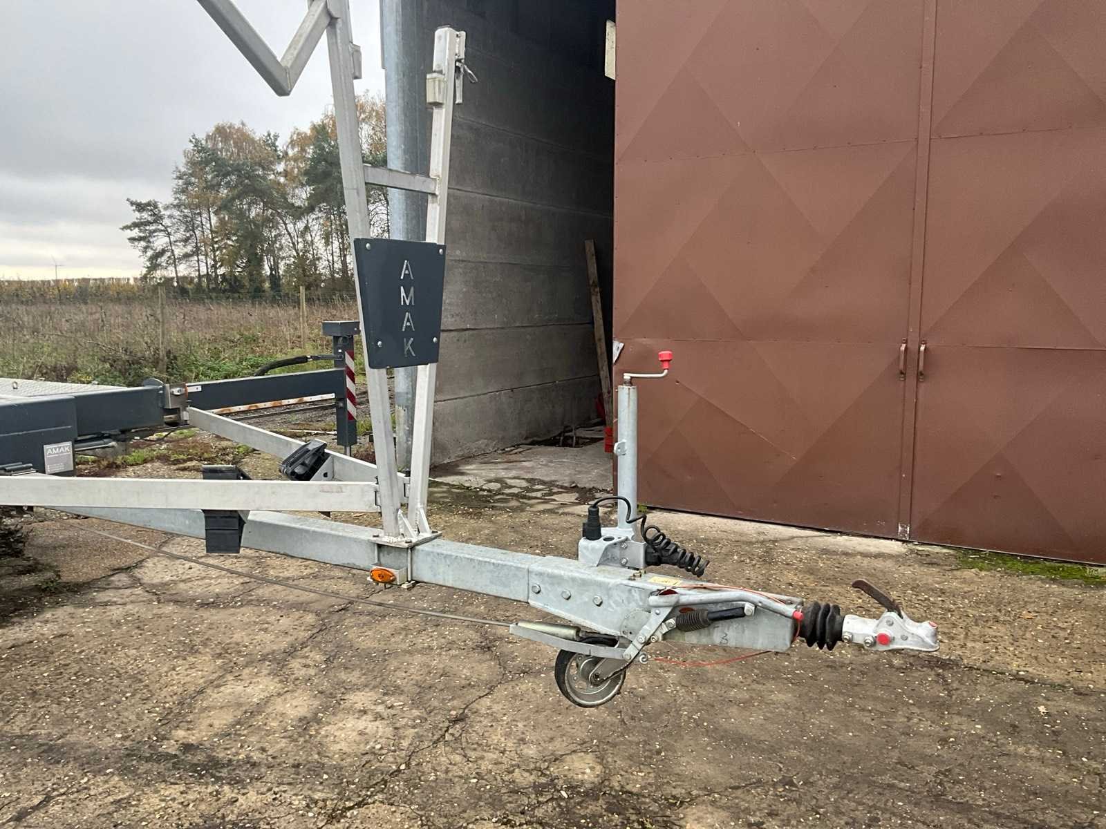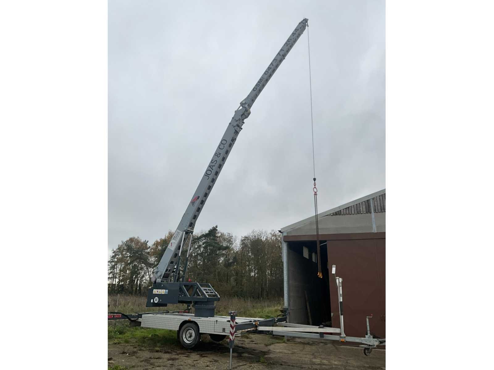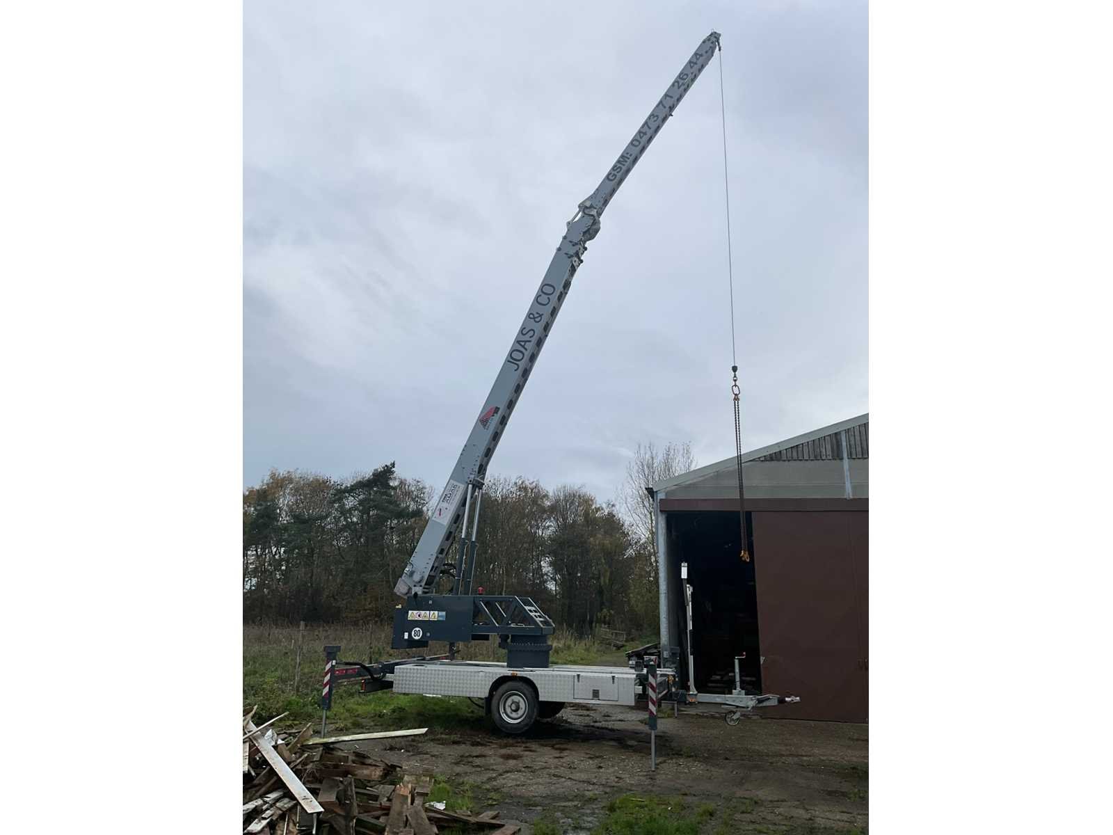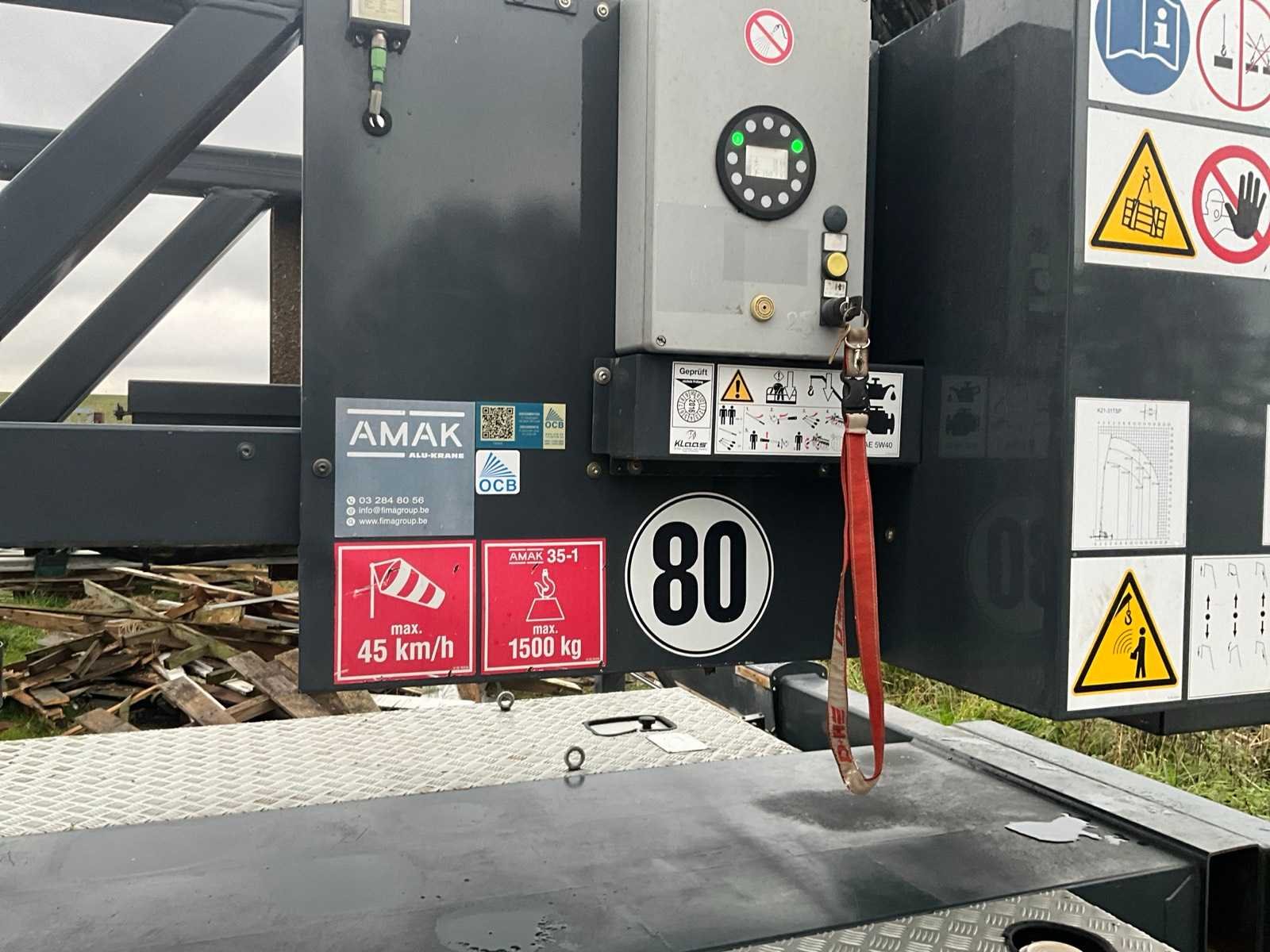 Compacte alu aanhangerkraan voorzien van volhydraulische knikarm en asc-besturing met afstandsbediening. Reikwijdte tot 20,5 m, met max. 250 kg. Kraan gemeten zonder dissel, voorzien van inschuifbare dissel AL-KO 2,8 VB/1 van totaal 4 lpm lengte, steunonderstel kraan voorzien van 4 hydraulische poten nog uitschuifbaar tot 150 cm langs beide zijden. Kentekenbewijs deel I en II aanwezig en gelijkvormigheidsattest. No Merk: Klaas Type: AMAK 35-1 Bouwjaar: 2015 Serienummer: W09K35135F1KB6013 chassis Kenteken: Q-AQJ-213 Aantal assen: 1 Max. hijshoogte: 31m Gieklengte: 20.5m Afgelezen urenstand: 1340hr Totale afmeting L: 5200mm Totale afmeting Breedte: 2200mm Max. hijscapaciteit: 1500kg