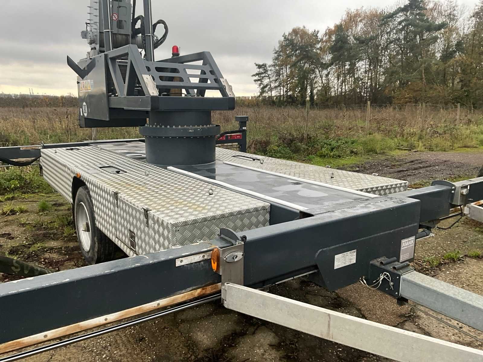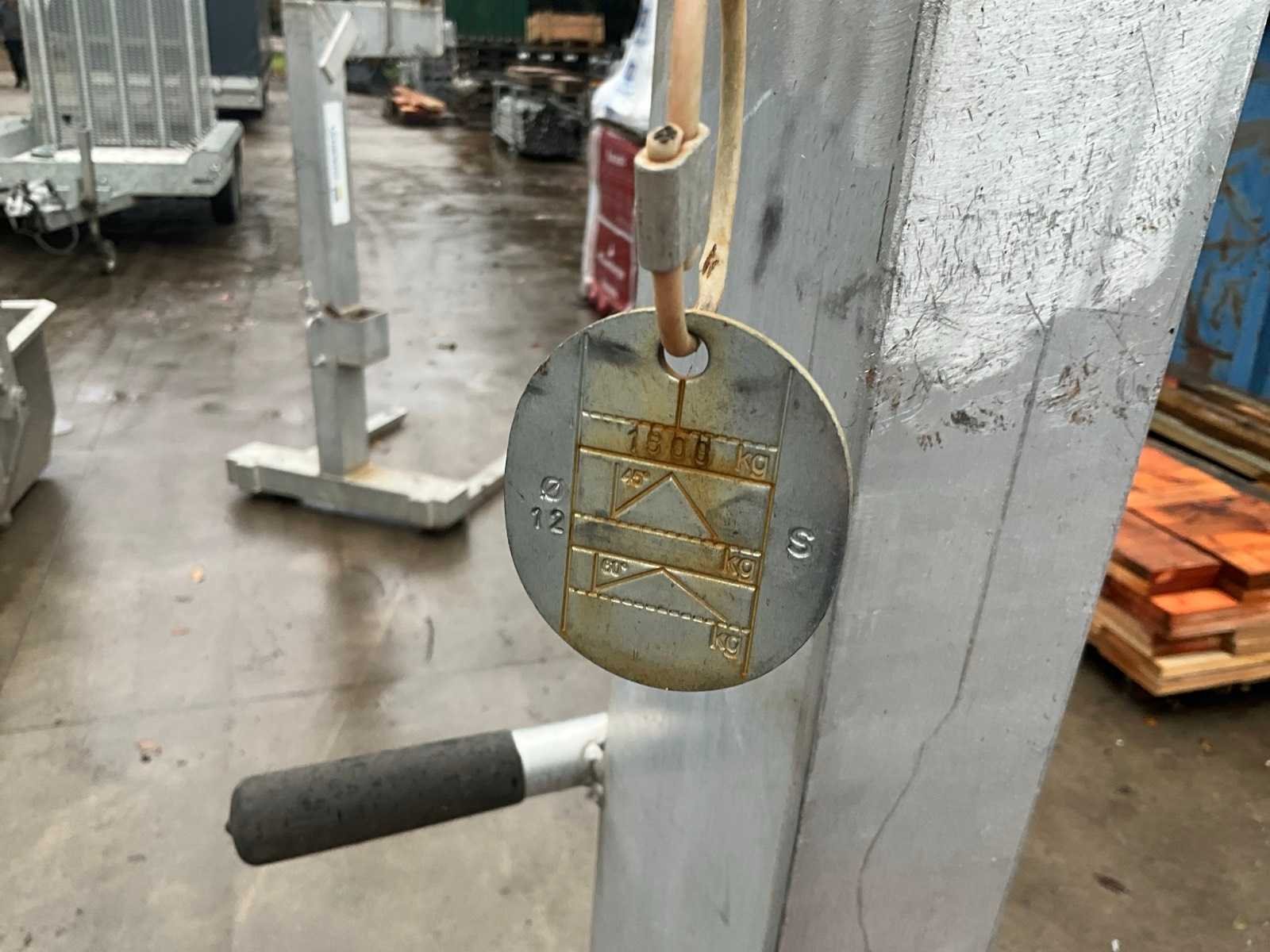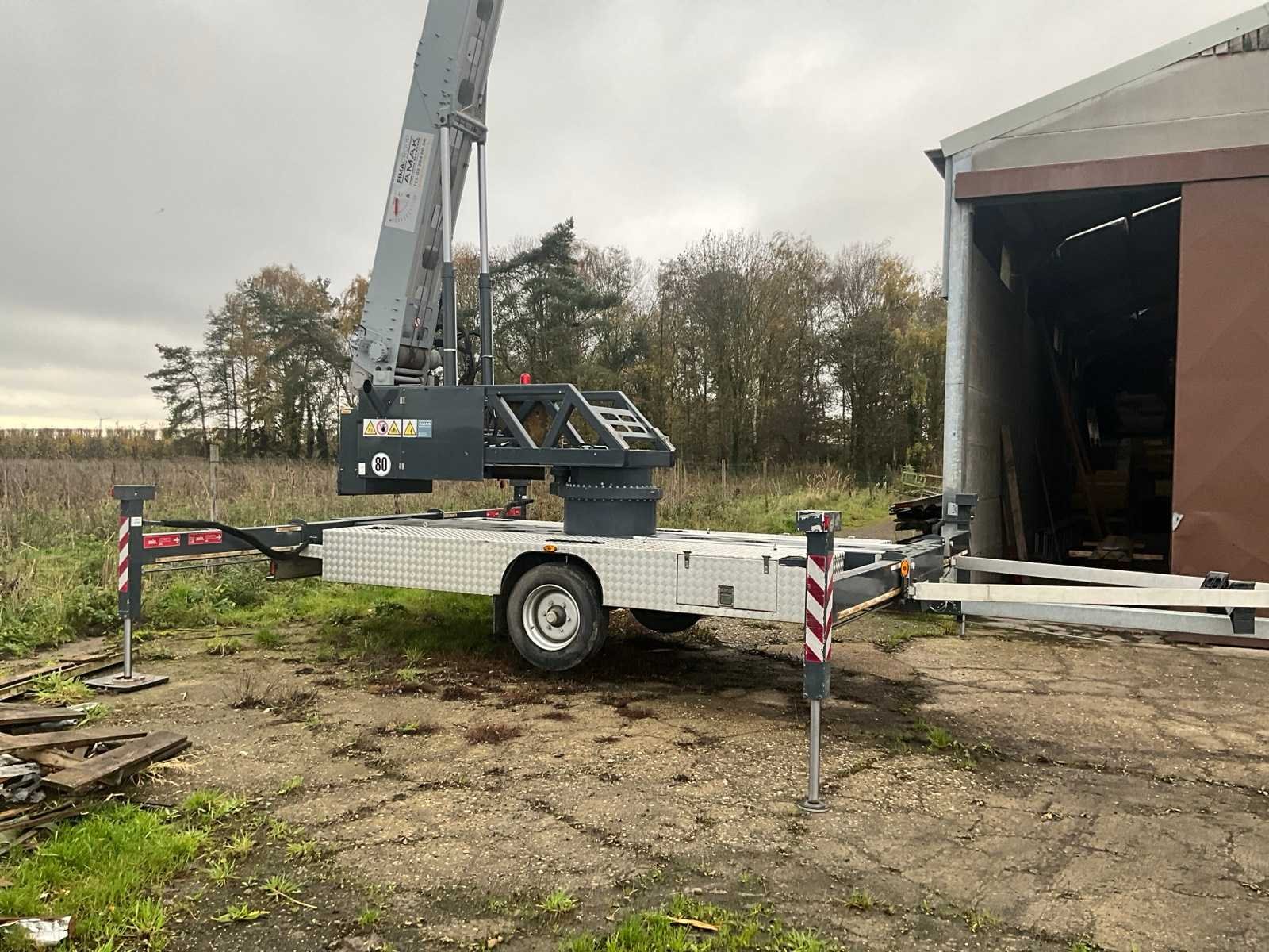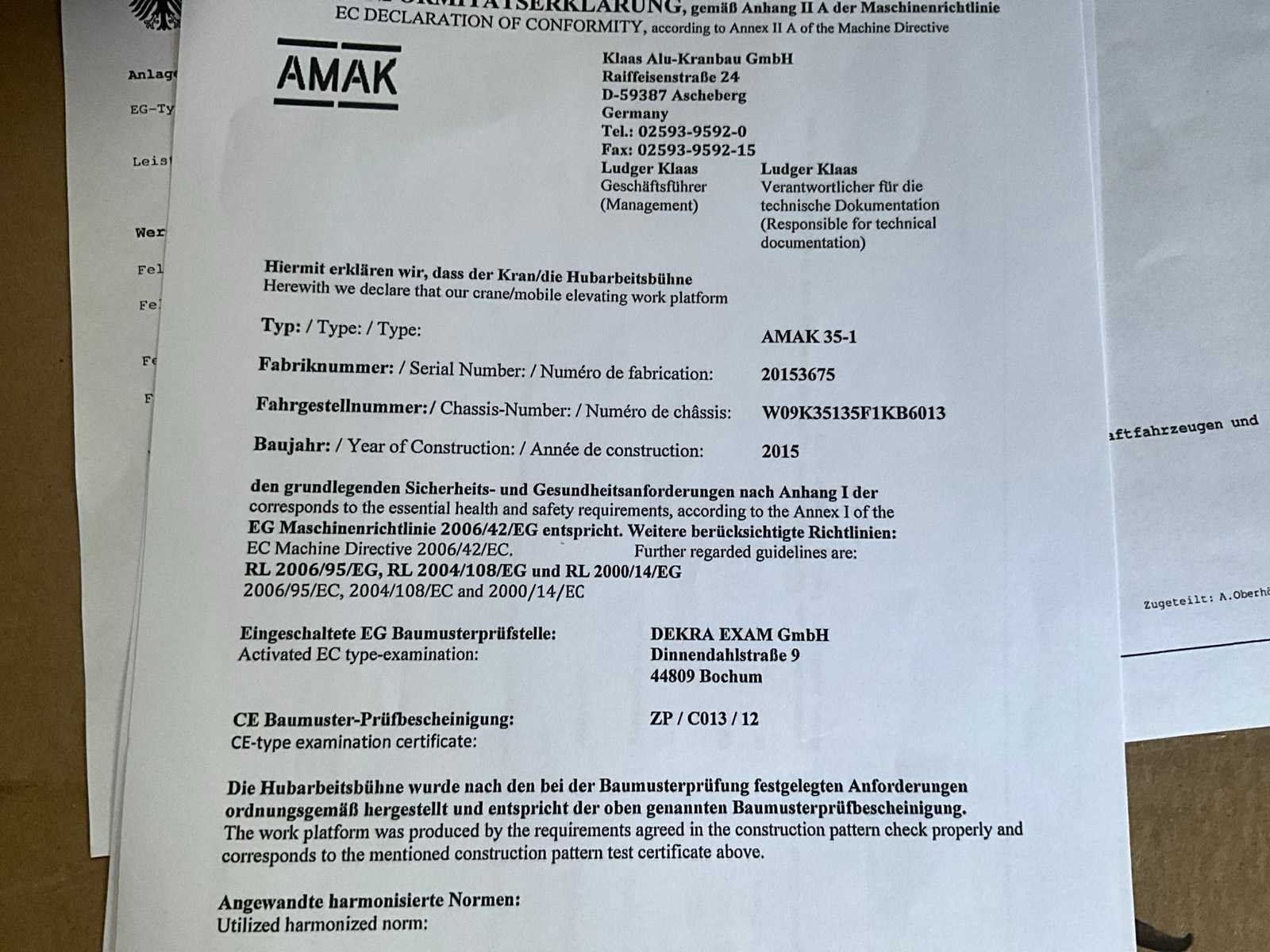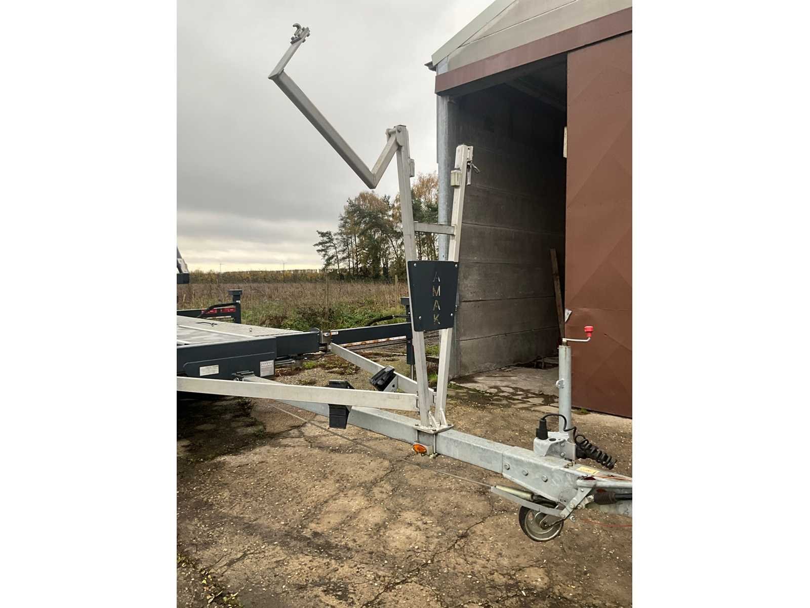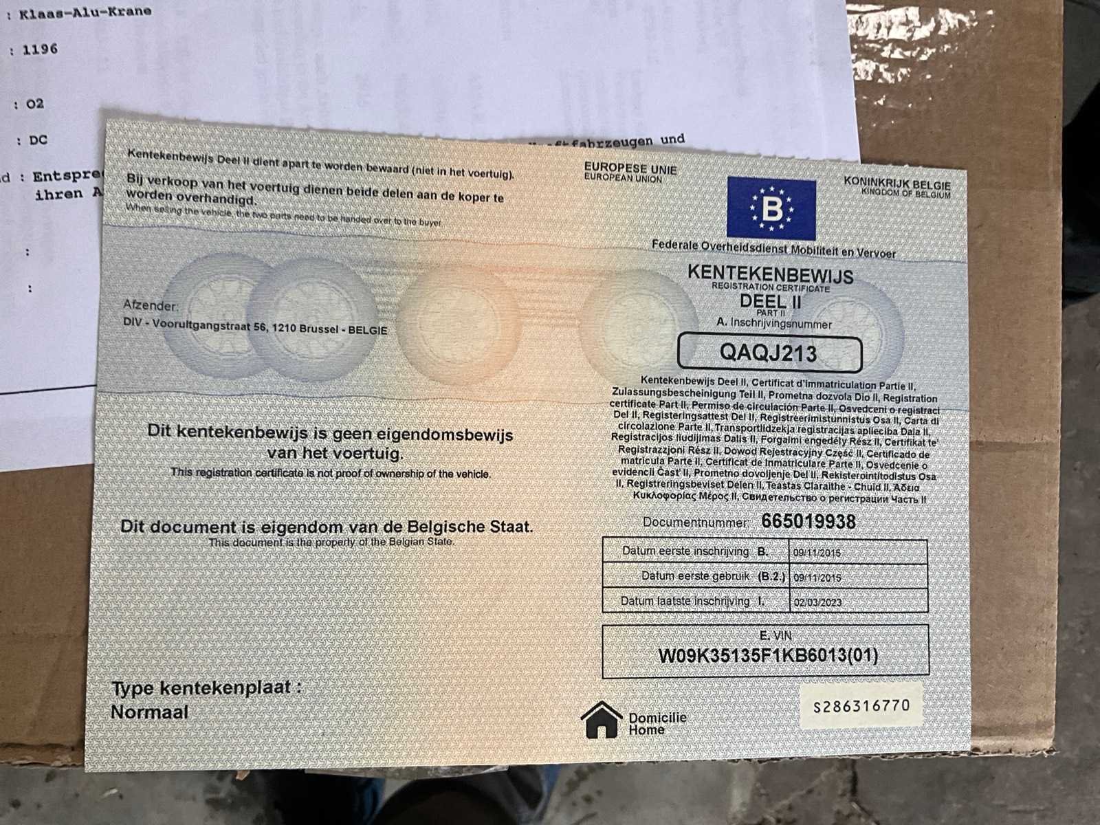 Compacte alu aanhangerkraan voorzien van volhydraulische knikarm en asc-besturing met afstandsbediening. Reikwijdte tot 20,5 m, met max. 250 kg. Kraan gemeten zonder dissel, voorzien van inschuifbare dissel AL-KO 2,8 VB/1 van totaal 4 lpm lengte, steunonderstel kraan voorzien van 4 hydraulische poten nog uitschuifbaar tot 150 cm langs beide zijden. Kentekenbewijs deel I en II aanwezig en gelijkvormigheidsattest. No Merk: Klaas Type: AMAK 35-1 Bouwjaar: 2015 Serienummer: W09K35135F1KB6013 chassis Kenteken: Q-AQJ-213 Aantal assen: 1 Max. hijshoogte: 31m Gieklengte: 20.5m Afgelezen urenstand: 1340hr Totale afmeting L: 5200mm Totale afmeting Breedte: 2200mm Max. hijscapaciteit: 1500kg