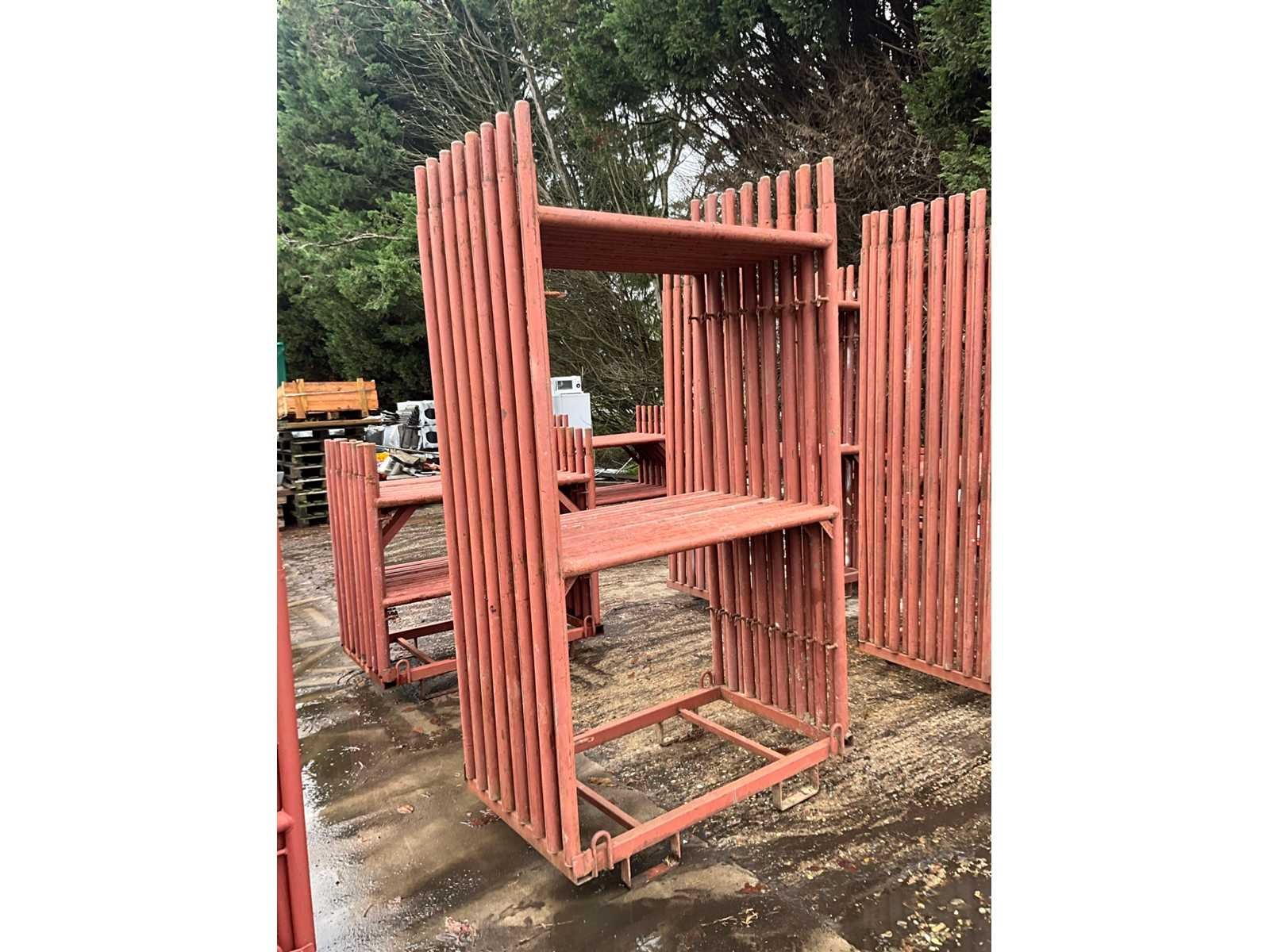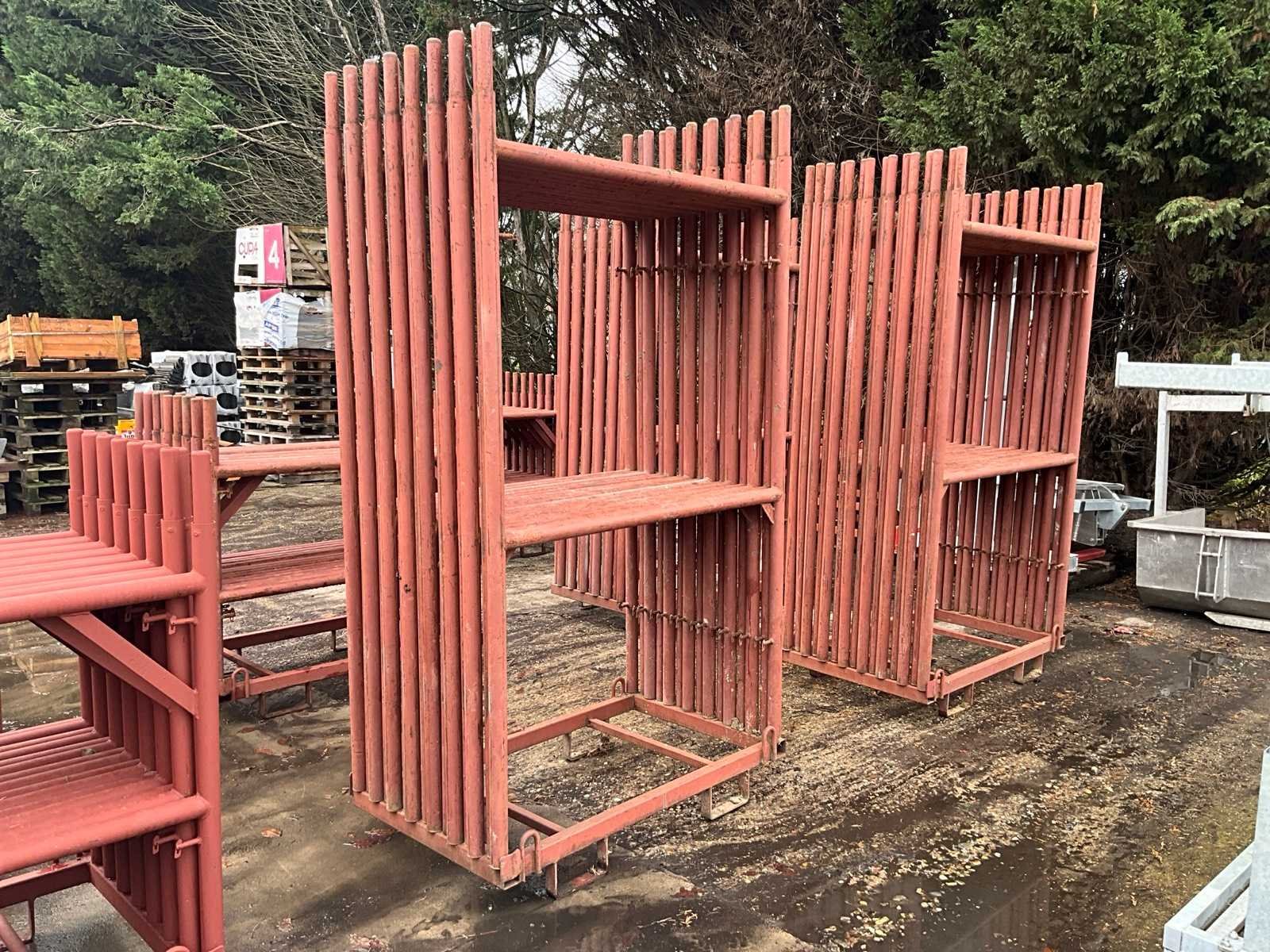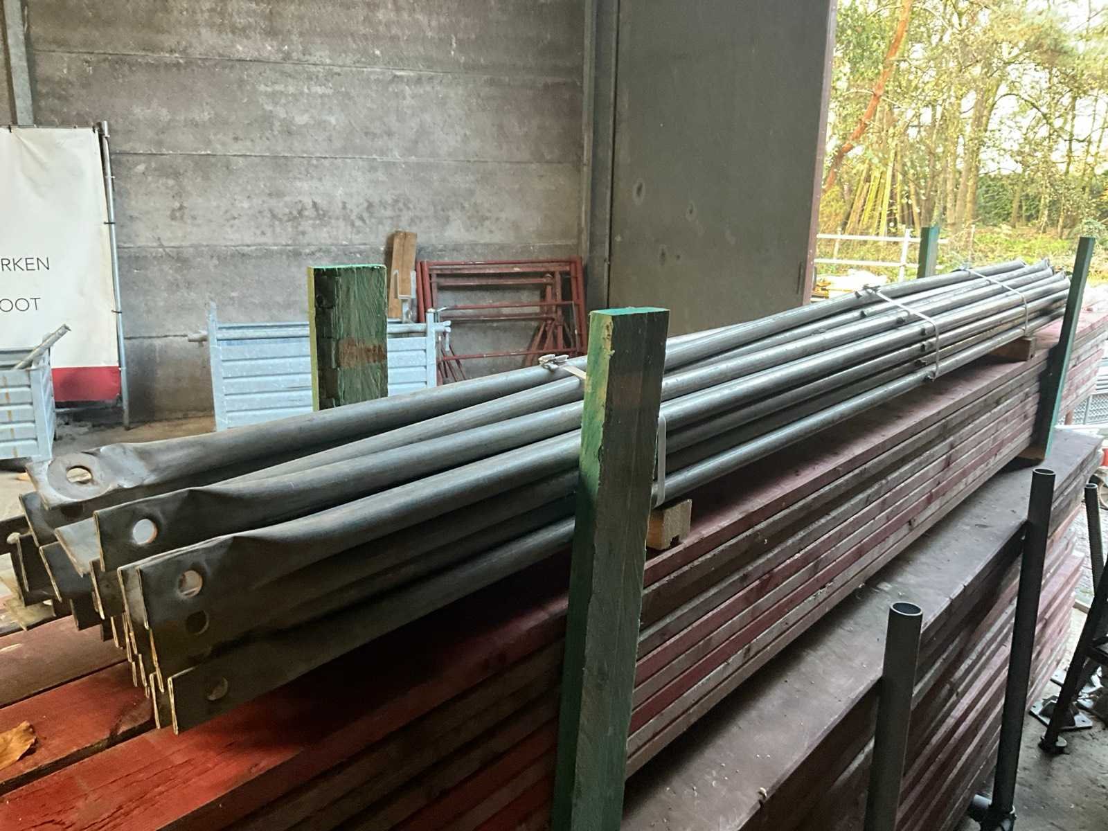 Metalen staanders zo goed als nieuw, elk met afmeting 130 x 215 cm hoog op bijhorende stapelbok. KL4. Compleet met 15 bijhorende diagonalen, elk 290 cm lang. Nee Totale afmeting Breedte: 130mm Totale afmeting Hoogte: 1150mm
