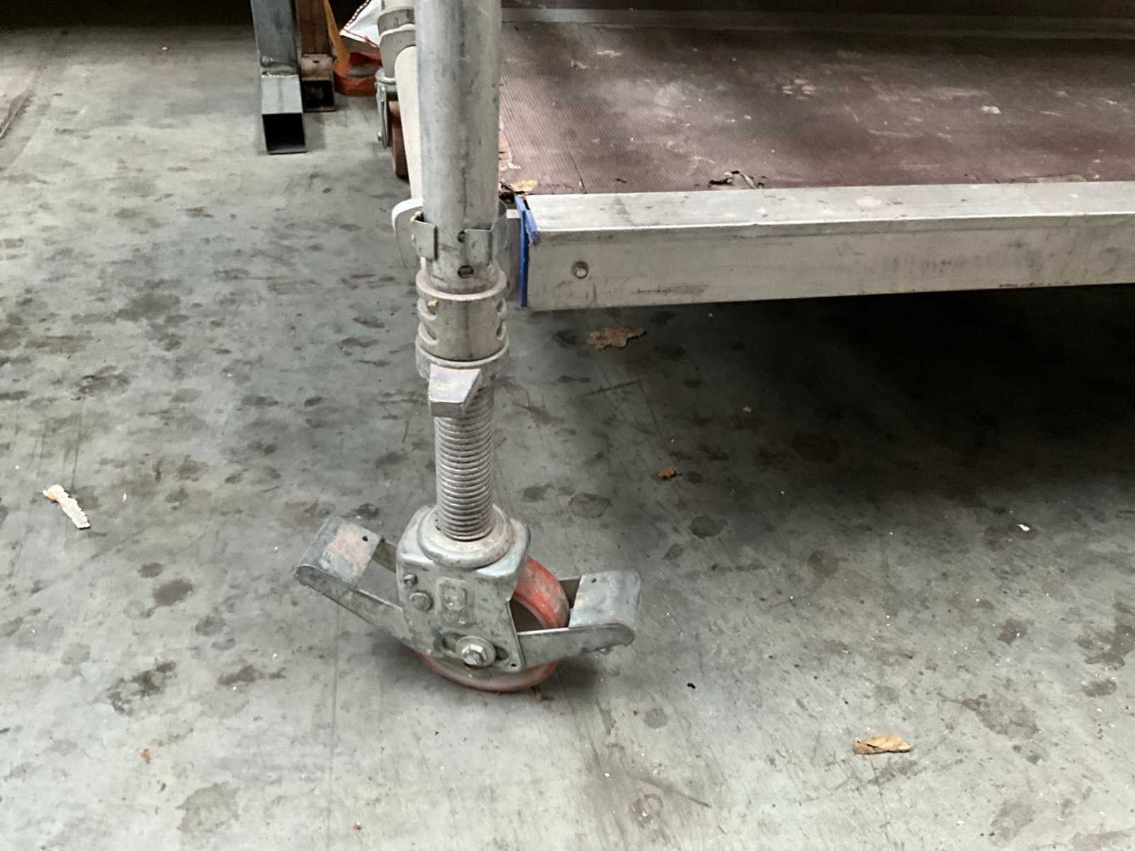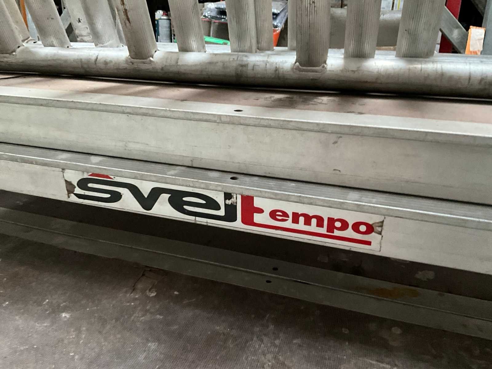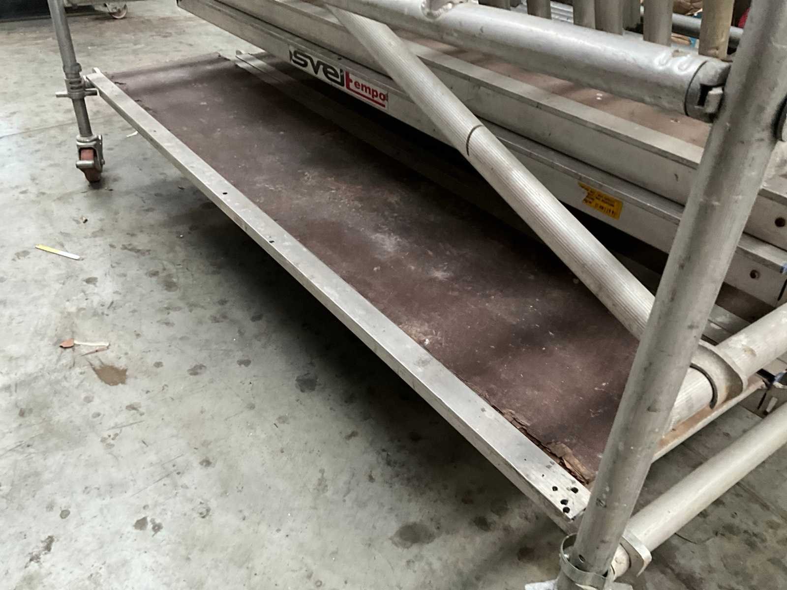 Platform van circa 250 x 130 cm, met een werkhoogte van 7,5 meter, bestaande uit 8 diverse staanders/opbouwelementen van 130 cm, 4 alu/kunststoffen loopplanken waarvan 2 met luik, elk van 2,5 meter lang en 60 cm breed, bijhorende diagonalen en toebehoren (compleet). Nee Merk: Svelt Type: Tempo