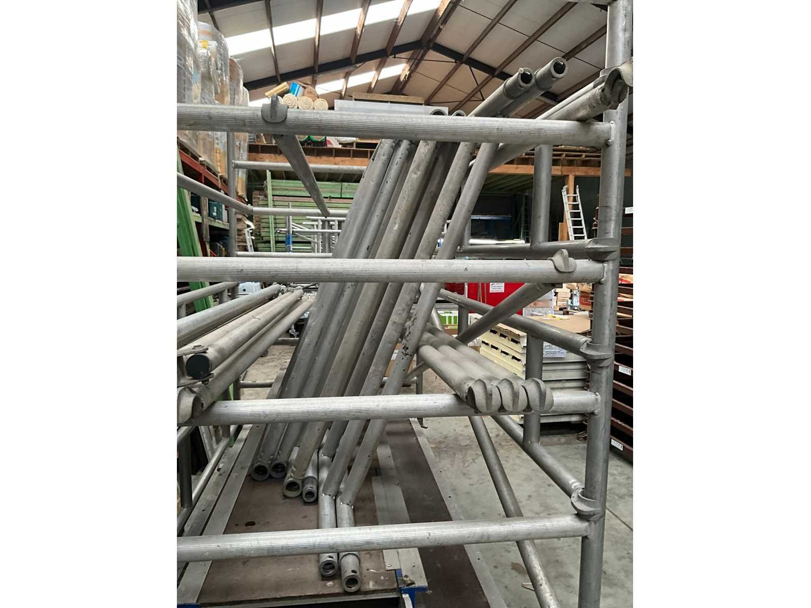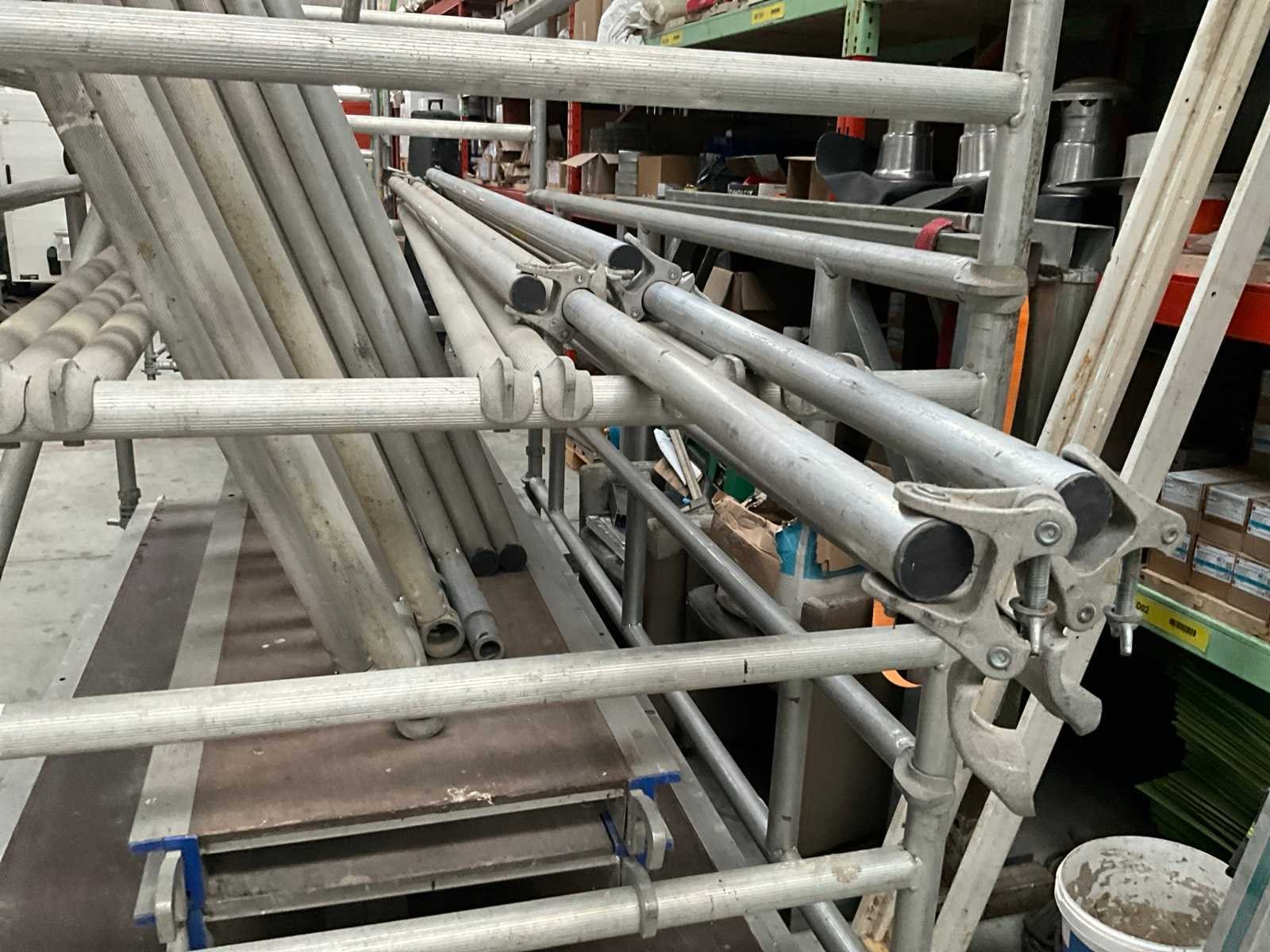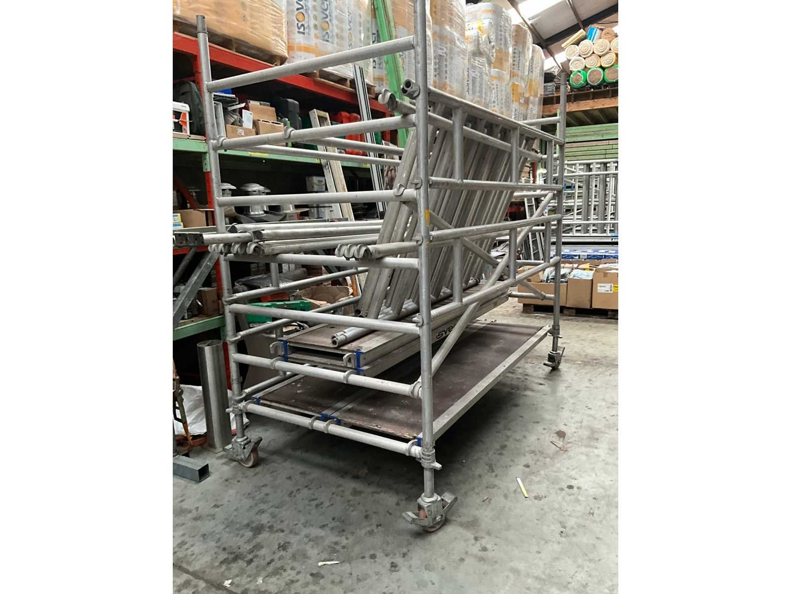 Platform van circa 250 x 130 cm, met een werkhoogte van 7,5 meter, bestaande uit 8 diverse staanders/opbouwelementen van 130 cm, 4 alu/kunststoffen loopplanken waarvan 2 met luik, elk van 2,5 meter lang en 60 cm breed, bijhorende diagonalen en toebehoren (compleet). Nee Merk: Svelt Type: Tempo