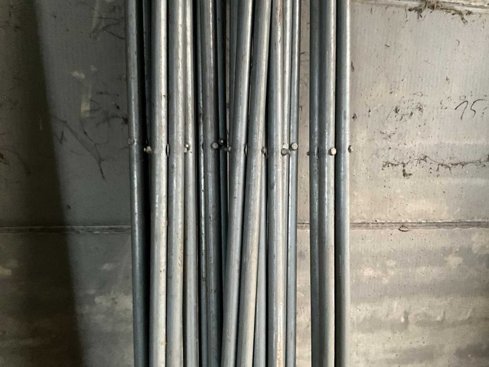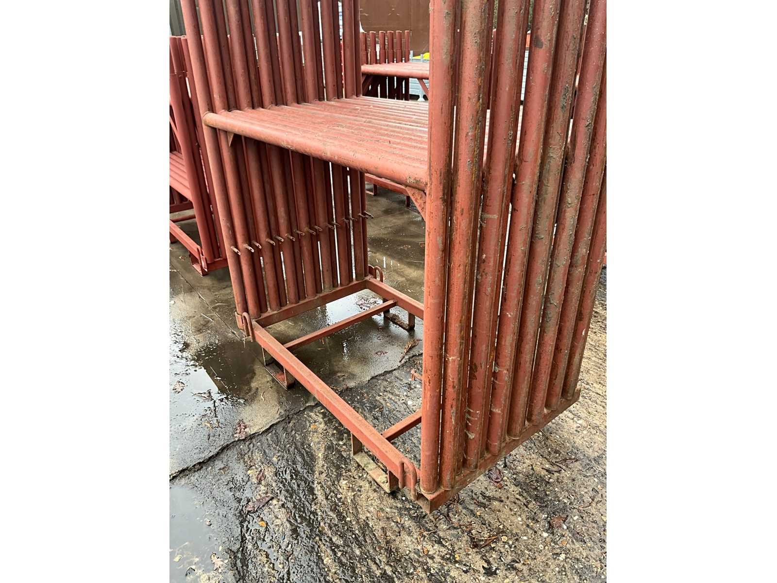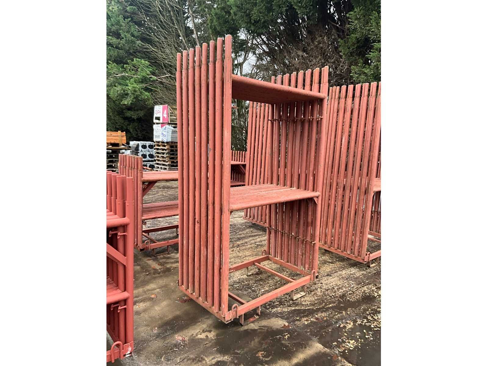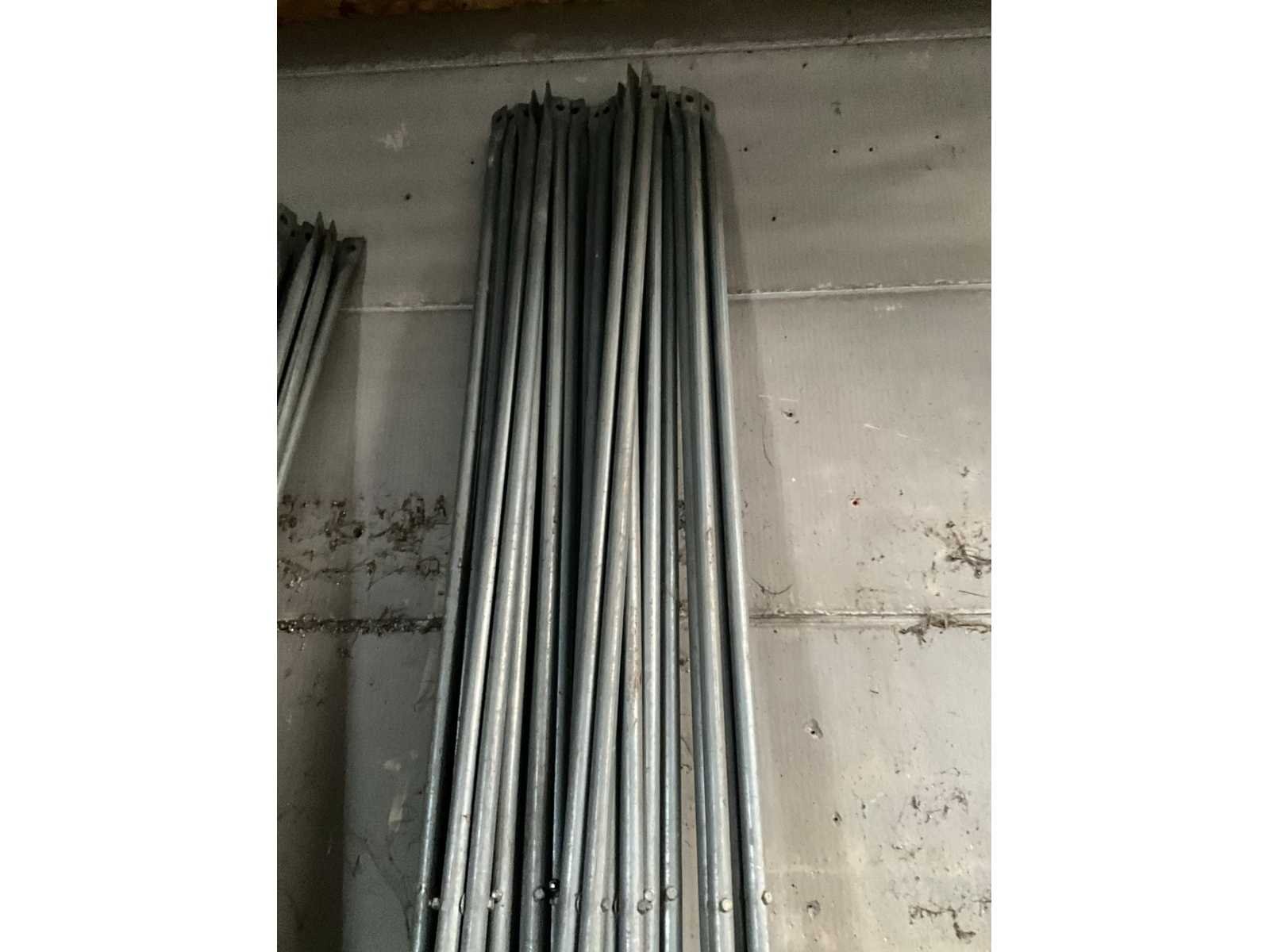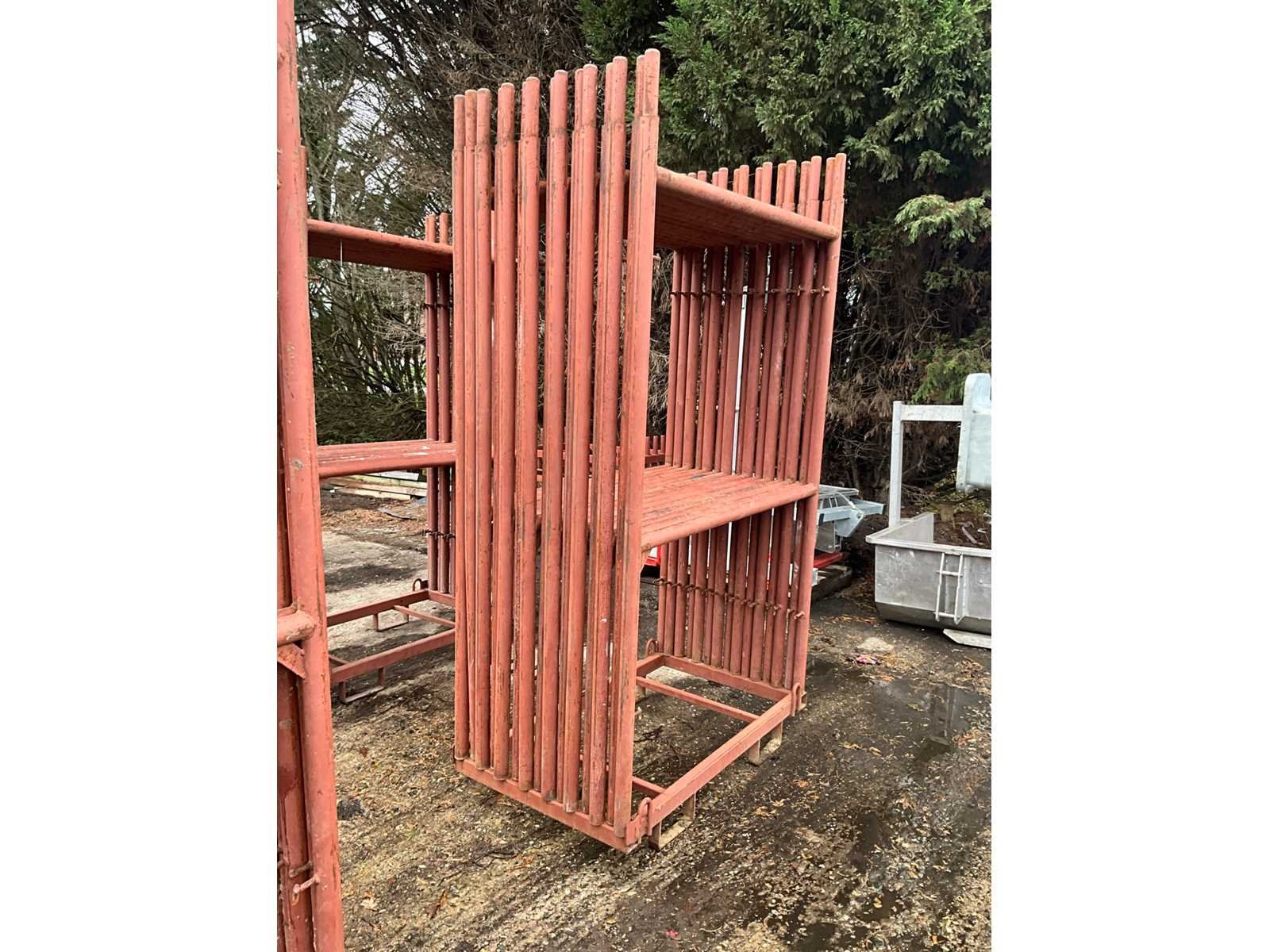 Metalen staanders zo goed als nieuw, elk met afmeting 130 x 215 cm hoog op bijhorende stapelbok. Compleet met 14 bijhorende diagonalen, elk 290 cm lang ! Nee Totale afmeting Breedte: 130mm Totale afmeting Hoogte: 1150mm
