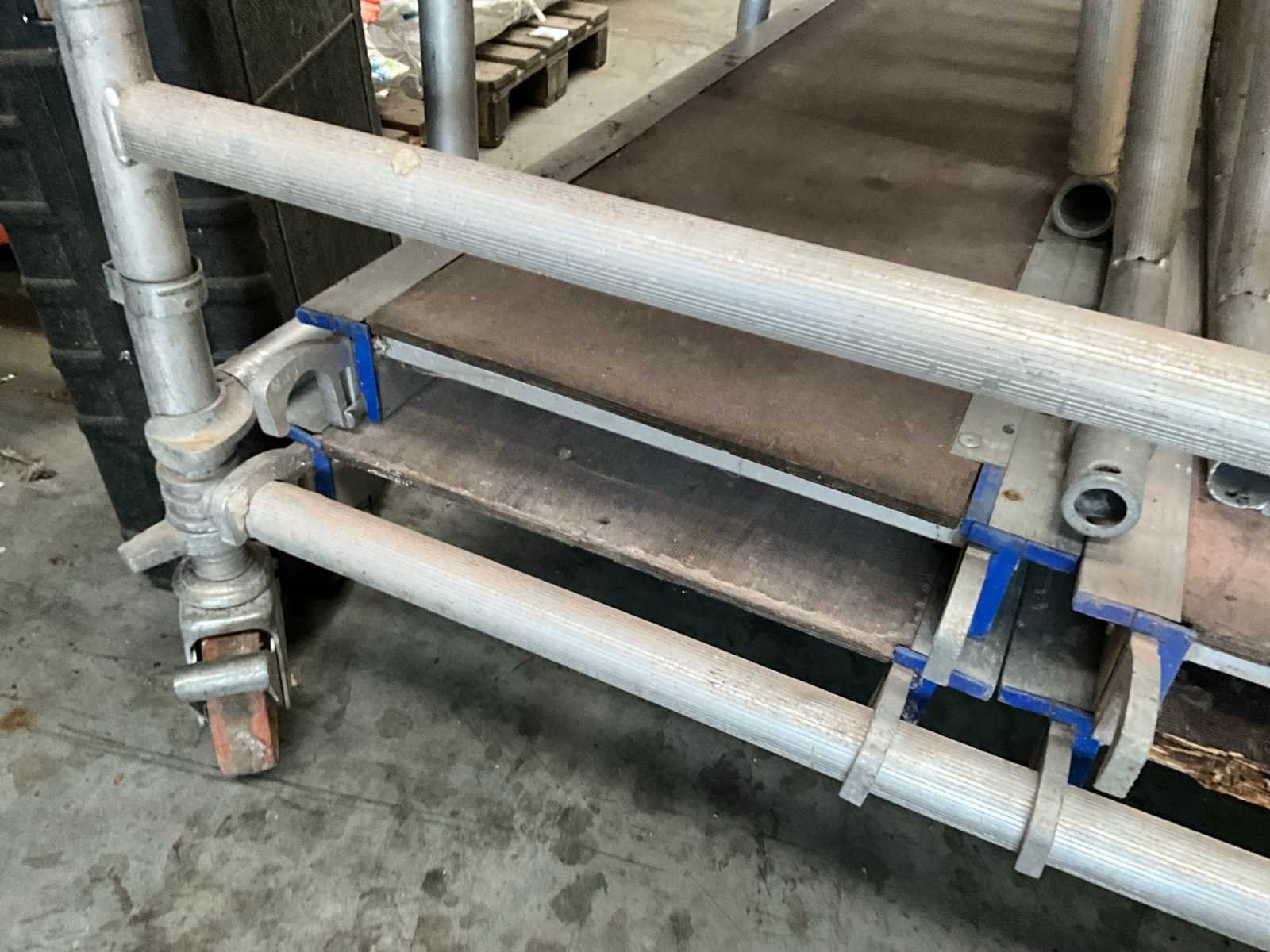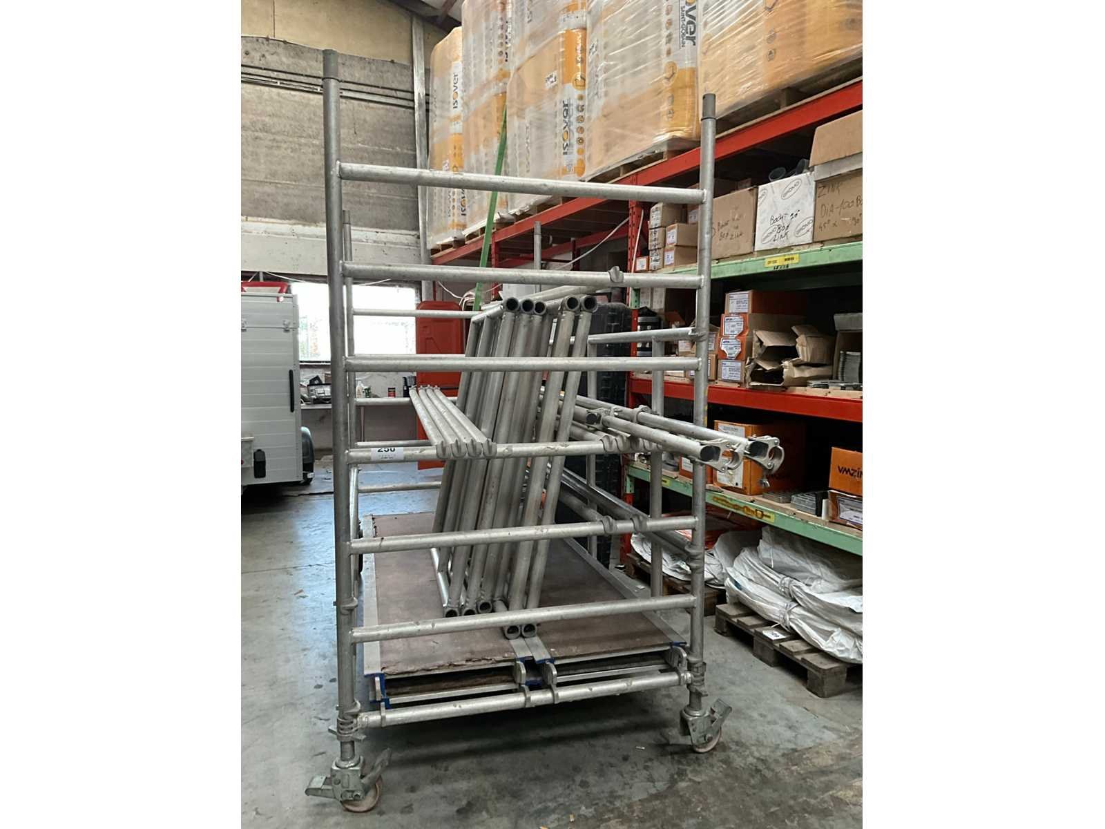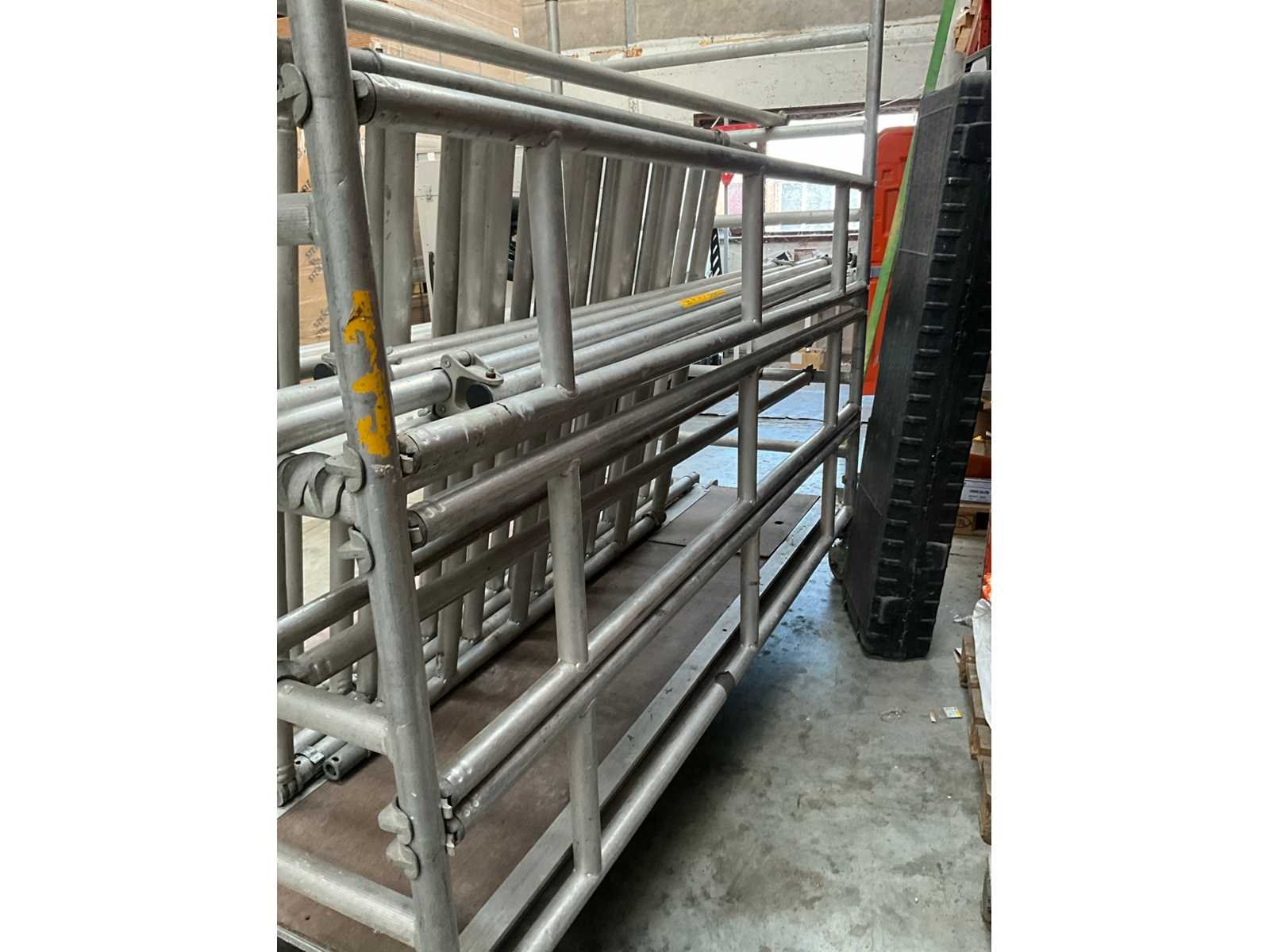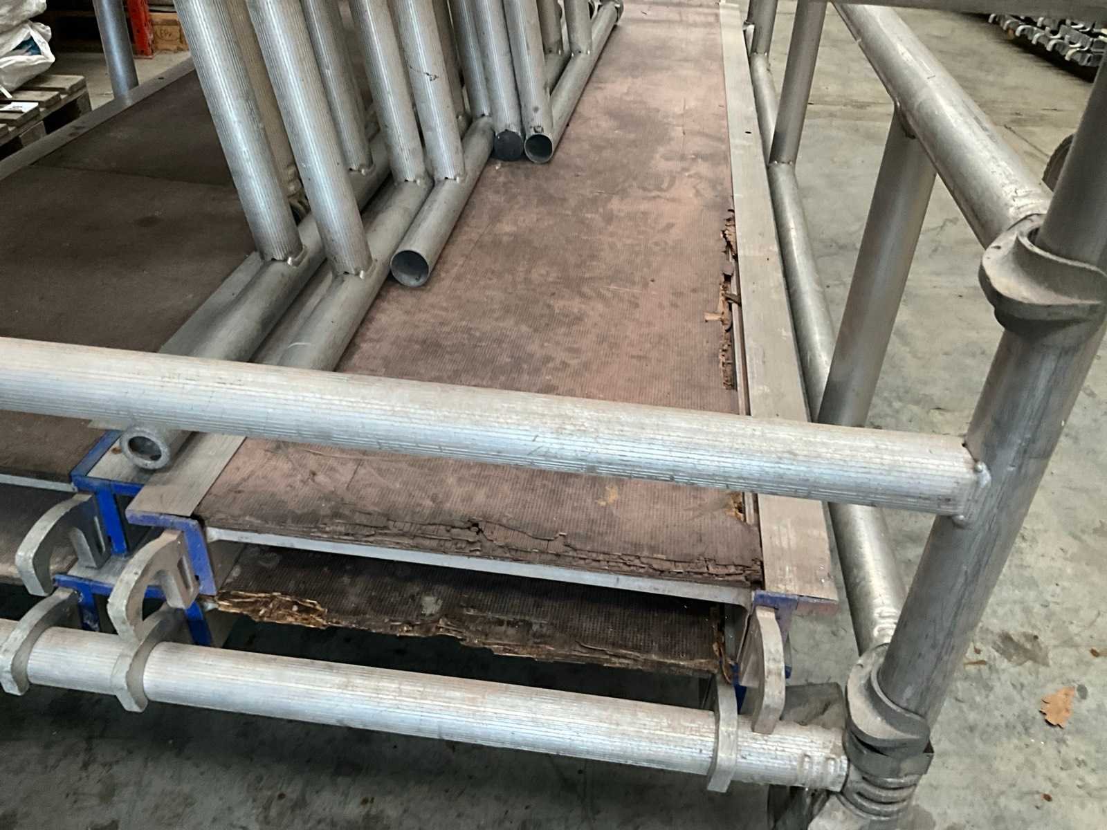 Platform van circa 250 x 130 cm, met een werkhoogte van 7,5 meter, bestaande uit 8 diverse staanders/opbouwelementen van 130 cm, 4 alu/kunststoffen loopplanken waarvan 2 met luik, elk van 2,5 meter lang en 60 cm breed, bijhorende diagonalen en toebehoren. Waarvan 2 loopplanken in minder goede staat (te vervangen) en enige ontbrekende steunpootjes. Nee Merk: Svelt Type: Tempo