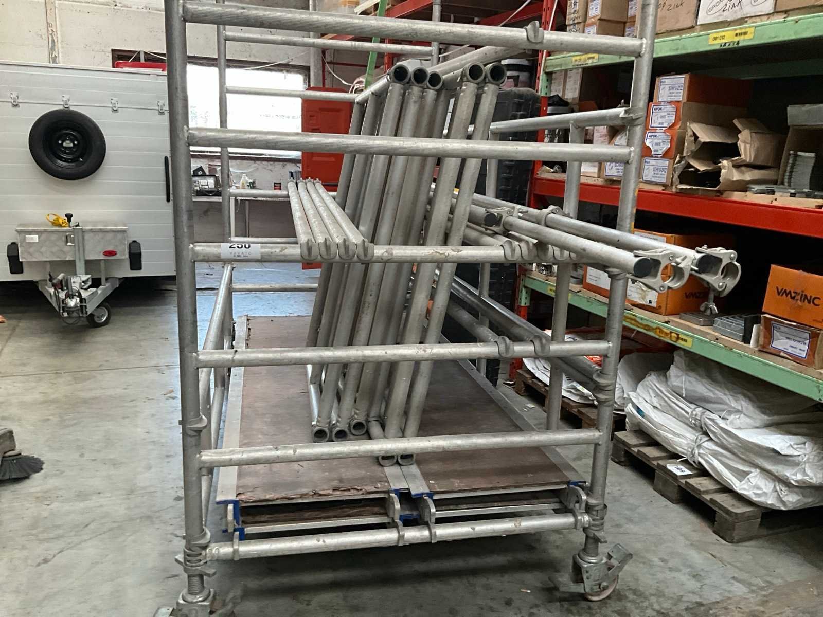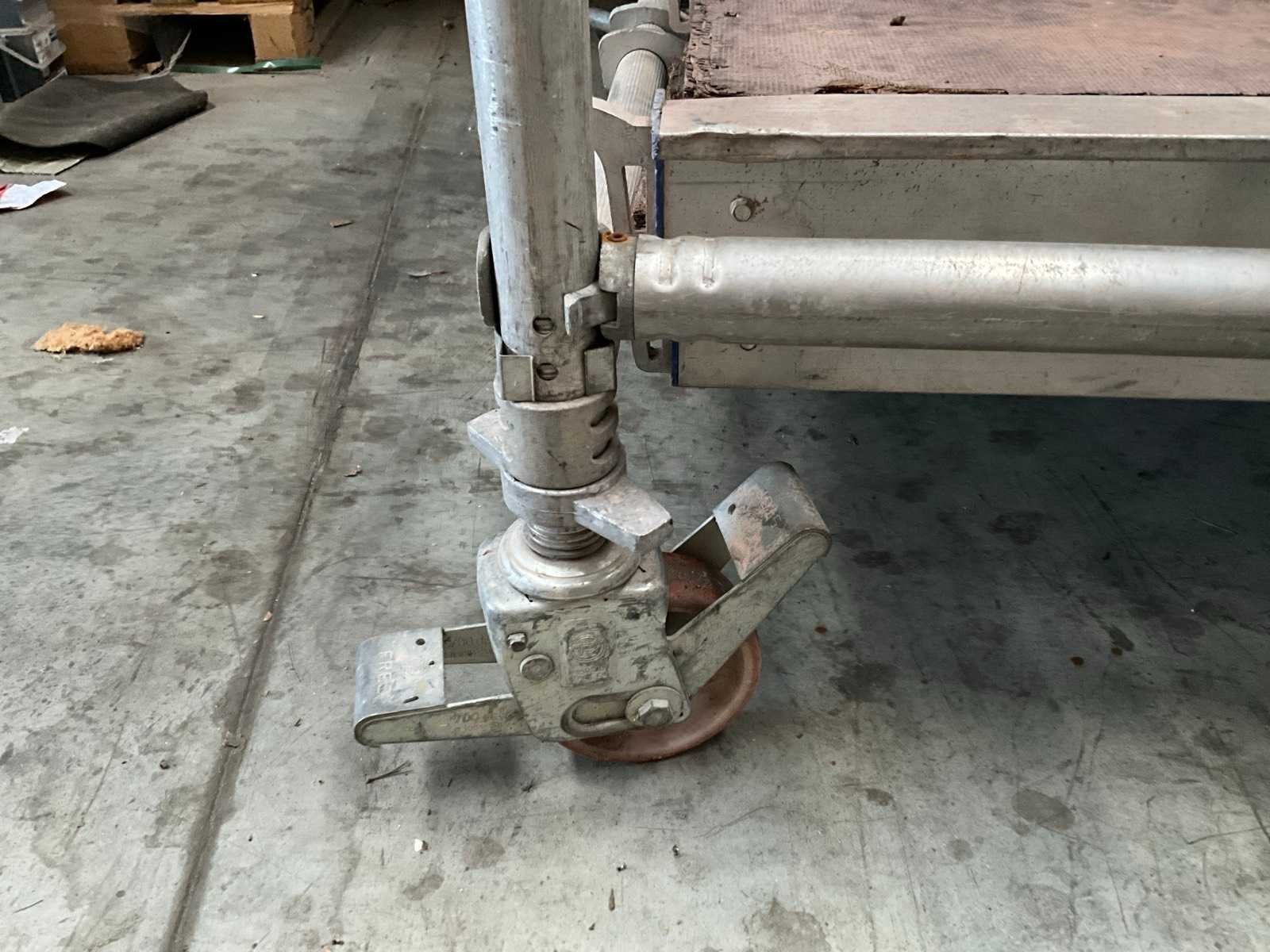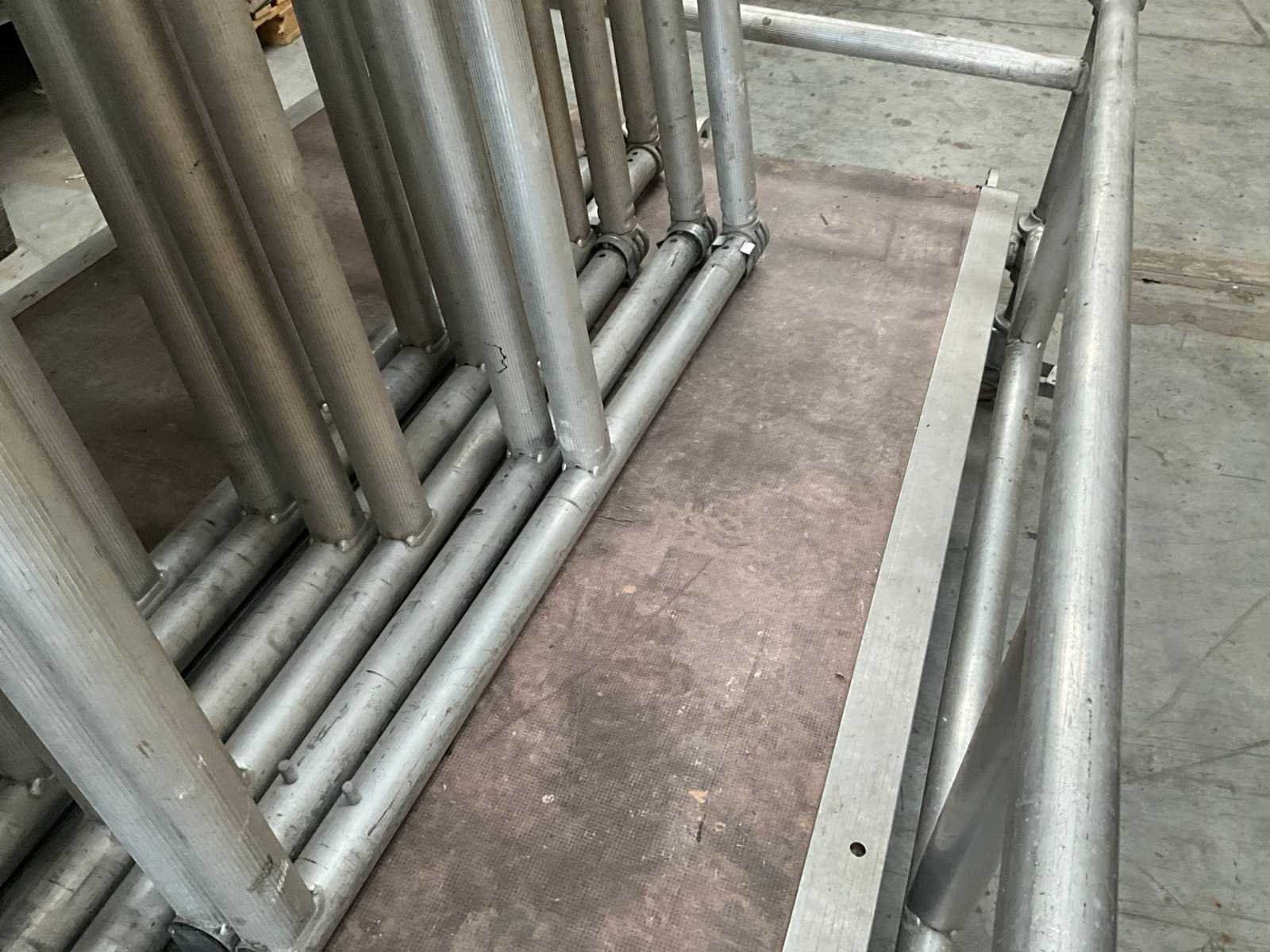 Platform van circa 250 x 130 cm, met een werkhoogte van 7,5 meter, bestaande uit 8 diverse staanders/opbouwelementen van 130 cm, 4 alu/kunststoffen loopplanken waarvan 2 met luik, elk van 2,5 meter lang en 60 cm breed, bijhorende diagonalen en toebehoren. Waarvan 2 loopplanken in minder goede staat (te vervangen) en enige ontbrekende steunpootjes. Nee Merk: Svelt Type: Tempo