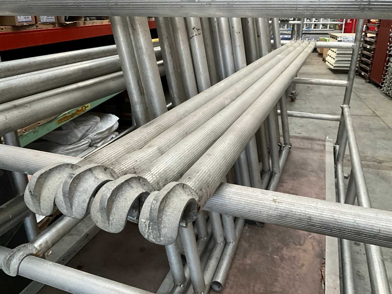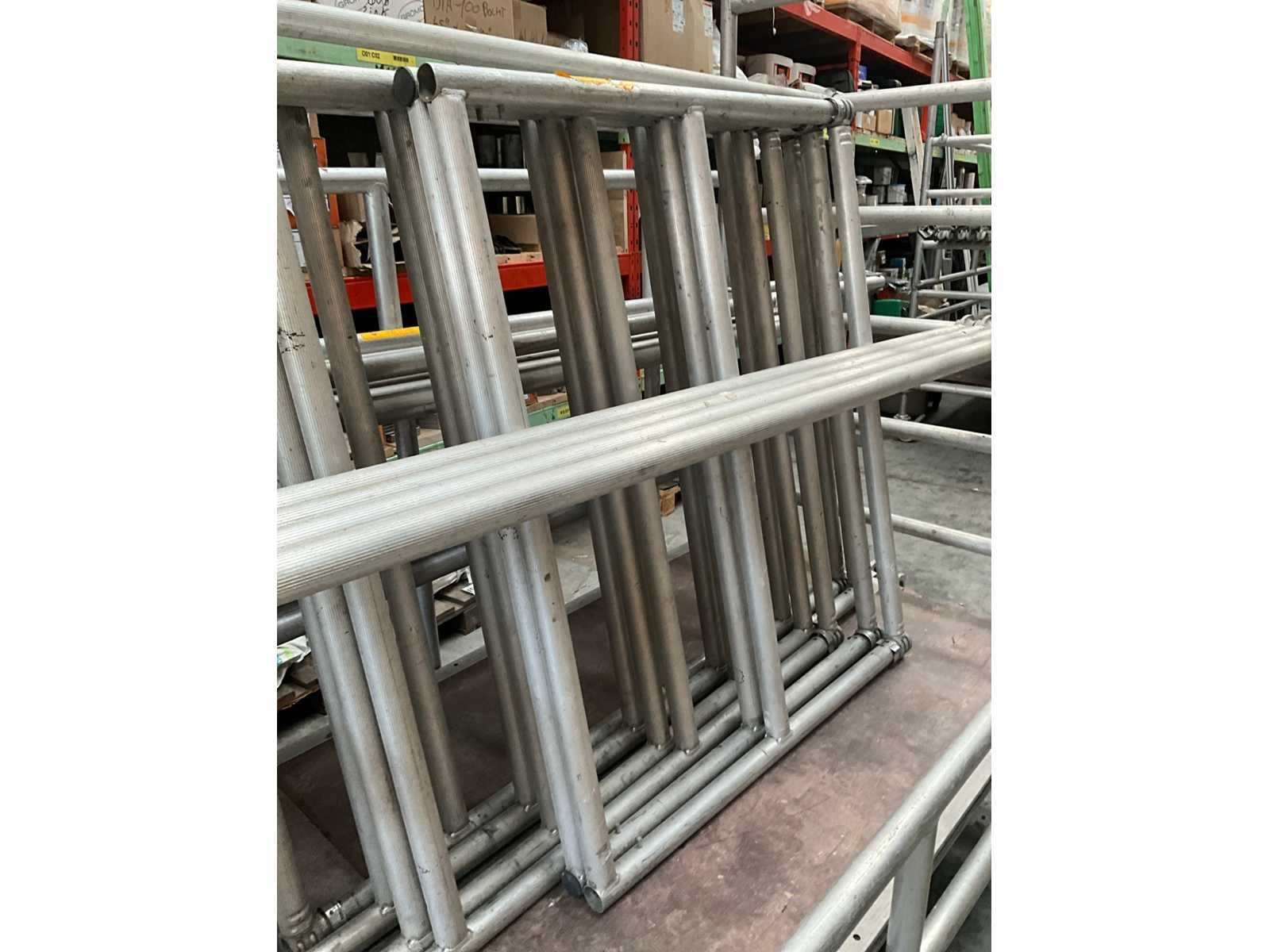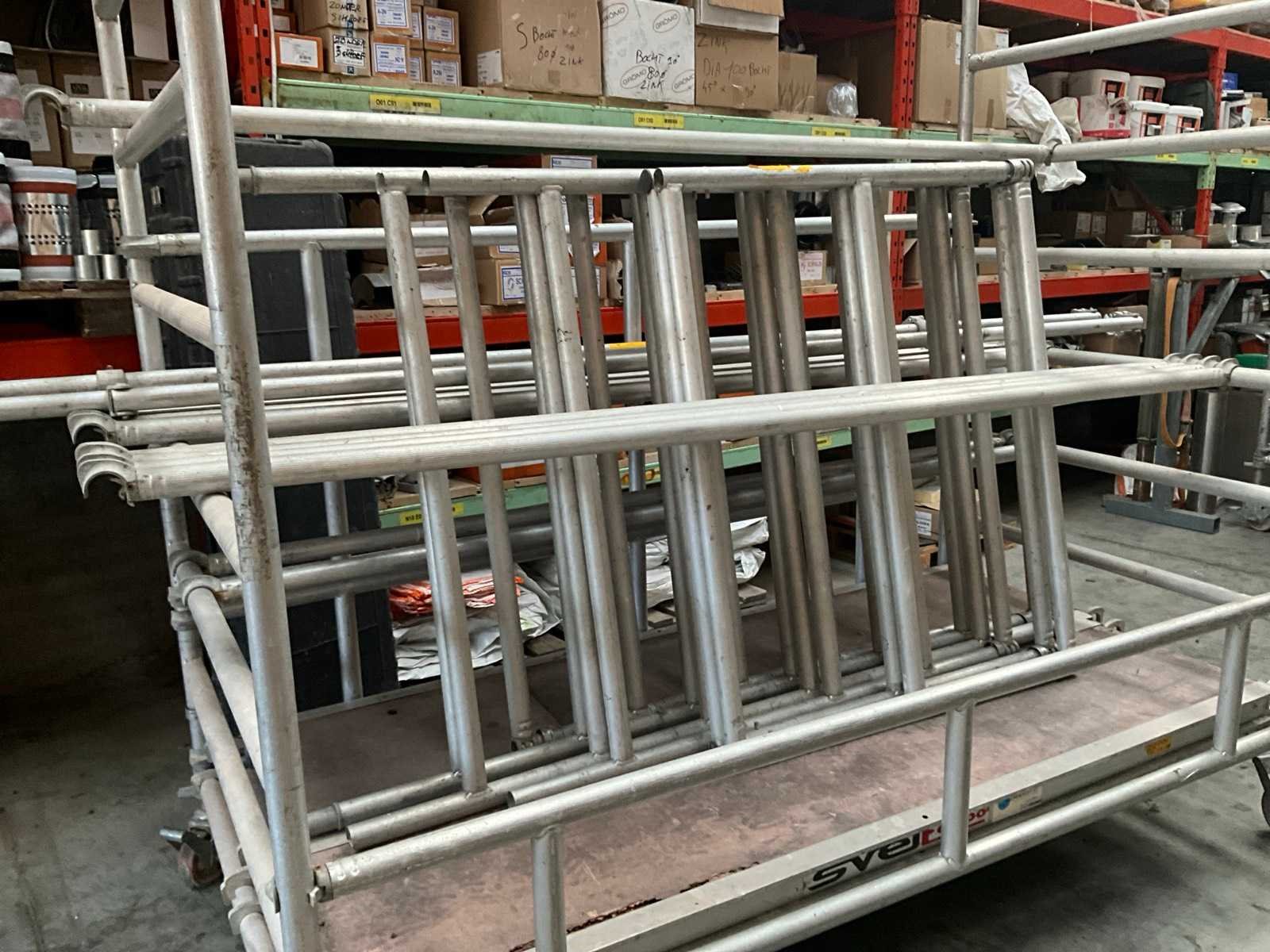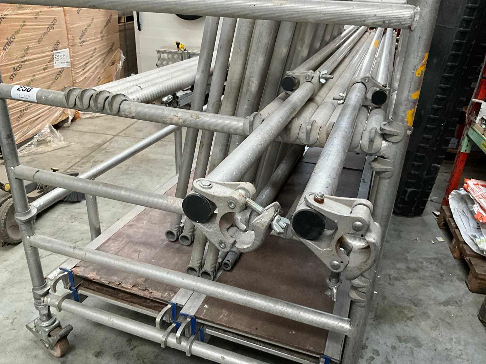 Platform van circa 250 x 130 cm, met een werkhoogte van 7,5 meter, bestaande uit 8 diverse staanders/opbouwelementen van 130 cm, 4 alu/kunststoffen loopplanken waarvan 2 met luik, elk van 2,5 meter lang en 60 cm breed, bijhorende diagonalen en toebehoren. Waarvan 2 loopplanken in minder goede staat (te vervangen) en enige ontbrekende steunpootjes. Nee Merk: Svelt Type: Tempo