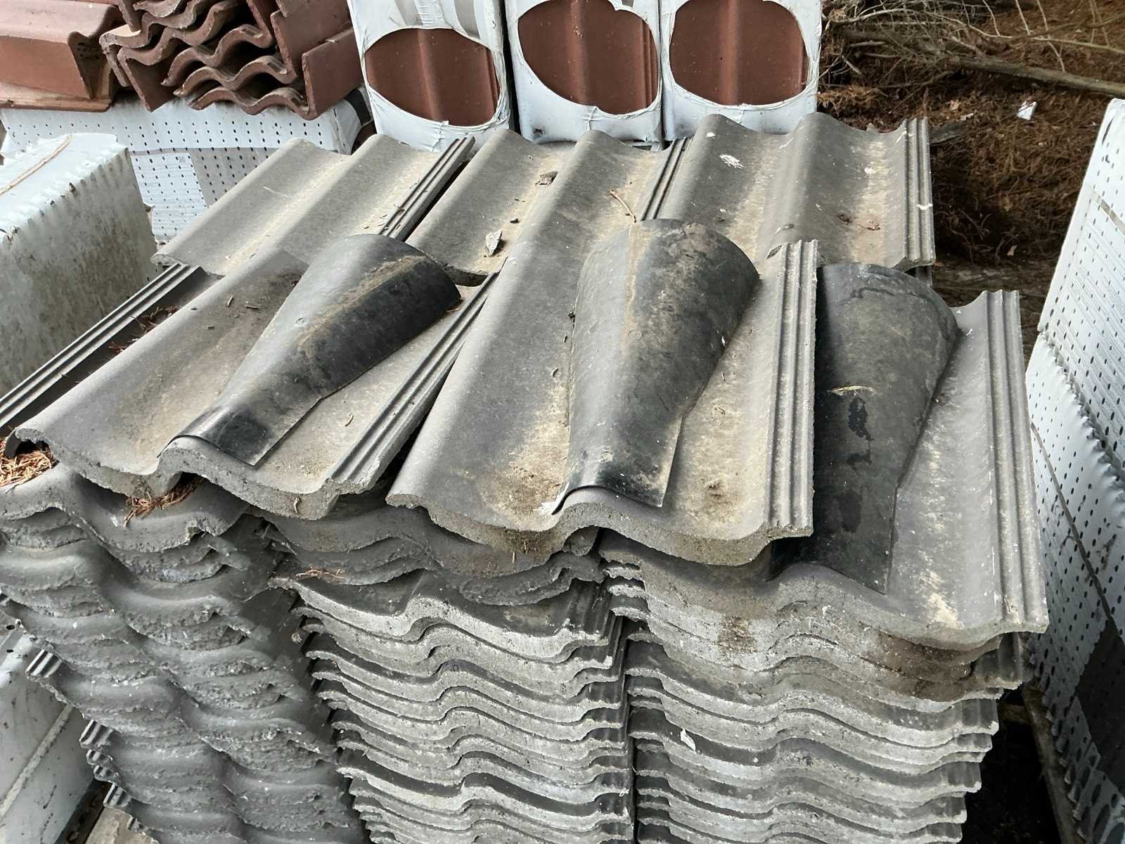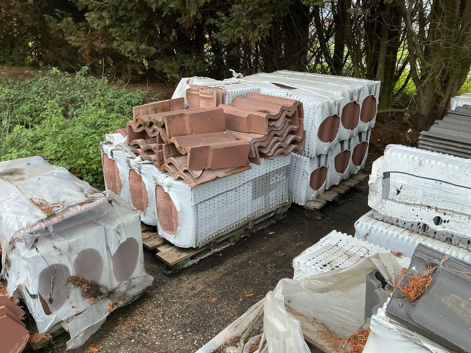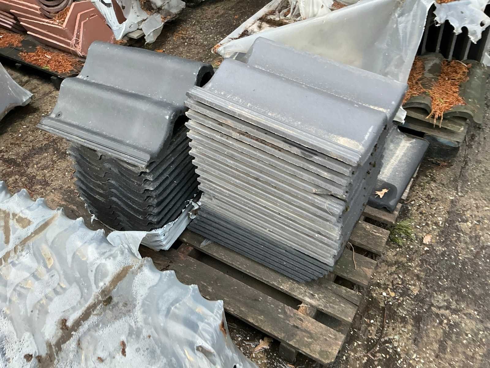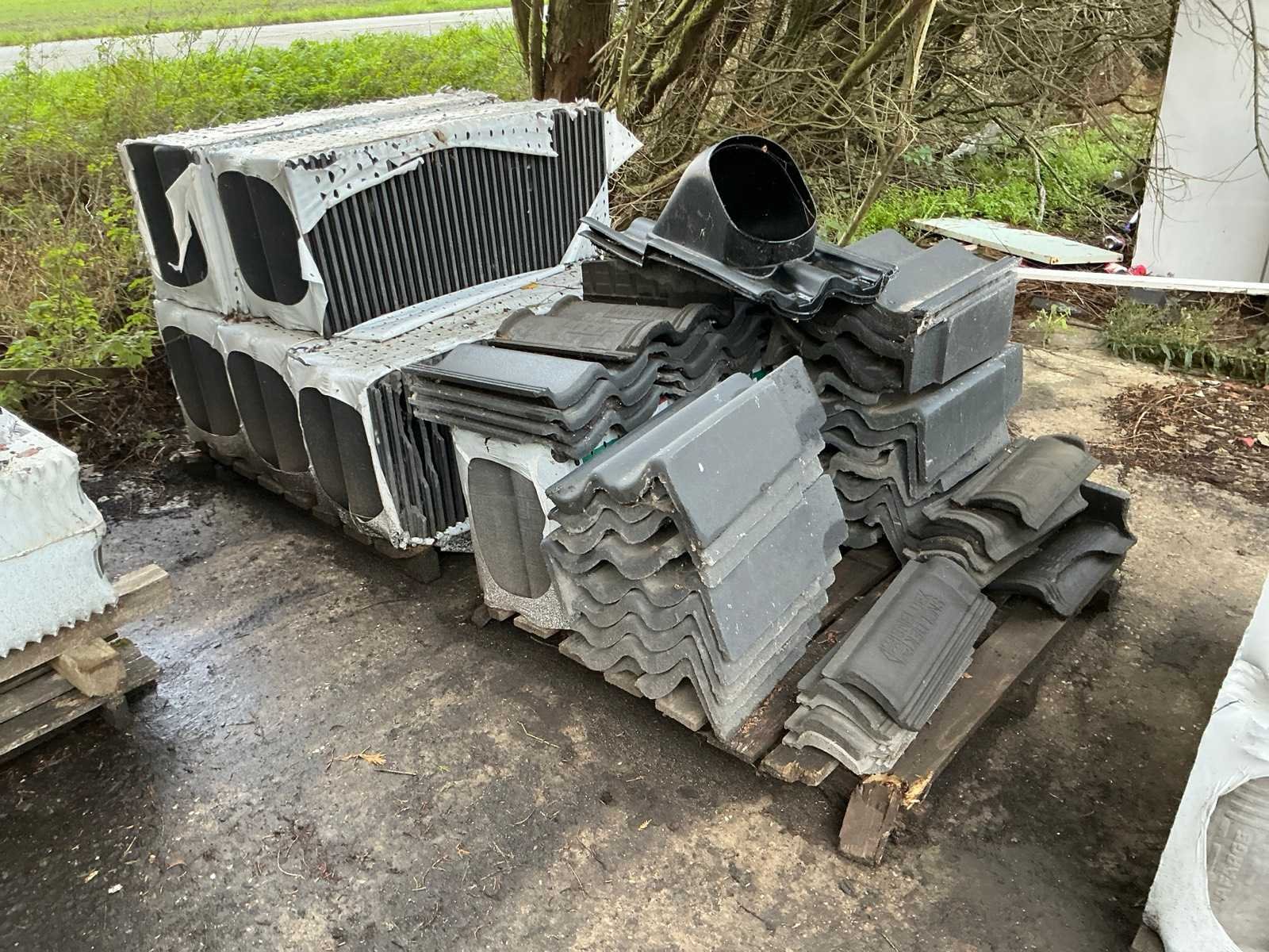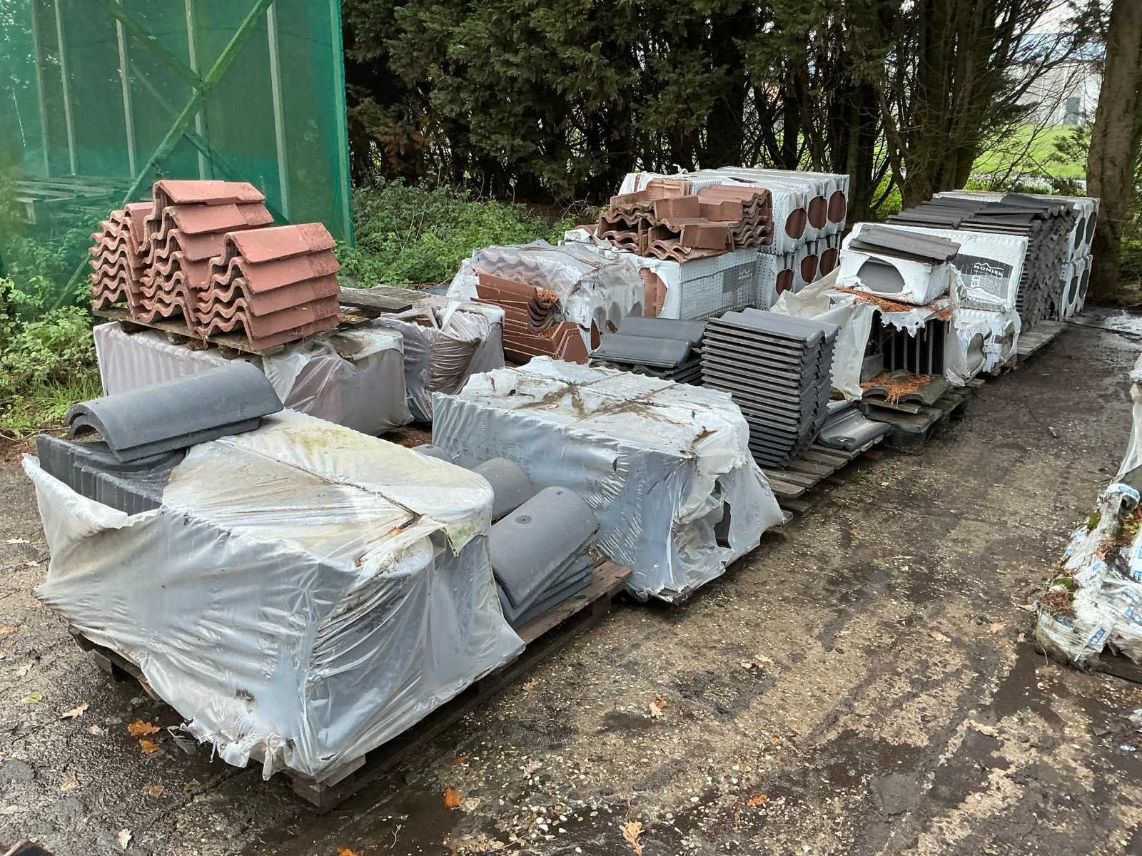 Waaronder 8 volle palletten nokken (60stuks/pallet), 6 volle palletten gevelpannen (30stuks/pallet), dakpannen, in diverse kleuren waaronder zwart, grijs en rood, diverse maten en uitvoeringen, liggende op 23 stapels Nee Merk: Monier