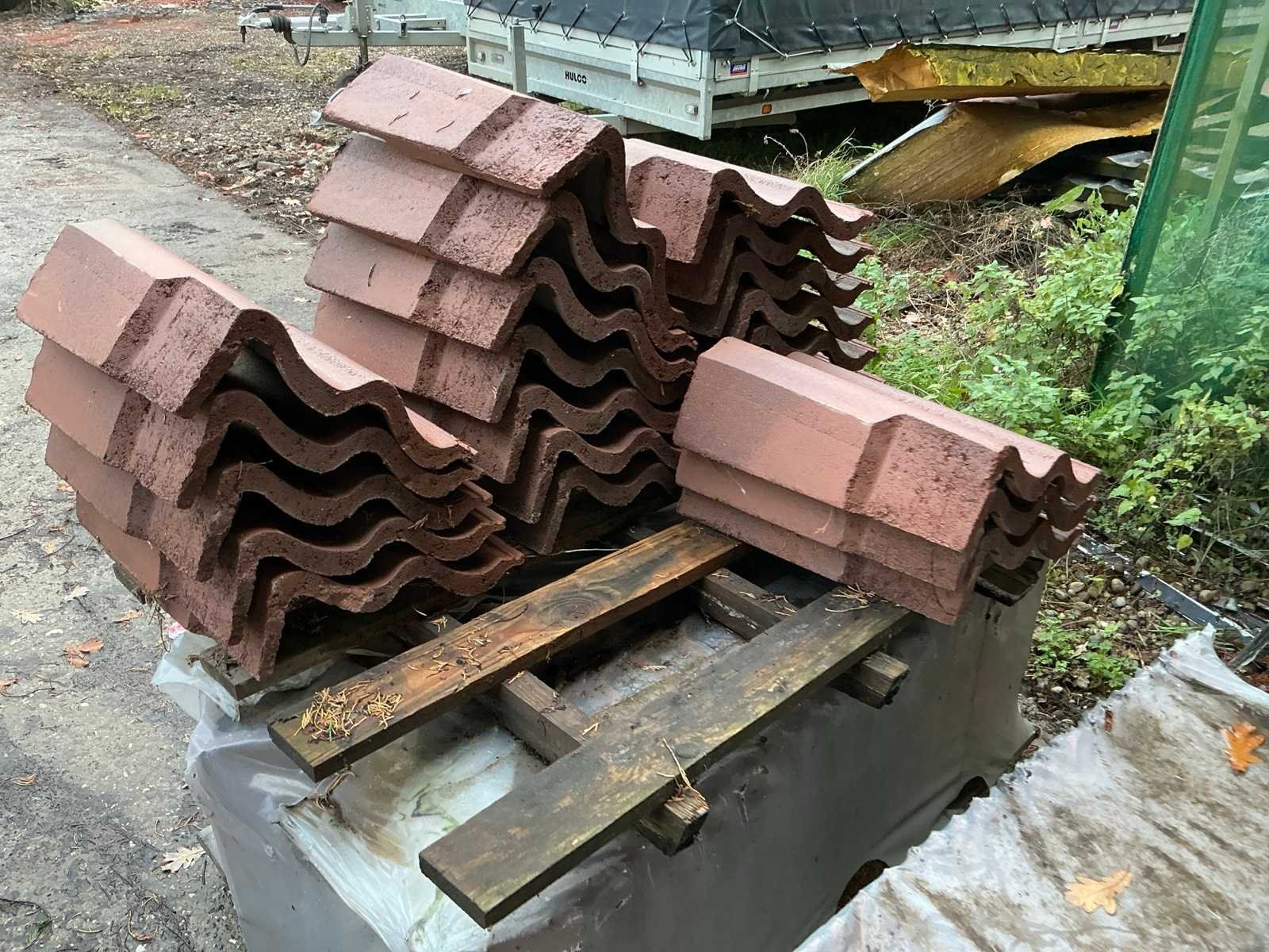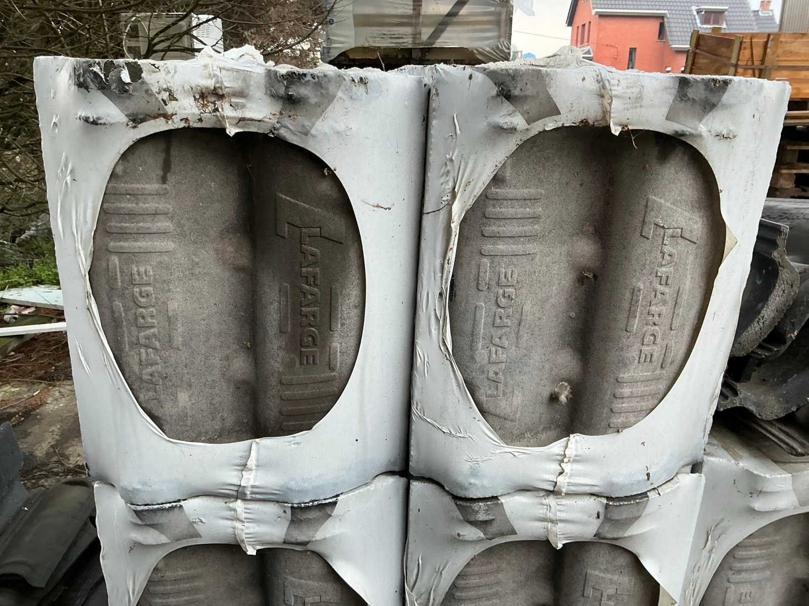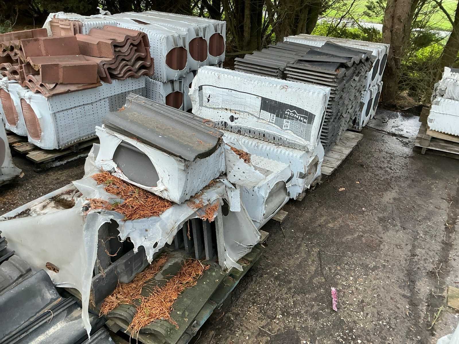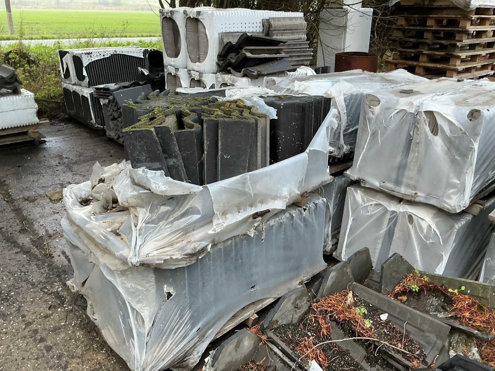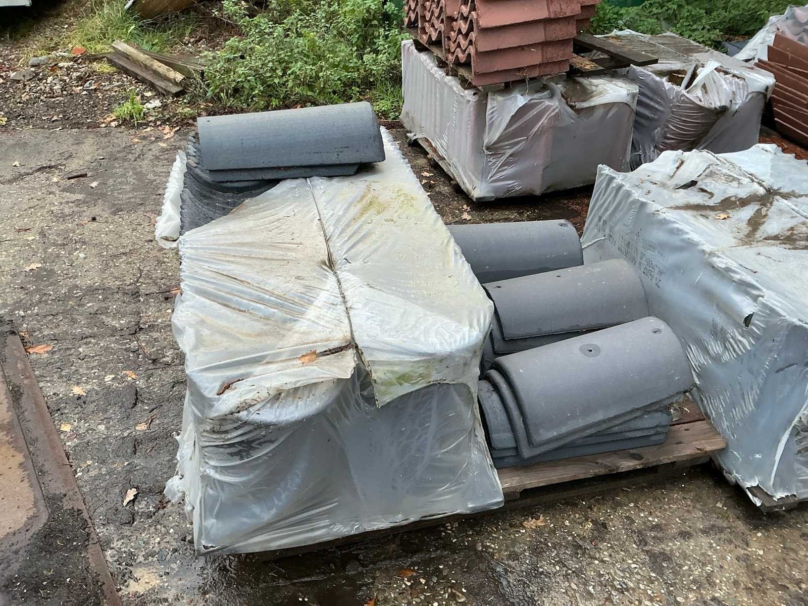 Waaronder 8 volle palletten nokken (60stuks/pallet), 6 volle palletten gevelpannen (30stuks/pallet), dakpannen, in diverse kleuren waaronder zwart, grijs en rood, diverse maten en uitvoeringen, liggende op 23 stapels Nee Merk: Monier