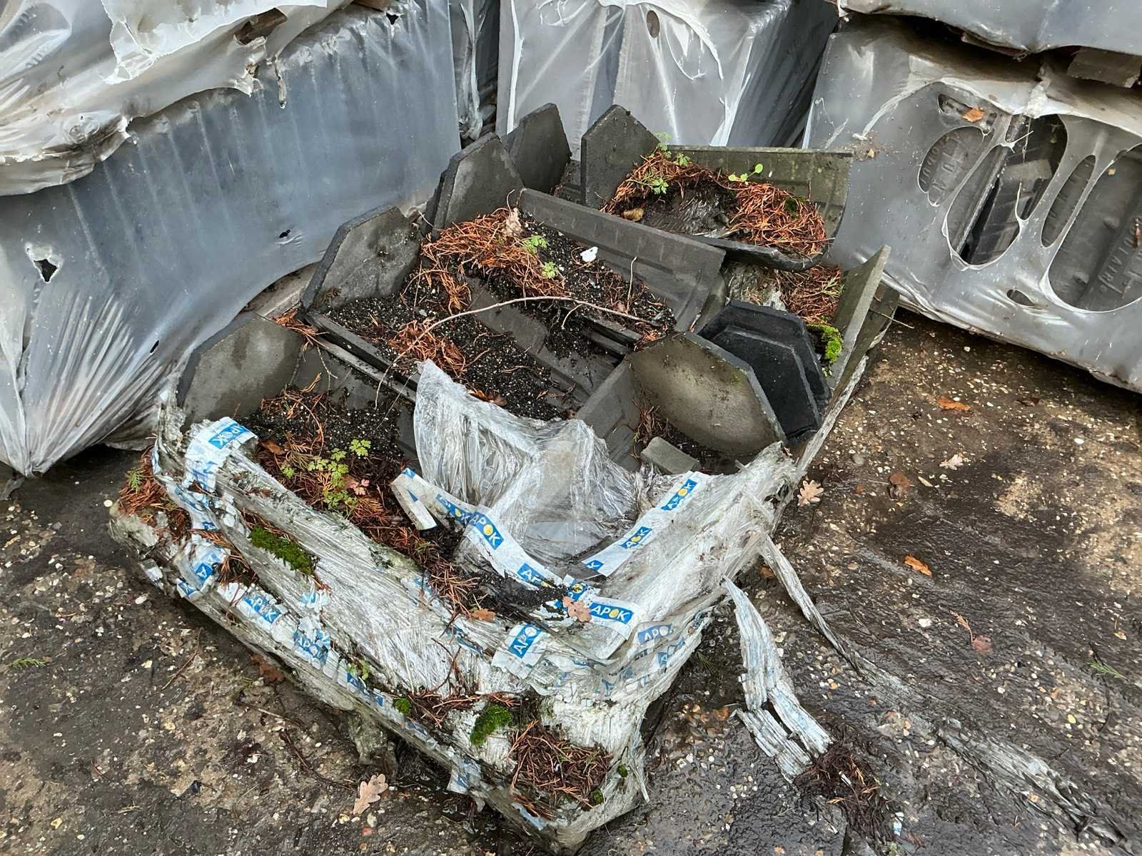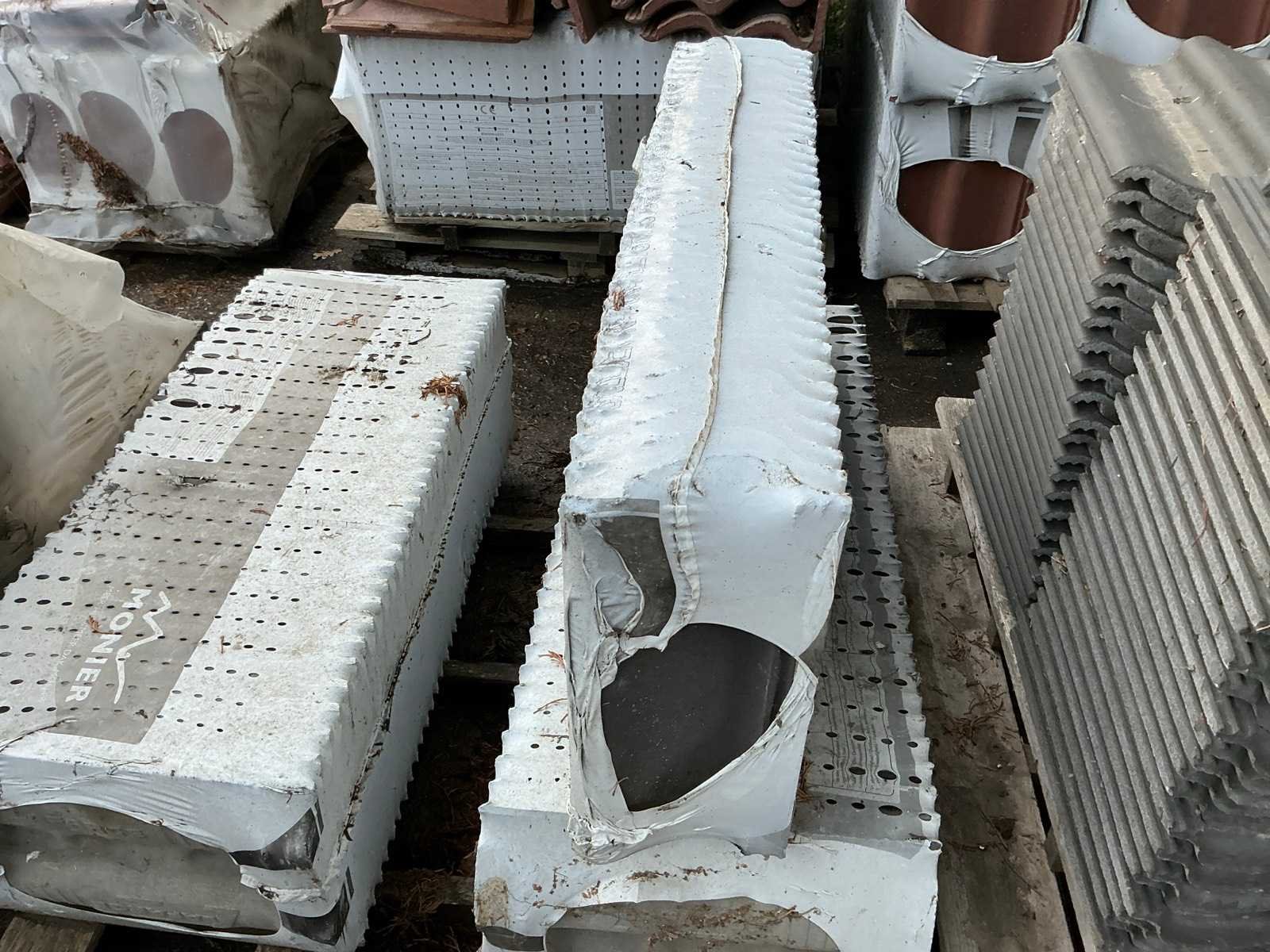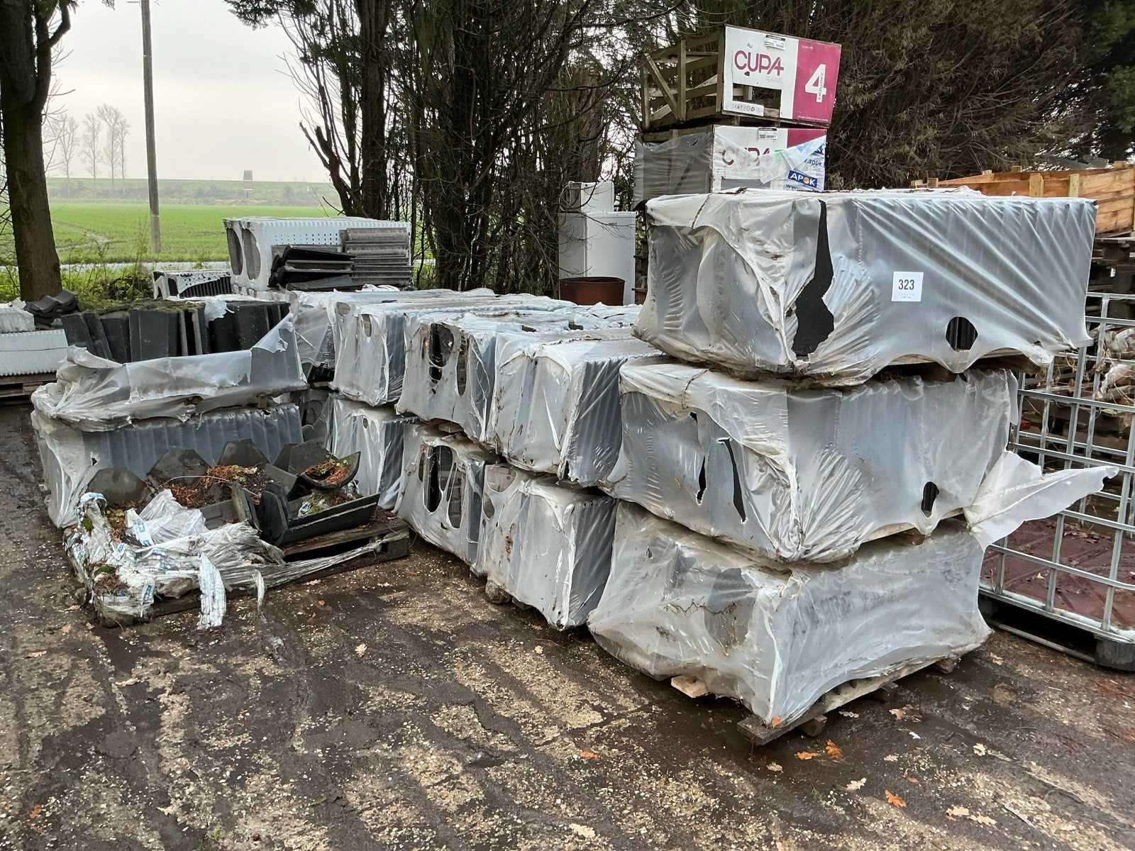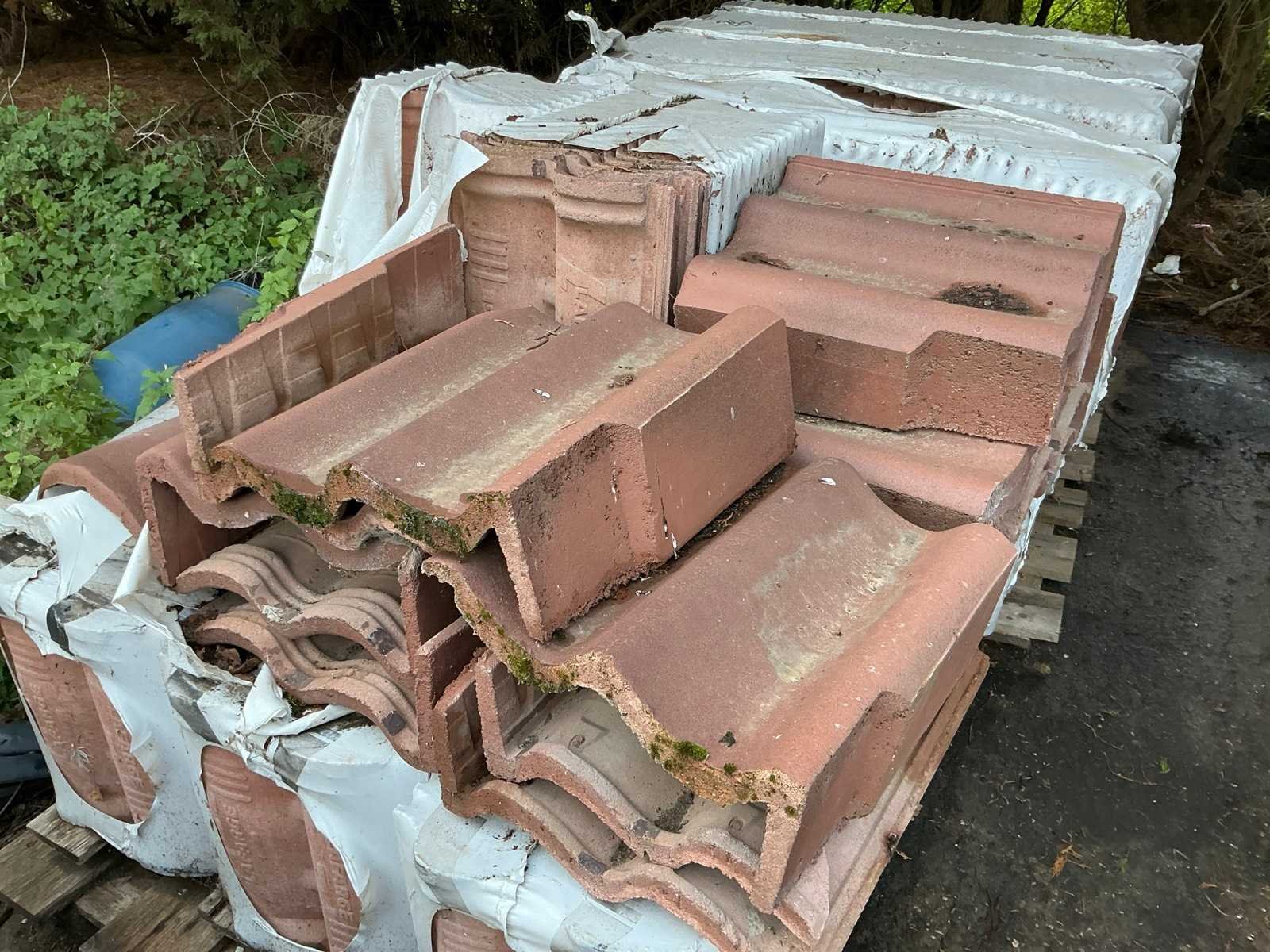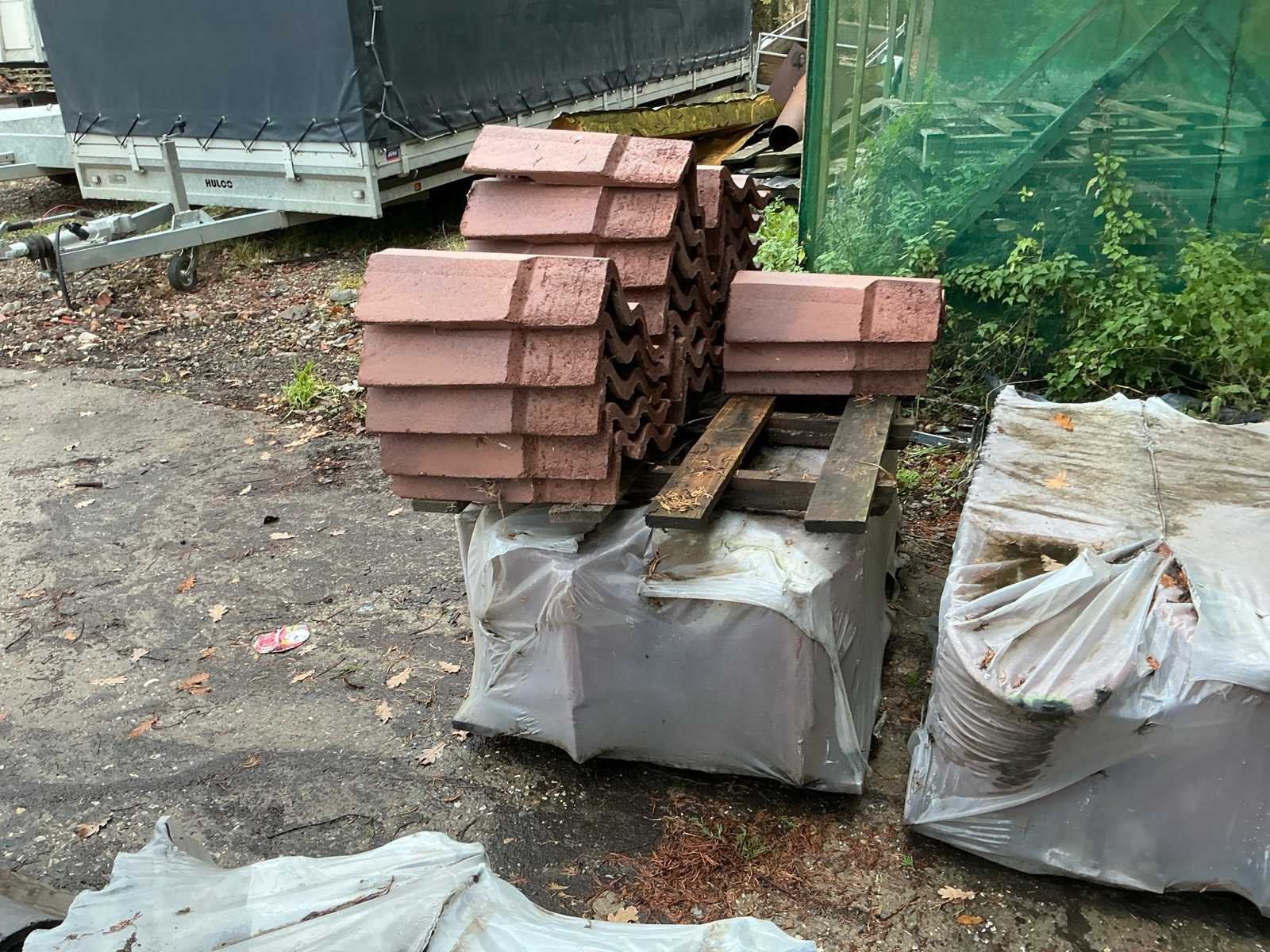 Waaronder 8 volle palletten nokken (60stuks/pallet), 6 volle palletten gevelpannen (30stuks/pallet), dakpannen, in diverse kleuren waaronder zwart, grijs en rood, diverse maten en uitvoeringen, liggende op 23 stapels Nee Merk: Monier