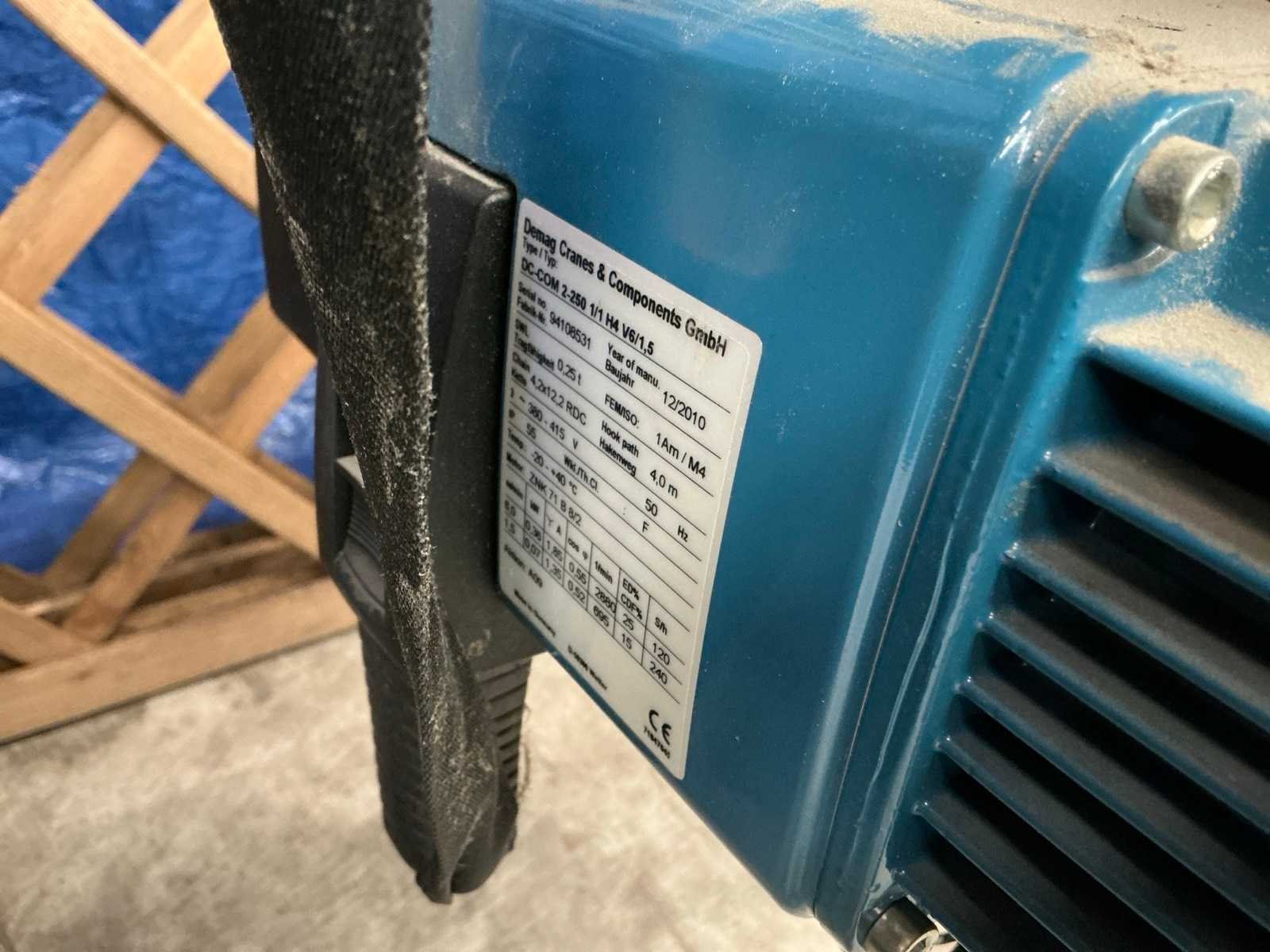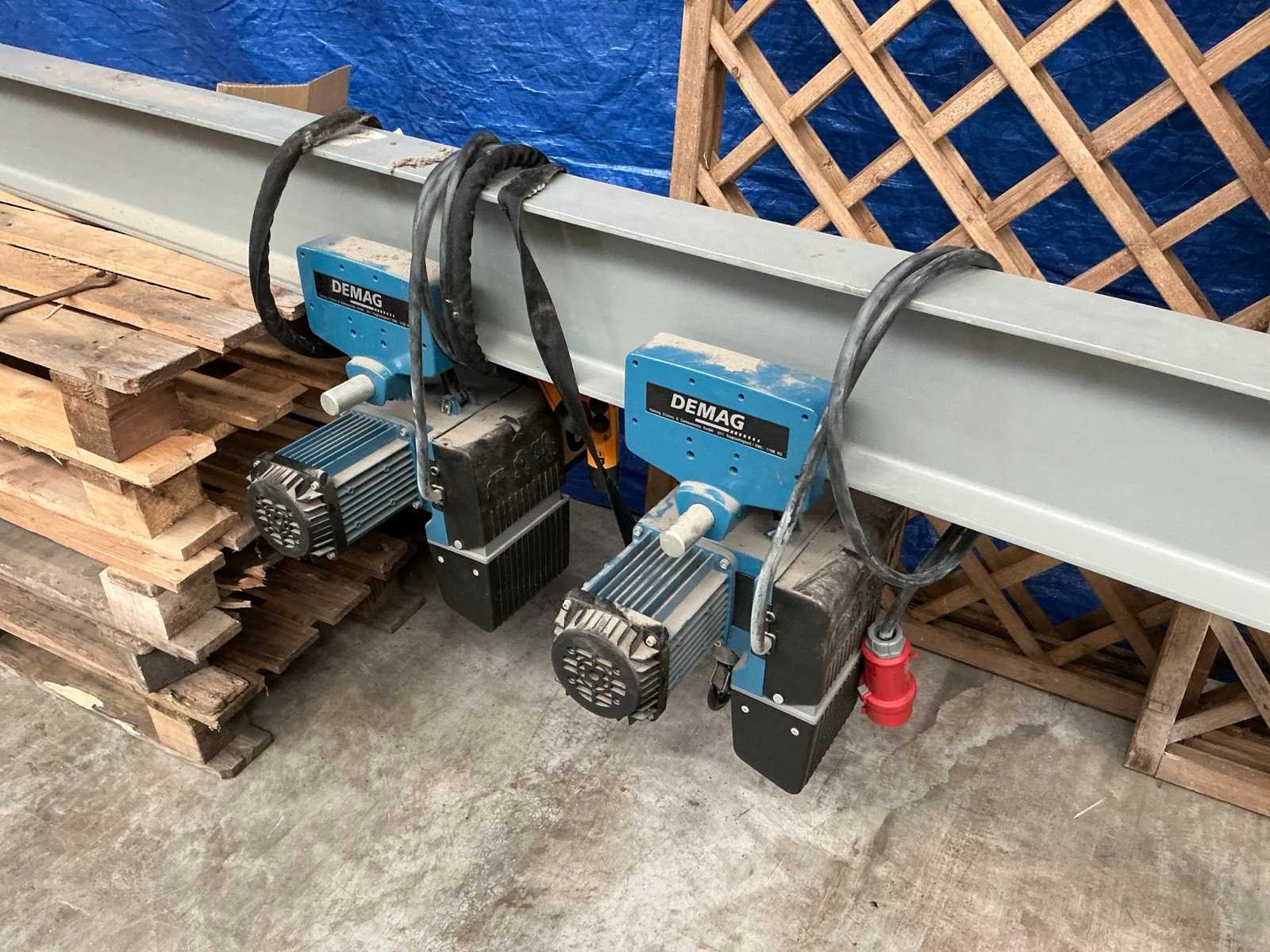 2x Demag DC-COM 2-250 1/1 H4 V6/1,5 takels Nee Hijsvermogen: 250kg Totale afmeting L: 5200mm Totale afmeting Breedte: 100mm Totale afmeting Hoogte: 200mm