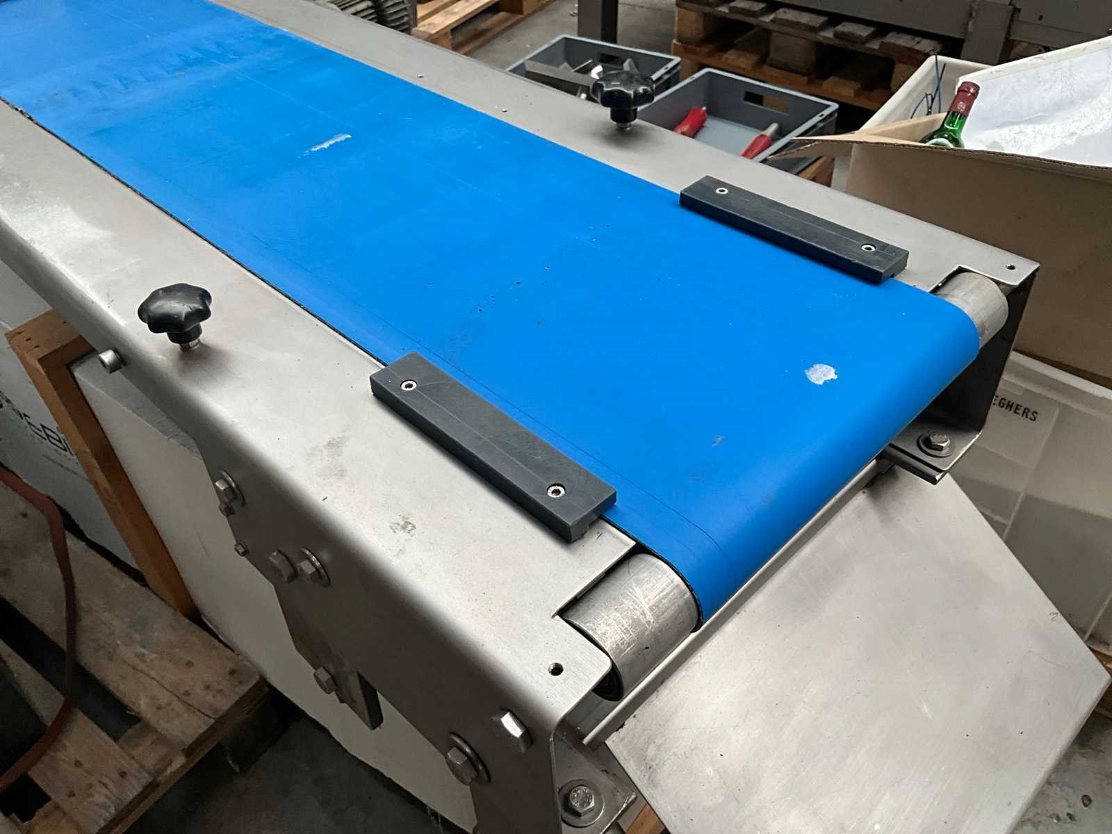Compleet met transportband met afmetingen 160 x 35cm en rvs schakelkast getekend Getra Nee Band afm. l: 250mm Totale afmeting L: 3600mm Totale afmeting Breedte: 420mm Totale afmeting Hoogte: 950mm