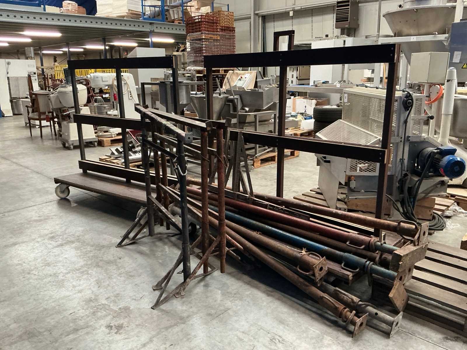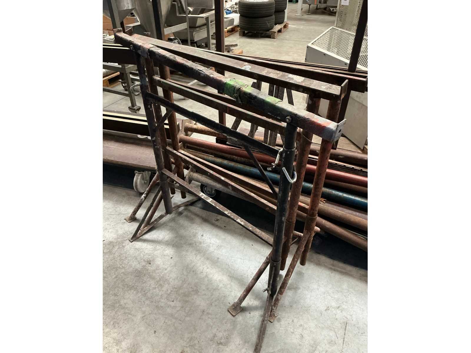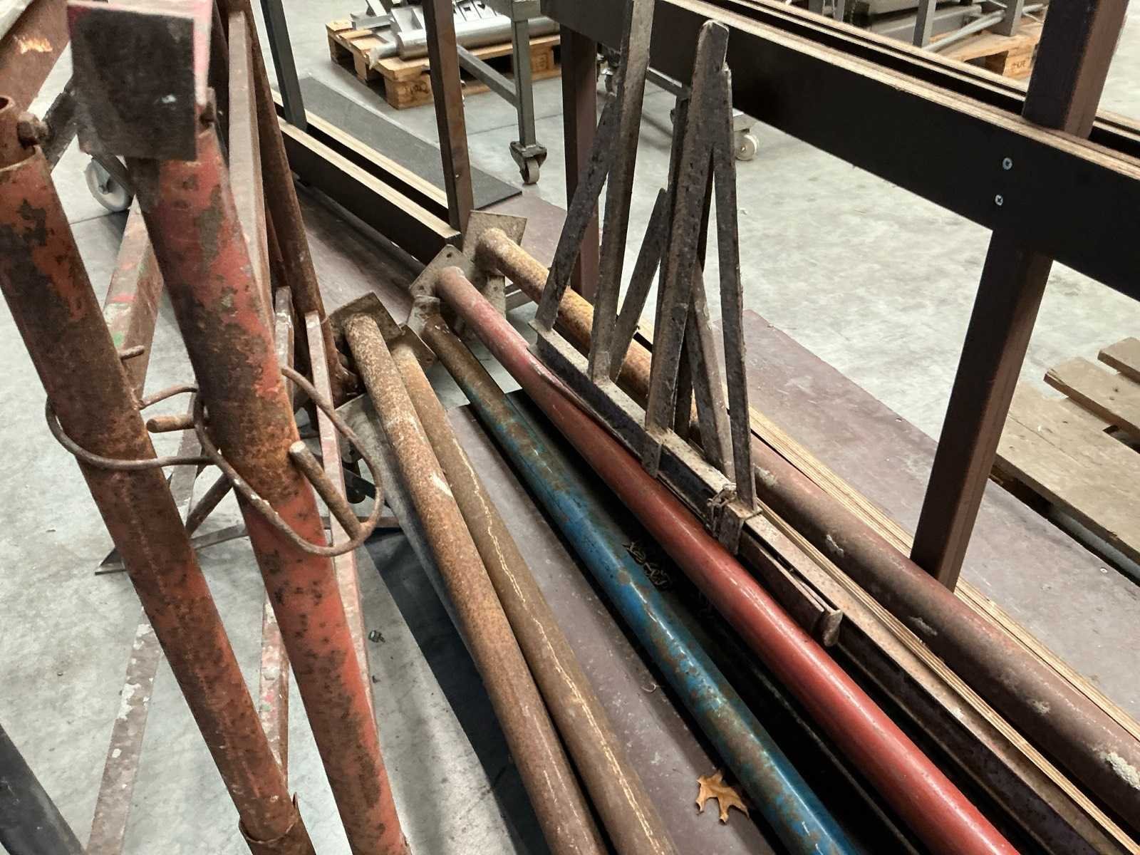 Bestaande uit 3x schragen met afm ca. 115 x 100cm en 7x schoren waaronder met lengte ca. 160cm en 190cm. Compleet met 2x transportkar met afmetingen ca. 160 x 75 x 165cm. Nee