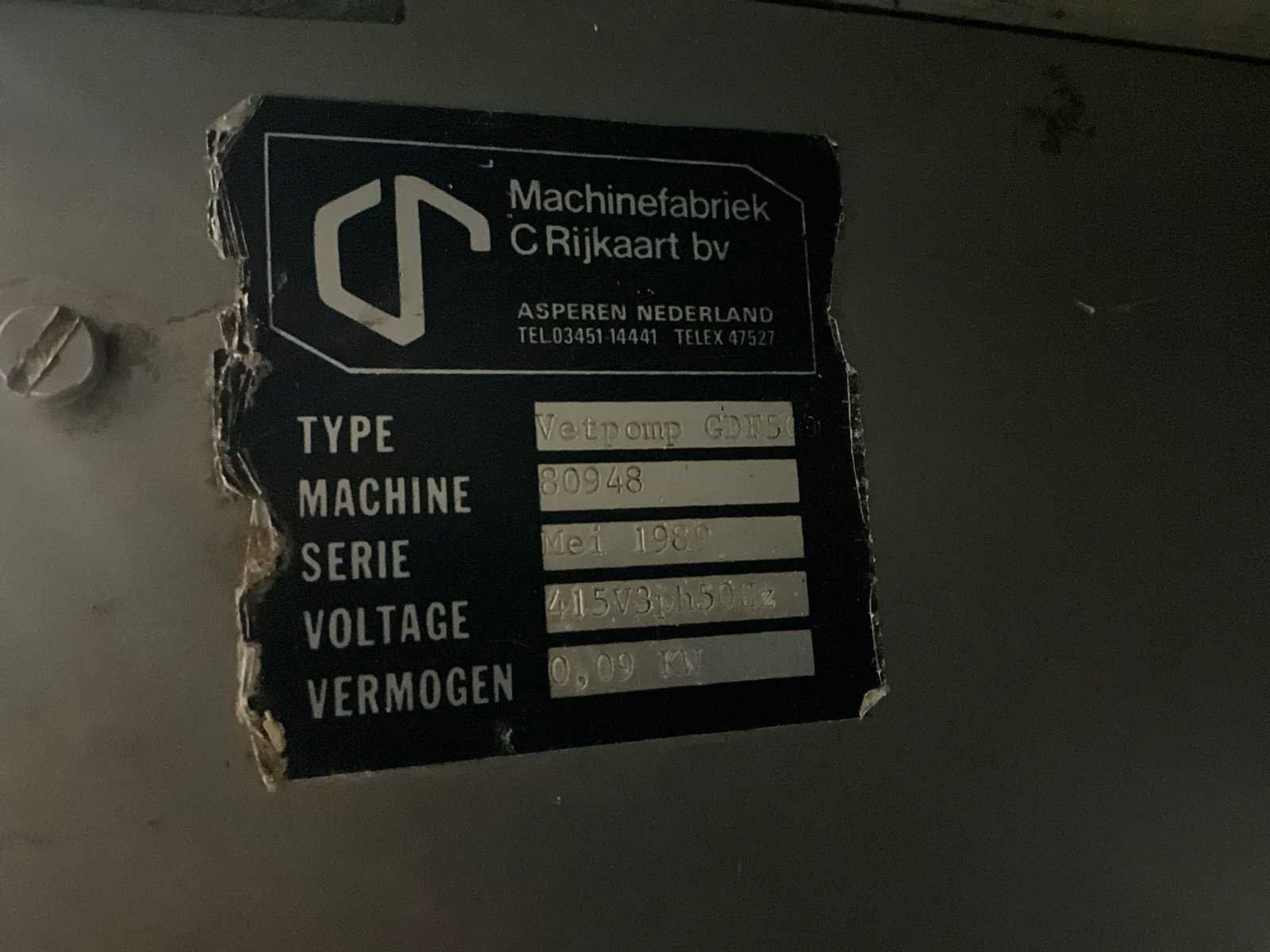Nee Merk: C.Rijkaart Type: Vetpomp GDF500 Bouwjaar: 1989 Totale afmeting L: 1100mm Totale afmeting Breedte: 620mm Totale afmeting Hoogte: 2250mm