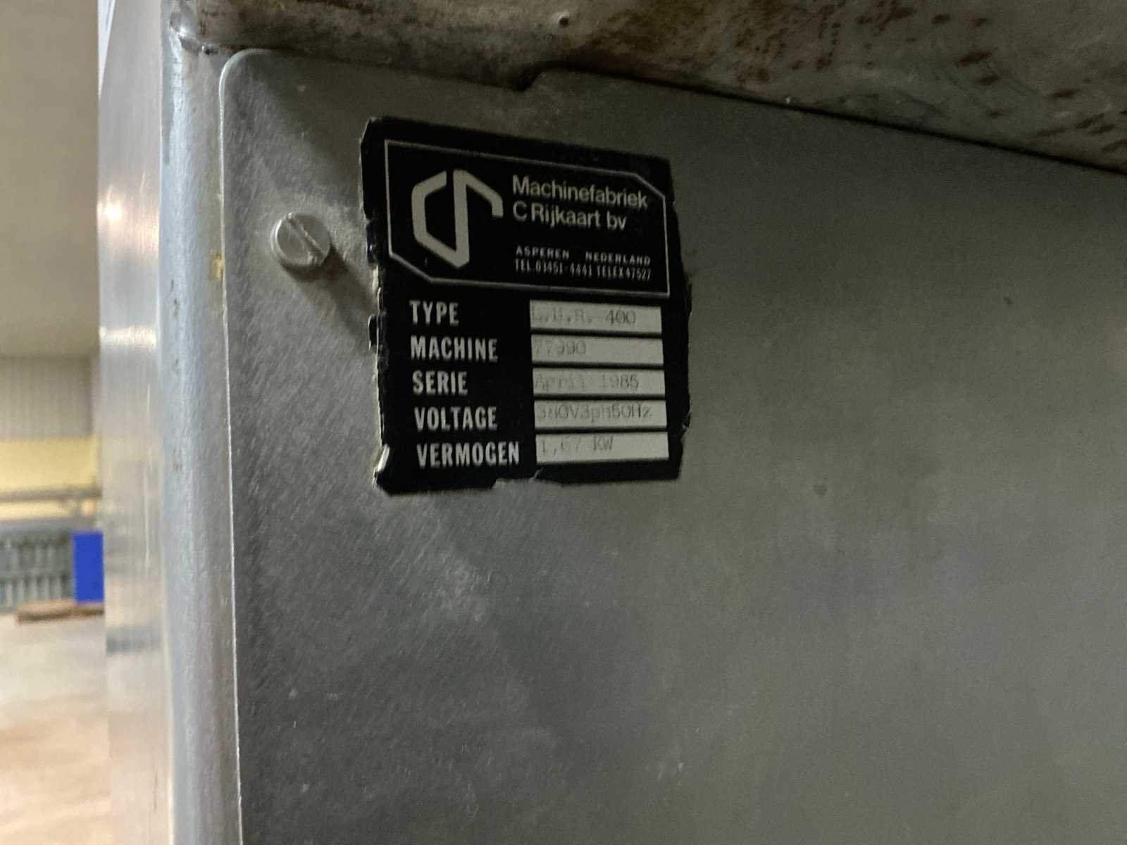Nee Merk: C.Rijkaart Type: L.U.R. 400 77990 Aansluiting: 380V Totale afmeting L: 1100mm Totale afmeting Breedte: 800mm Totale afmeting Hoogte: 1850mm Bouwjaar: 1985