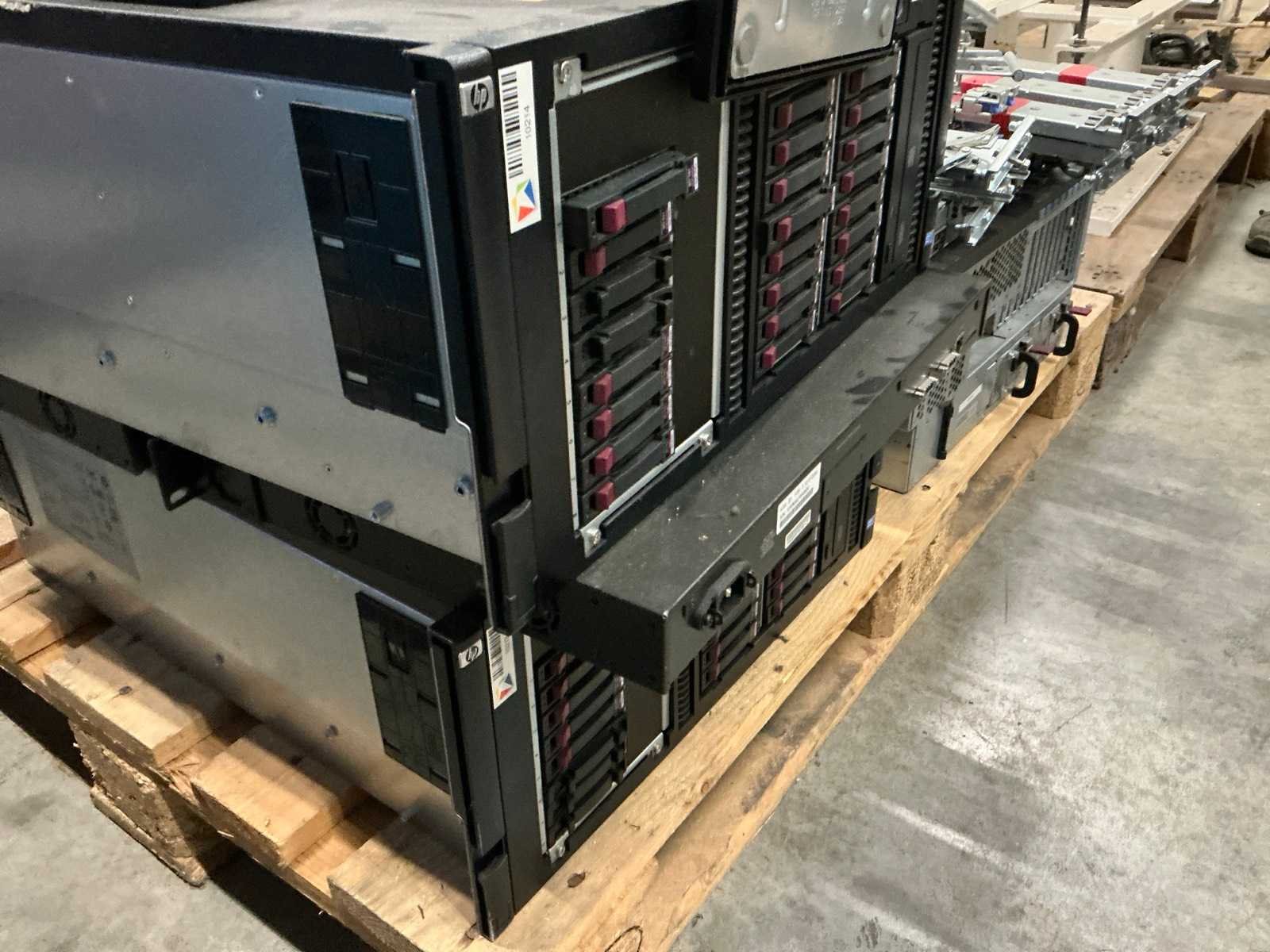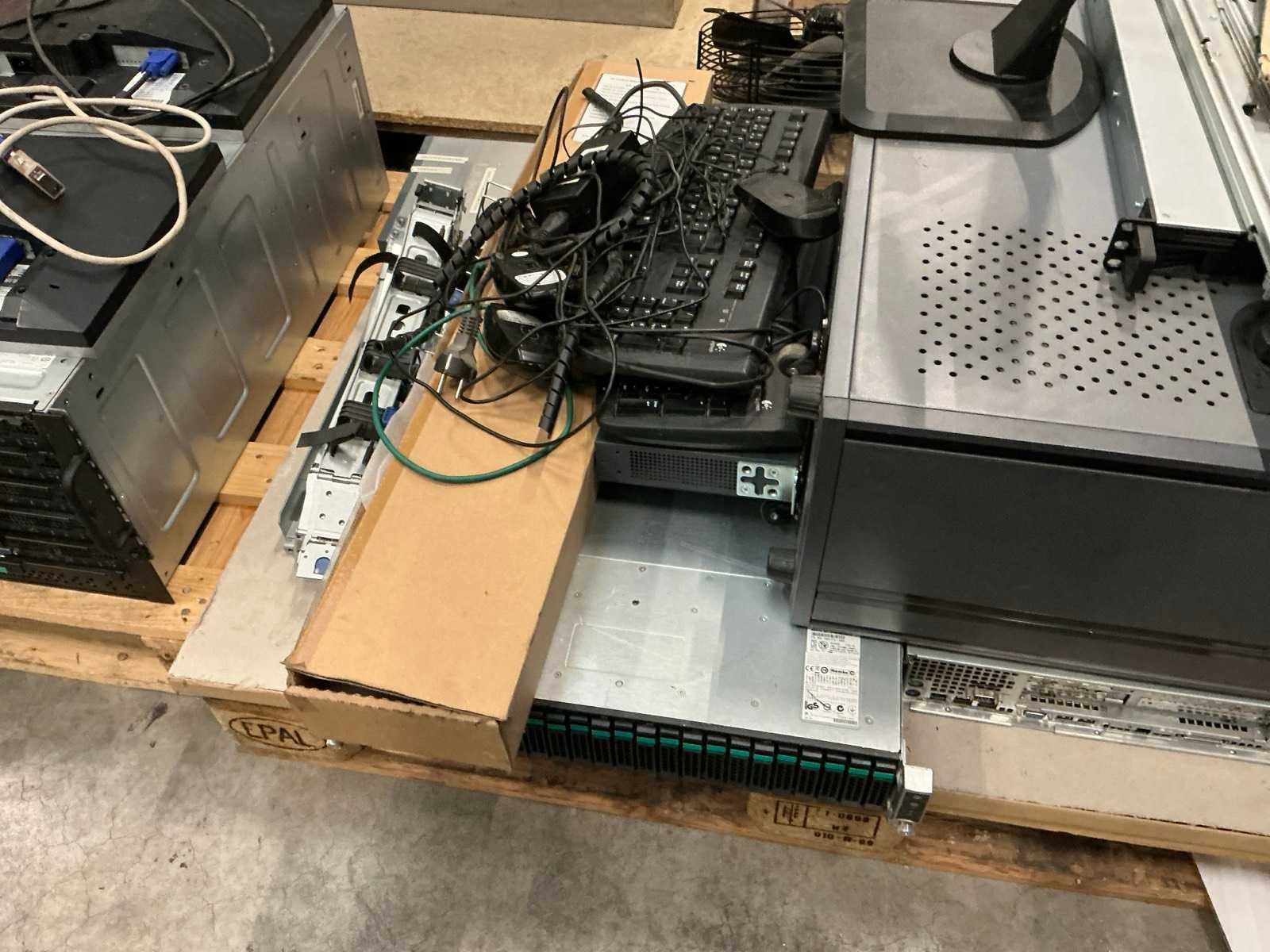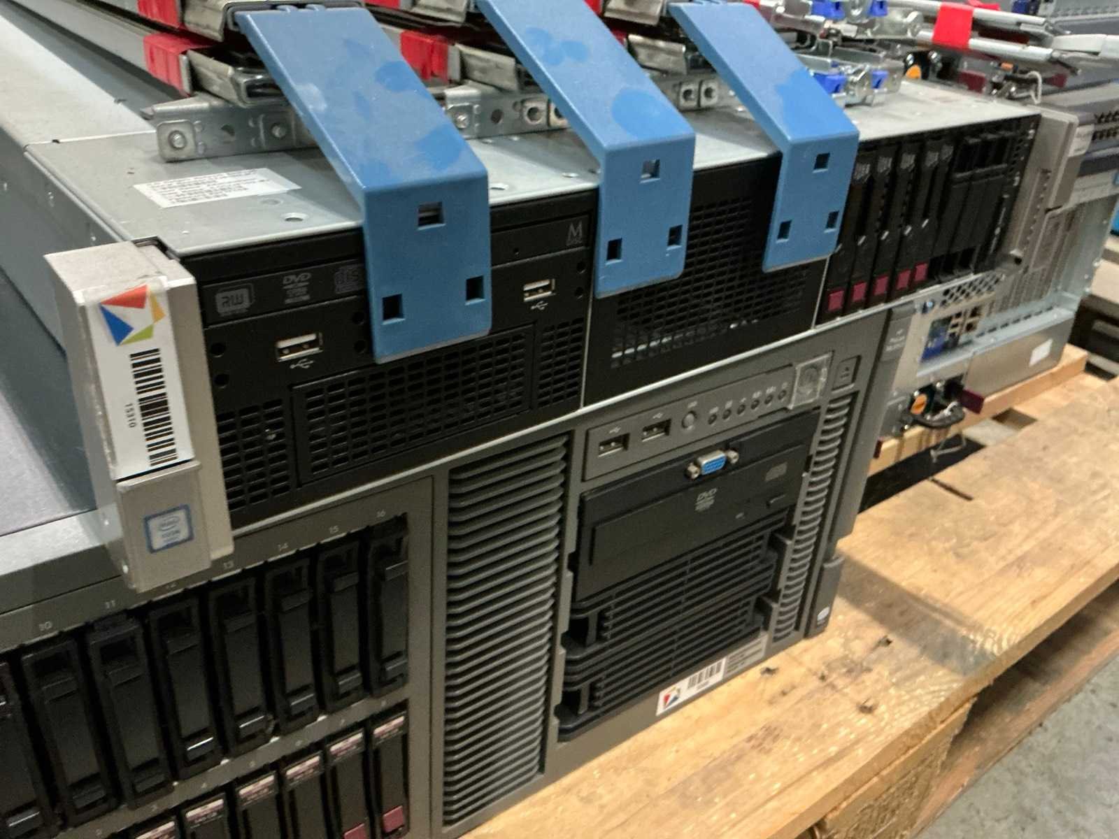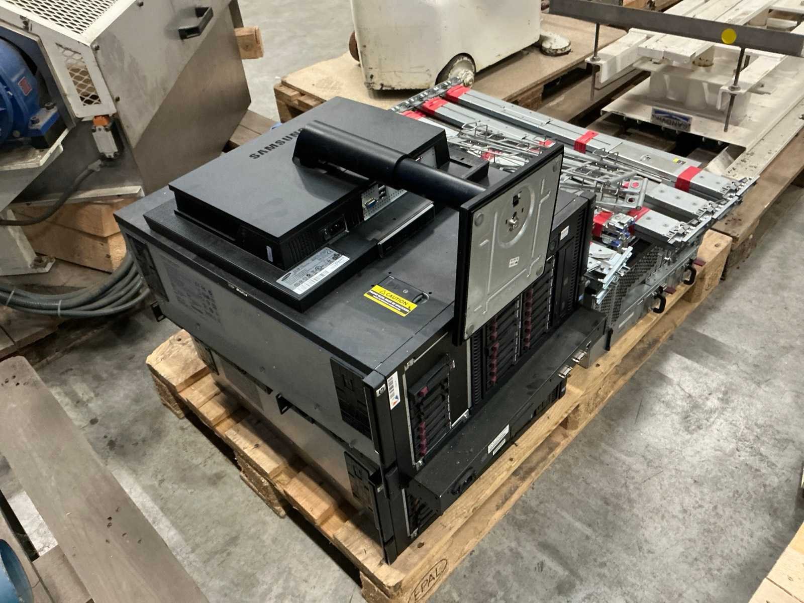 Liggende op 3x pallet waaronder 3x HP PROLIANT ML350 SAMSUNG, computercase, diverse monitors, switch D-Link,.. alle harde schijven verwijderd. Nee